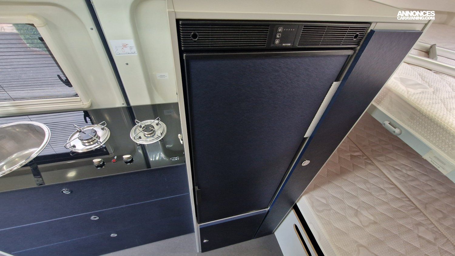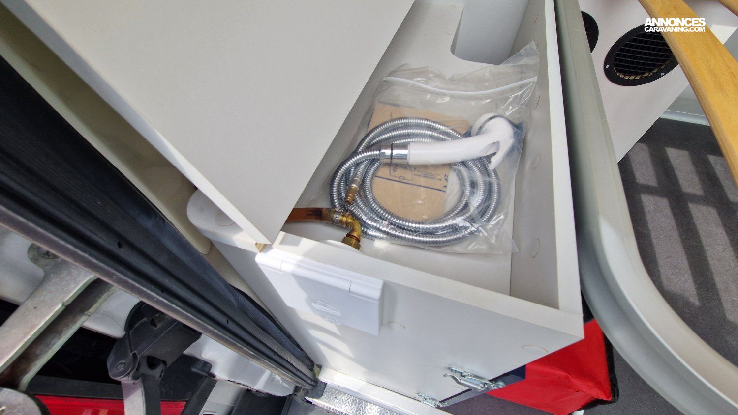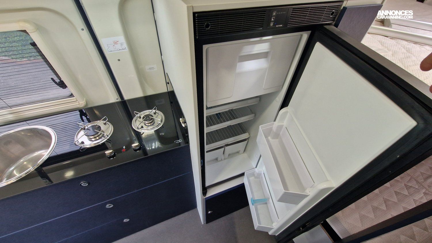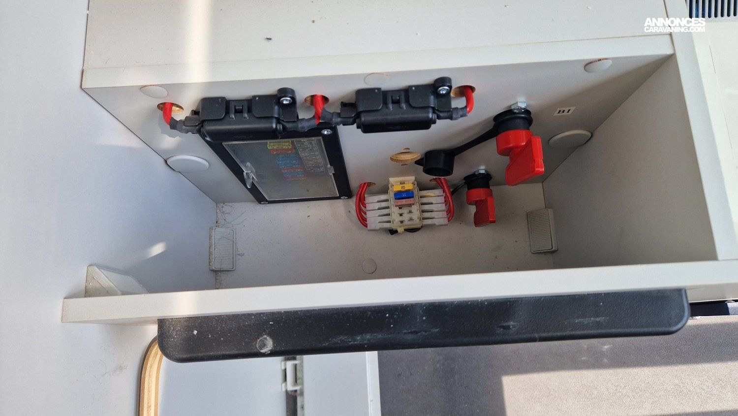 CHAUFFAGE CARBURANT, STORE EXTERIEUR 3.5M, GAZINIERE 2 FEUX, DOUCHETTE DANS SOUTE, VOLET ISOTHERME INTERIEUR, VOLET EXTERIEUR ISOTHERME, REFRIGERATEUR 12V A COMPRESSION