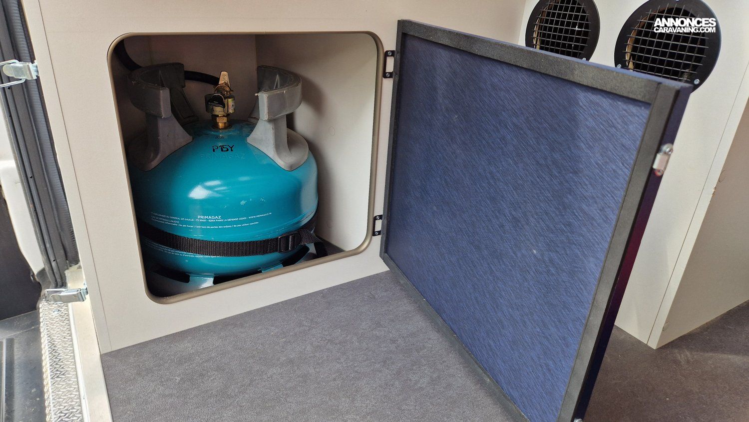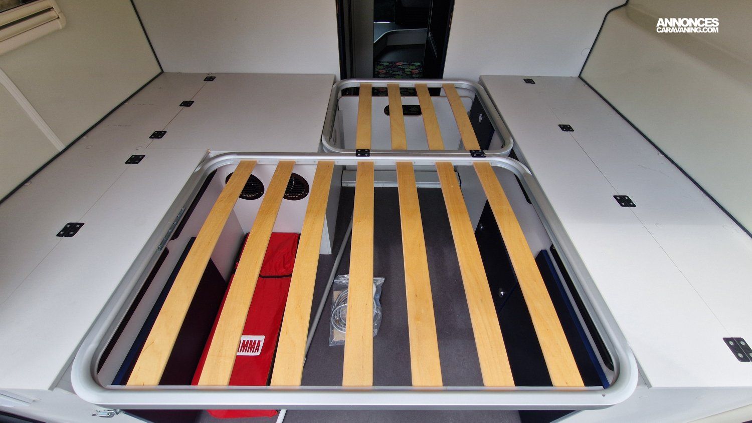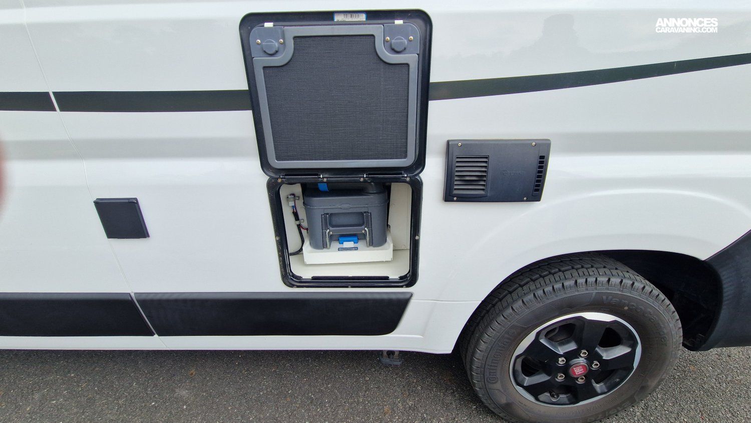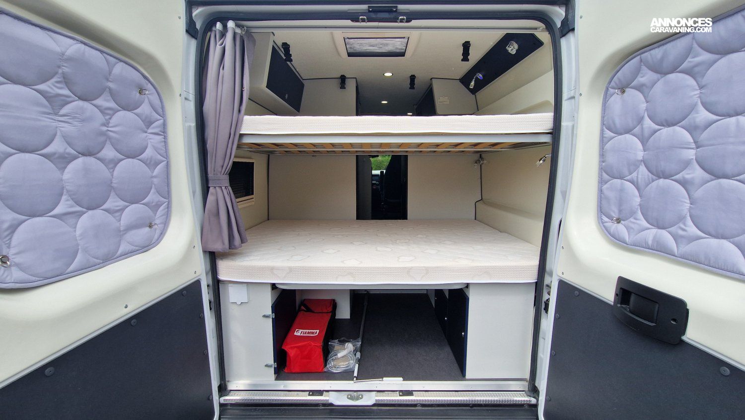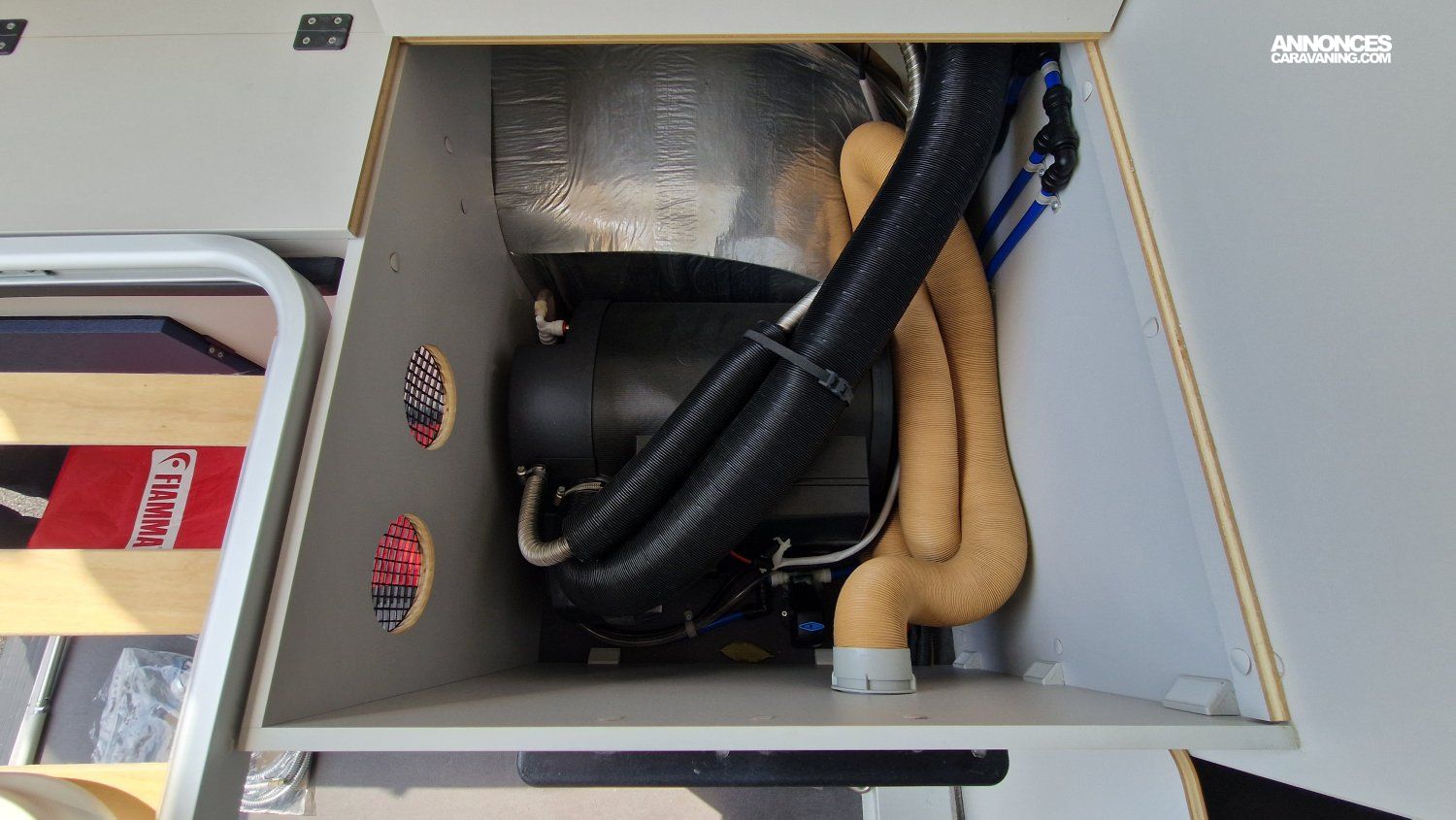 CHAUFFAGE CARBURANT, STORE EXTERIEUR 3.5M, GAZINIERE 2 FEUX, DOUCHETTE DANS SOUTE, VOLET ISOTHERME INTERIEUR, VOLET EXTERIEUR ISOTHERME, REFRIGERATEUR 12V A COMPRESSION