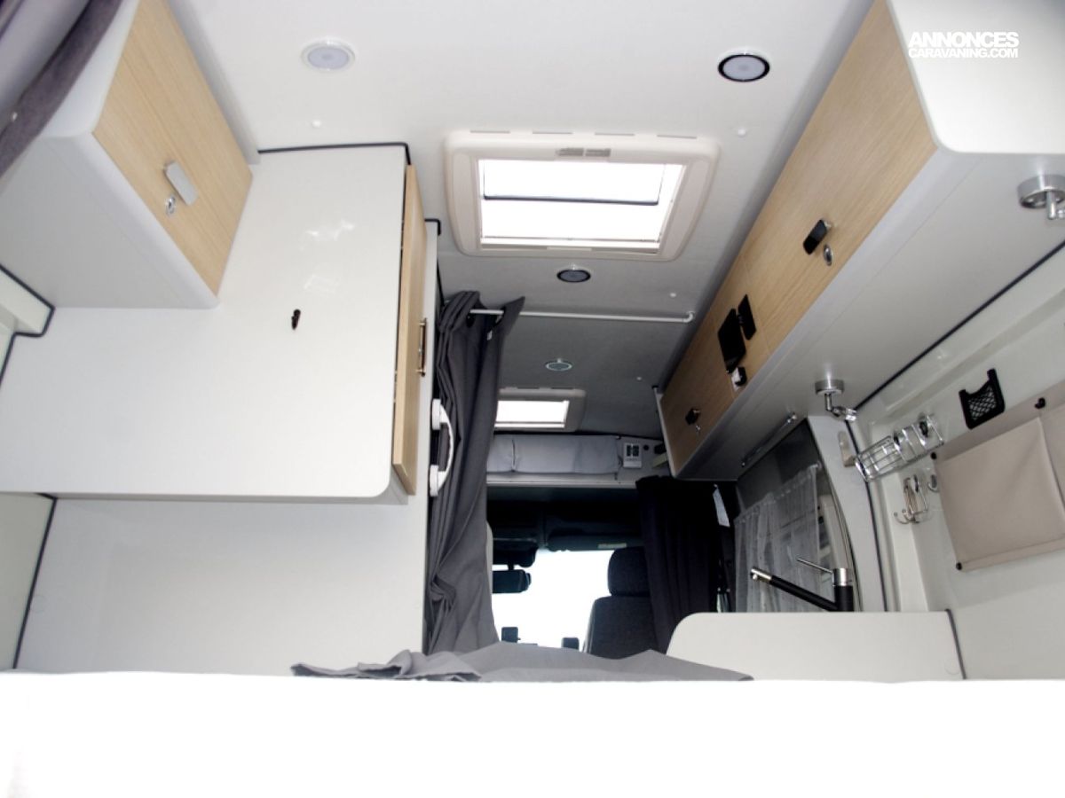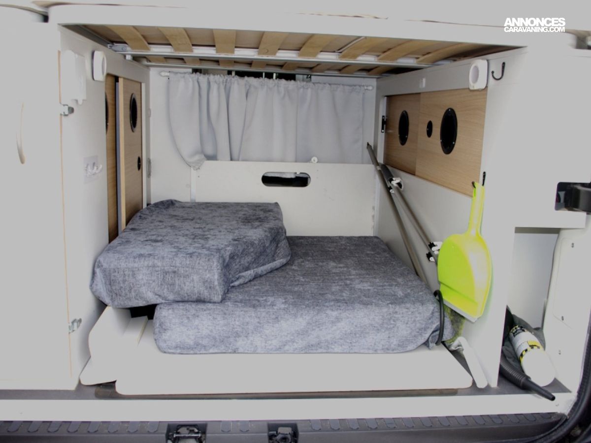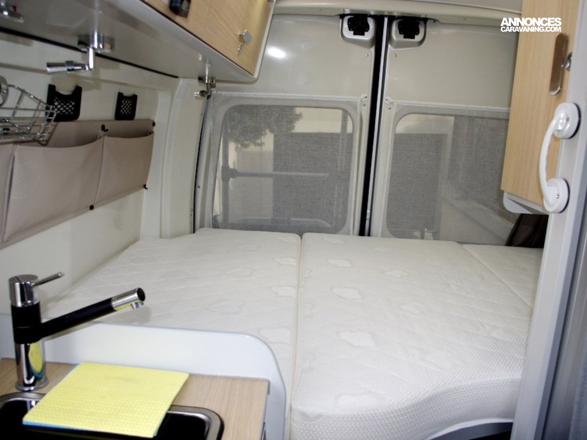 -1 couchage 2 personnes lit arrière 191 cm x136 cm avec sommier alu à lattes, literie Bultex et un couchage avant 1 personne 175 cm x 106 cm à partir de la banquette isofix arrière avec matelas Bultex,