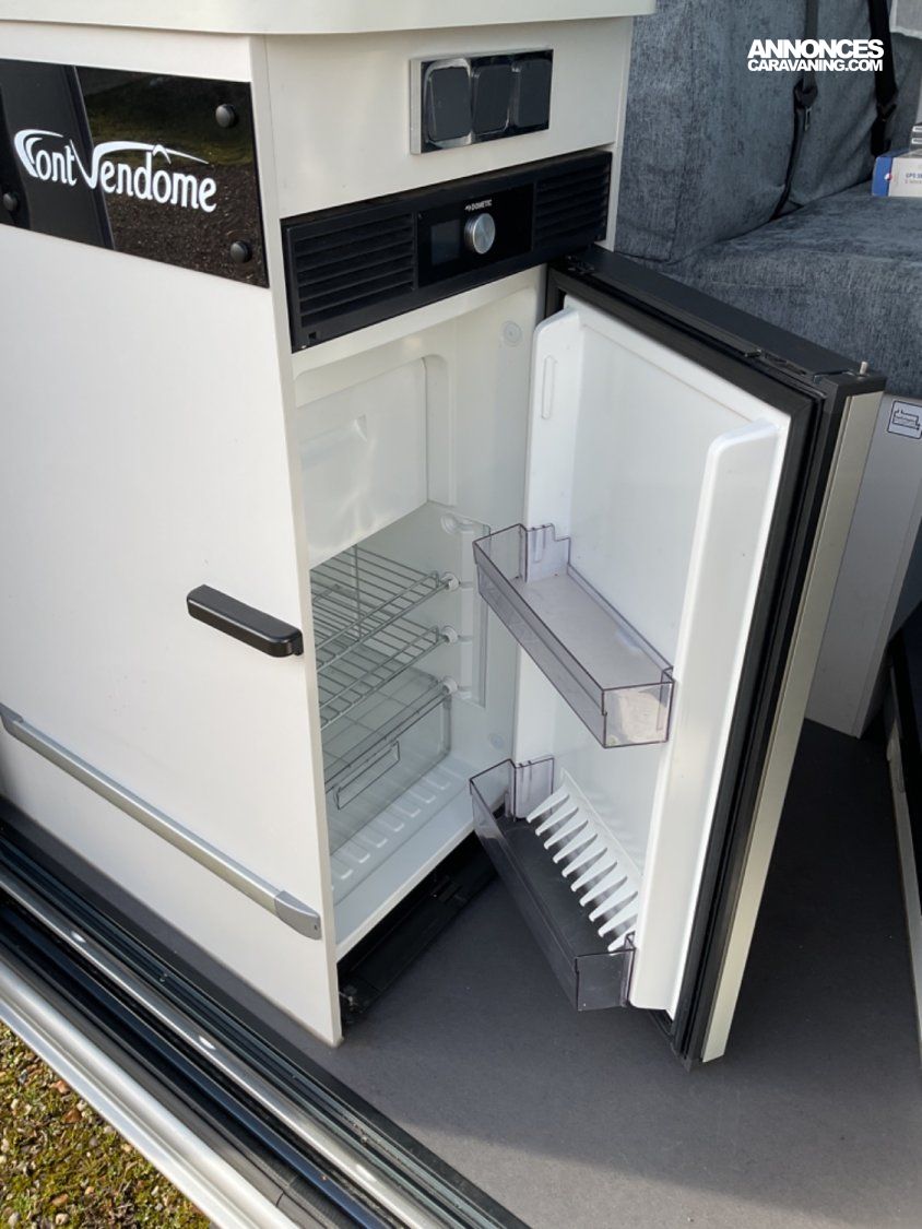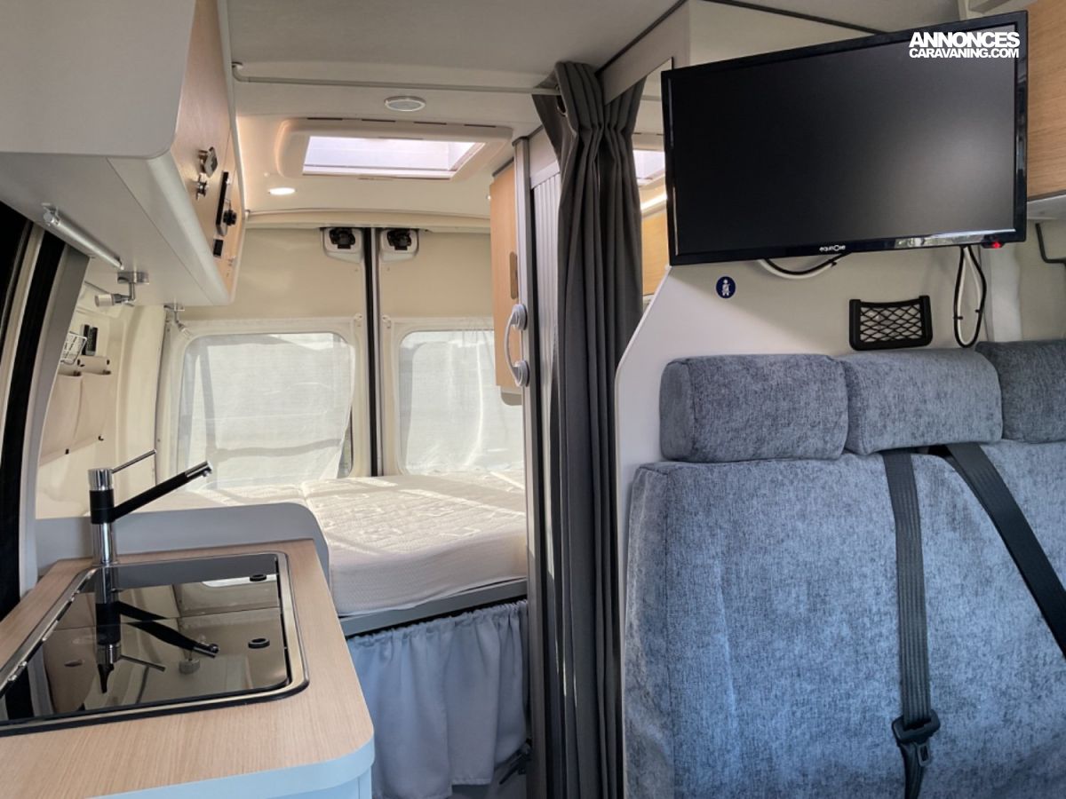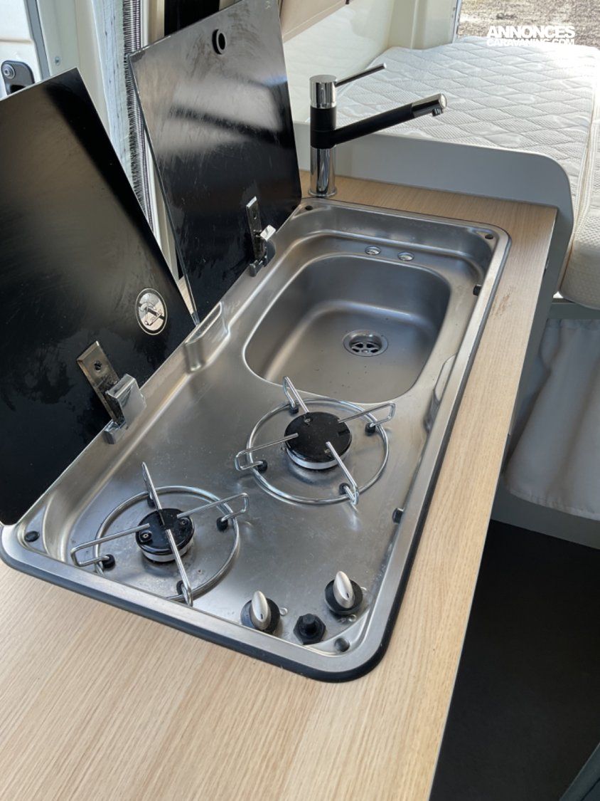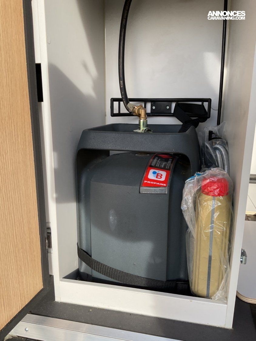 CELLULE: Frigo+freezer à compression 70l., Lanterneaux, Foyers Cuisson(2) gaz, Marche-pied élec., Batterie Lithium 100W, Combiné 4 Truma Chauffage + Chauffe-eau Gasoil, Salle de bain modulable, Sièges AVD/AVG pivotants, Moustiquaire de porte, Télévision écran plat, 1 Bttle de gaz Propane 13Kg.