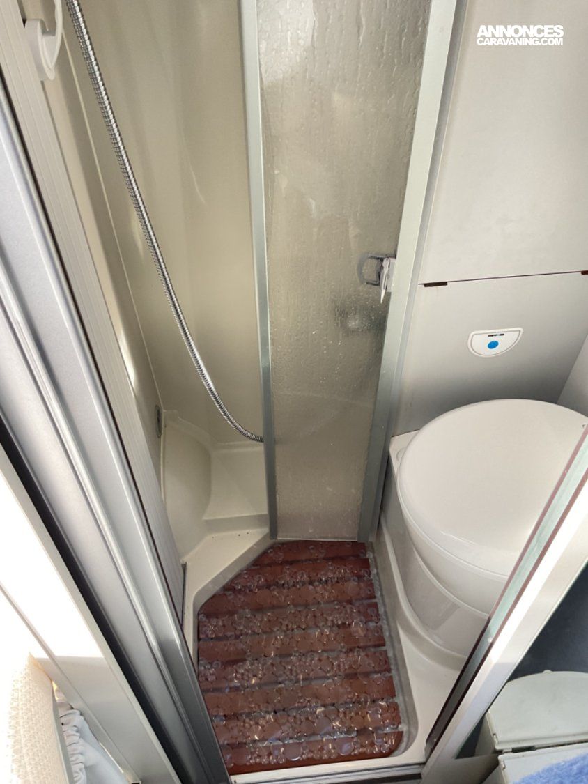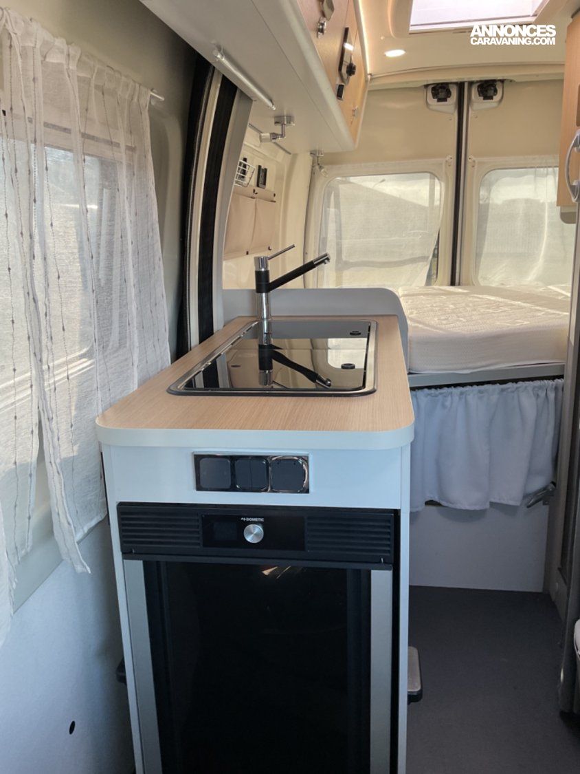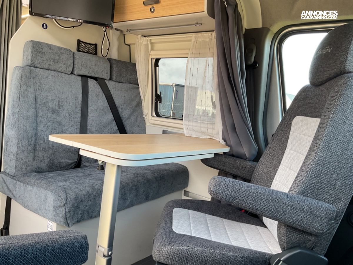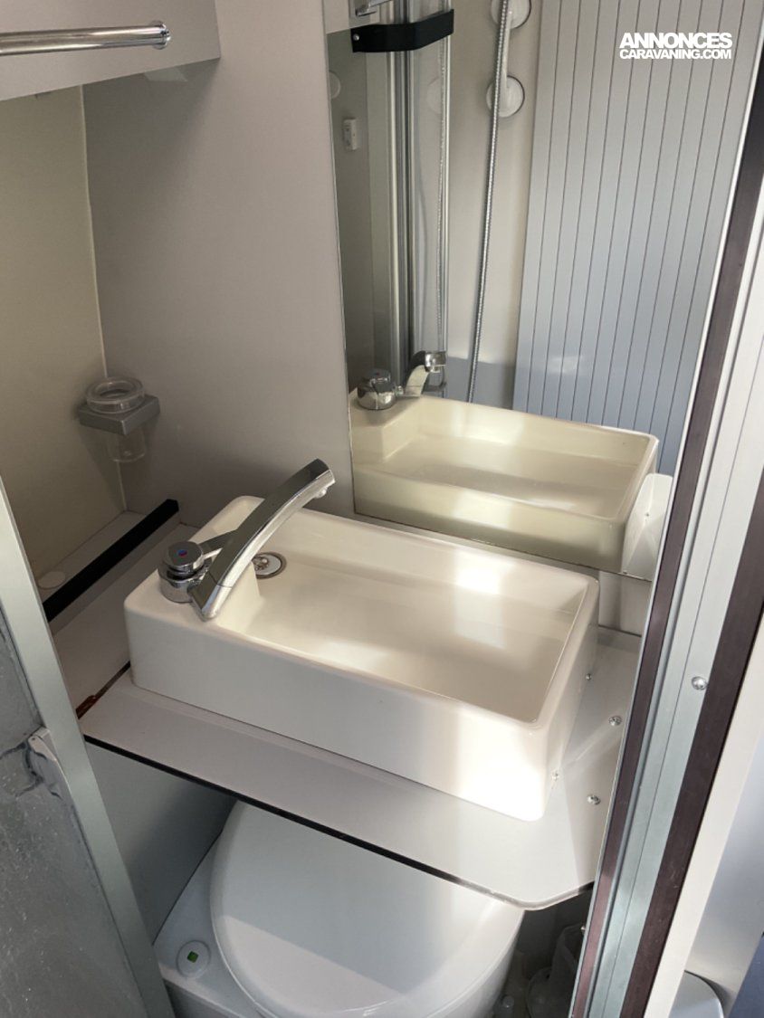 CELLULE: Frigo+freezer à compression 70l., Lanterneaux, Foyers Cuisson(2) gaz, Marche-pied élec., Batterie Lithium 100W, Combiné 4 Truma Chauffage + Chauffe-eau Gasoil, Salle de bain modulable, Sièges AVD/AVG pivotants, Moustiquaire de porte, Télévision écran plat, 1 Bttle de gaz Propane 13Kg.