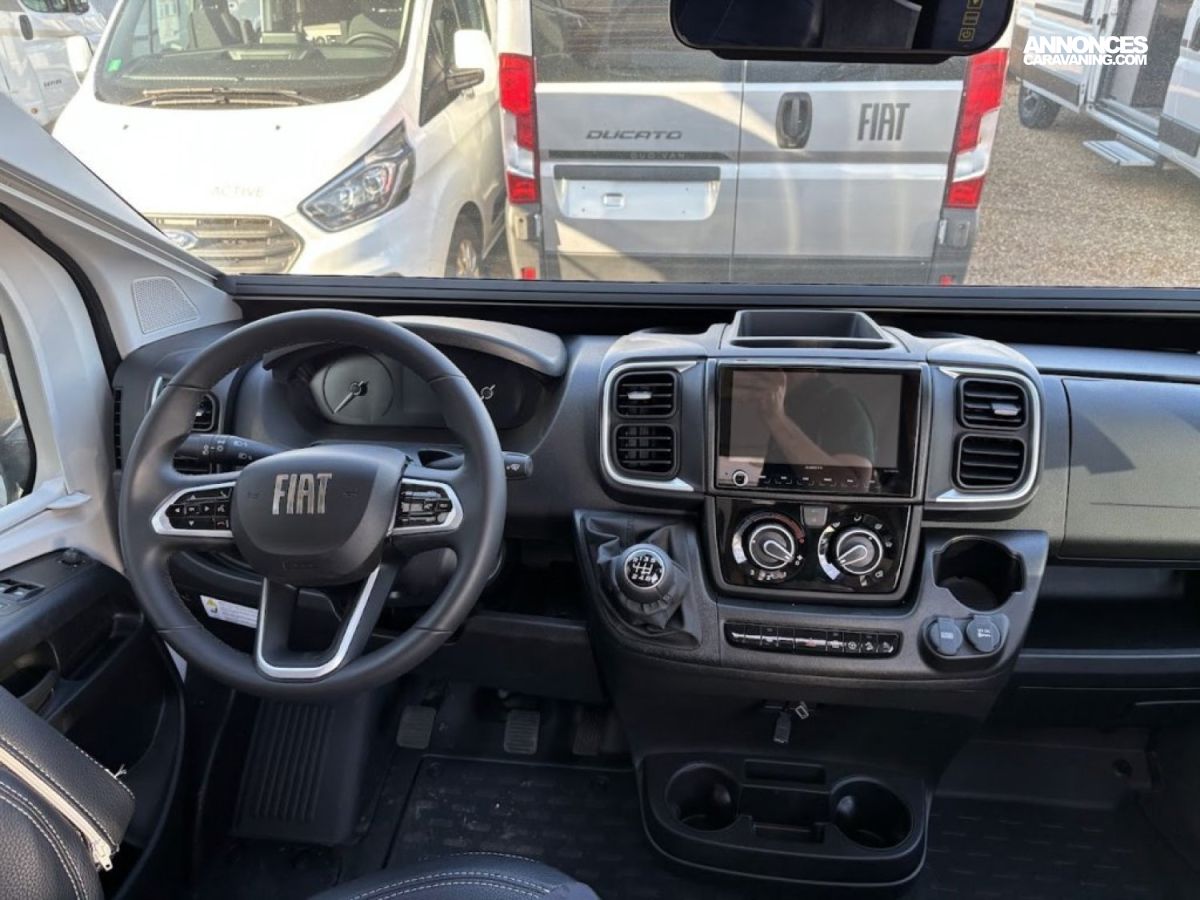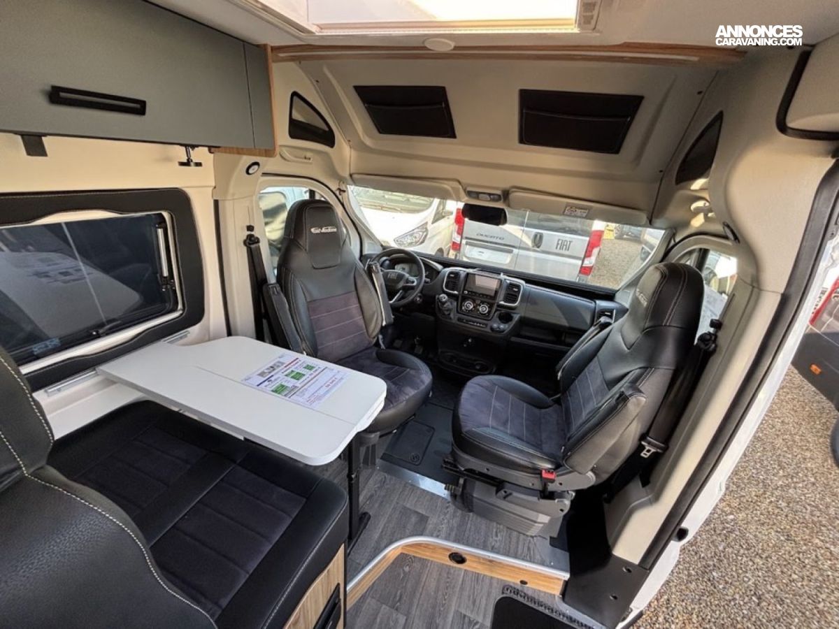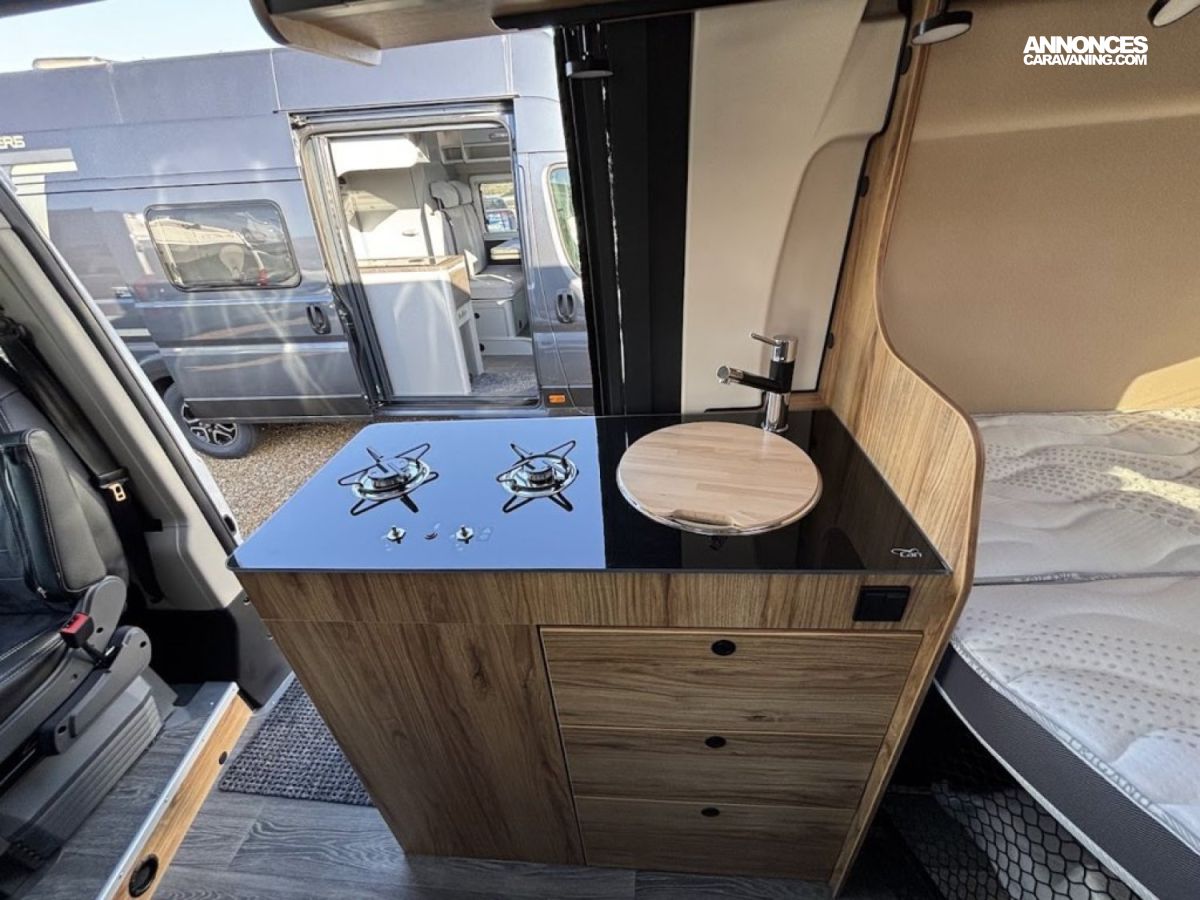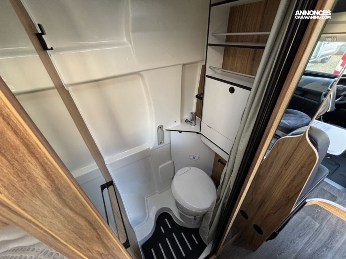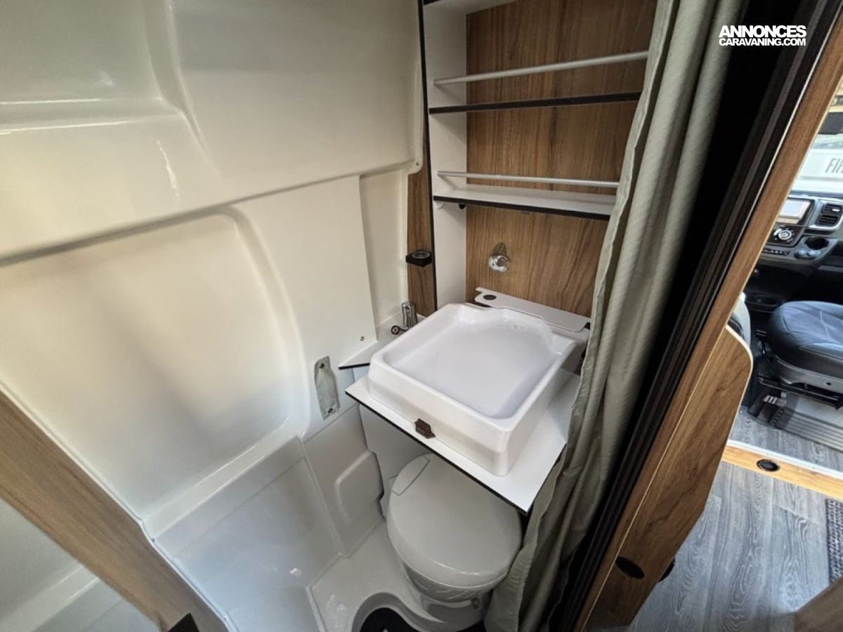 Bac de douche, Cuisine en long, Salon avant sièges pivotants, WC Cassette.