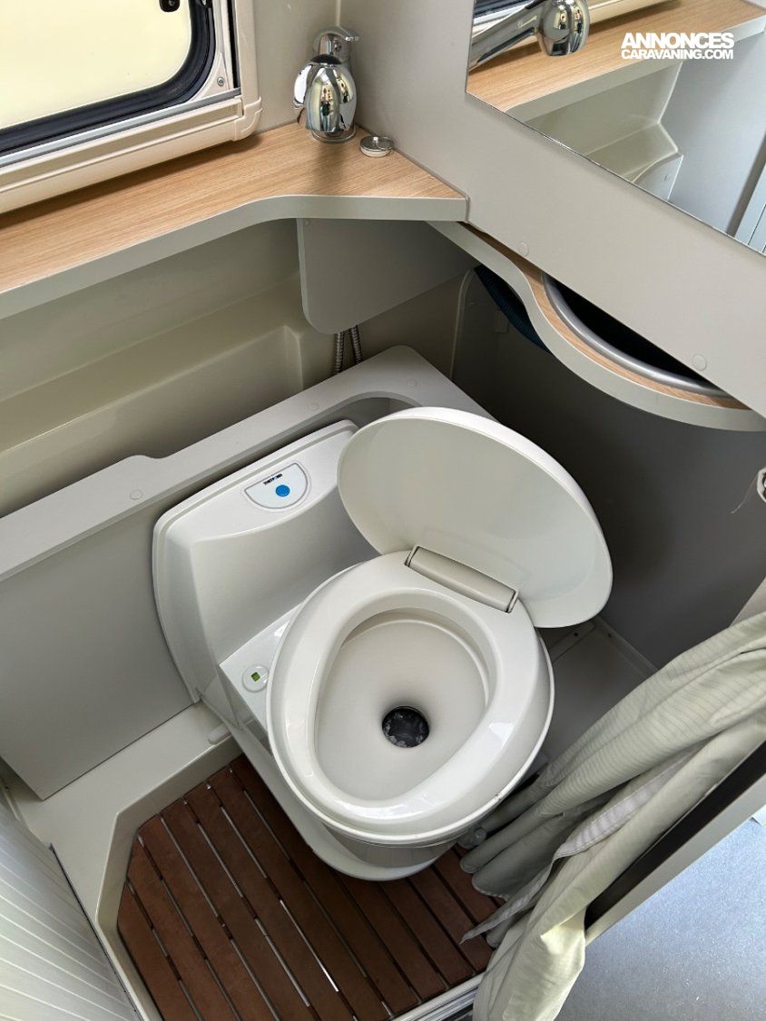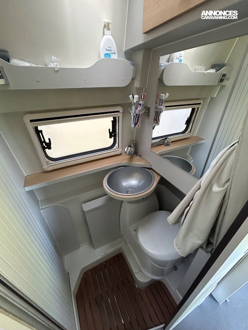 Salle d'eau équipé d'un toilette avec cassette, lavabo et douche, pratique à l'utilisation.