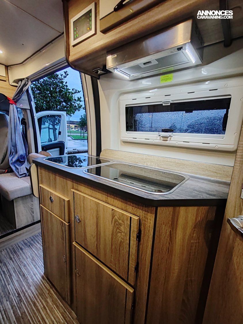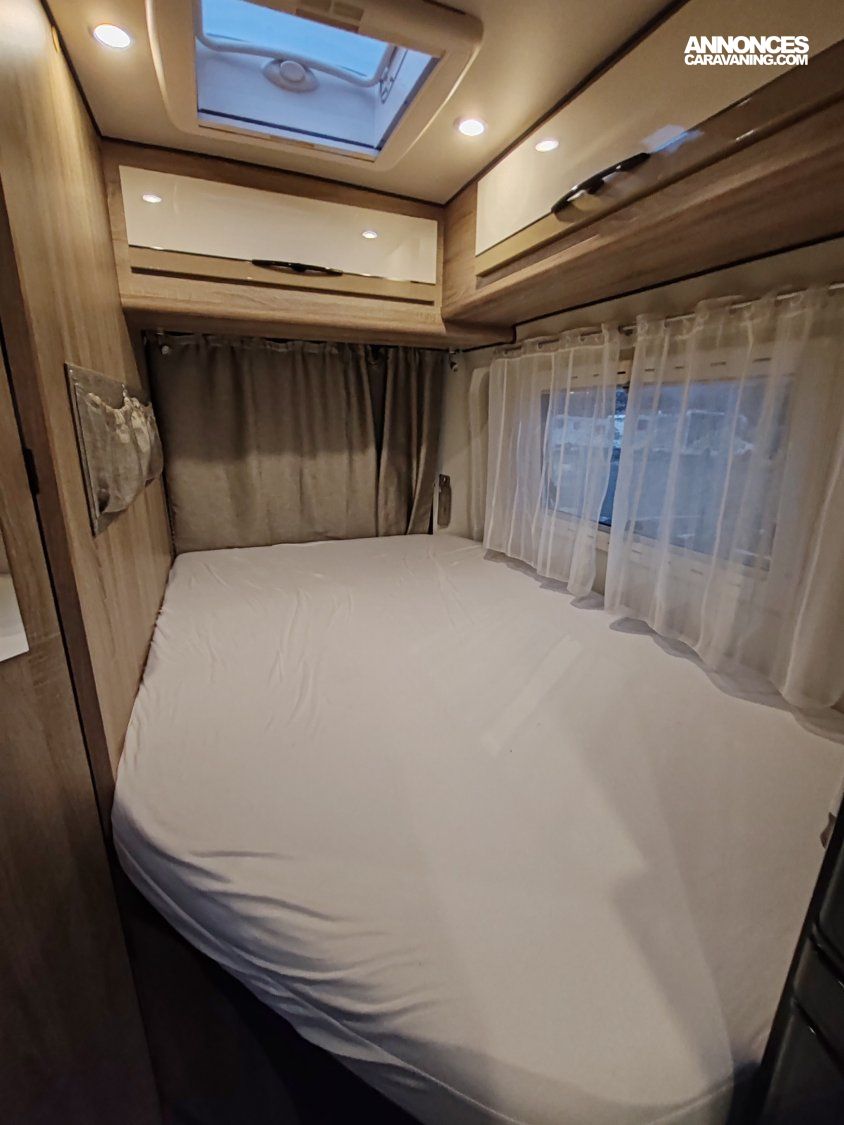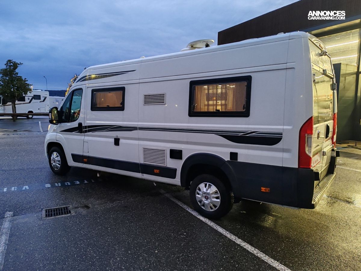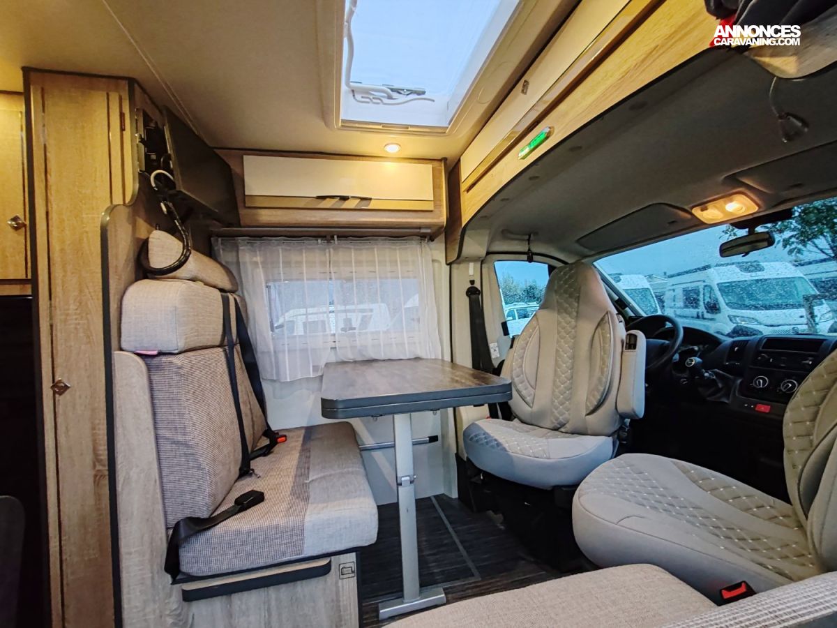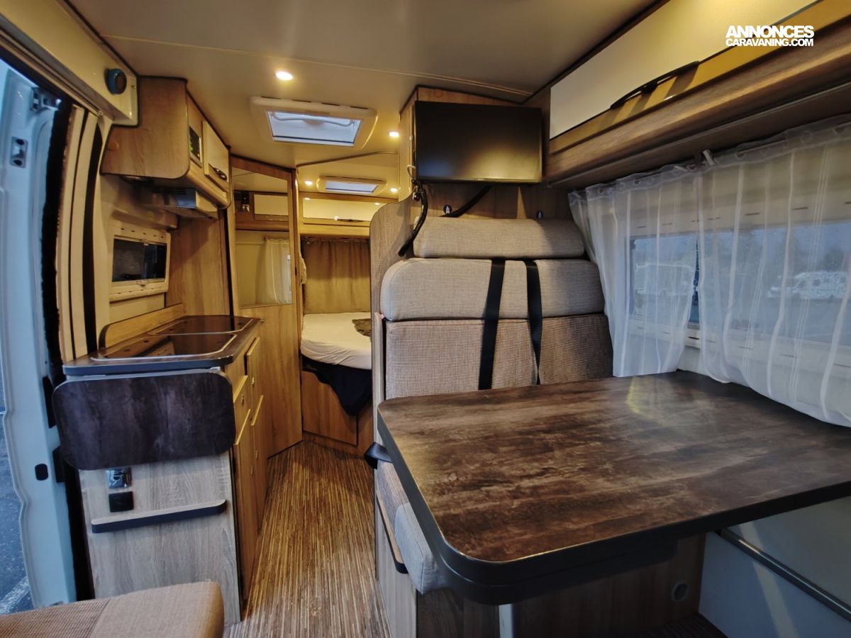 Store extérieur, Panneau solaire, Verrins stabilisateur hydrauliques, Coussins pneumatiques, Roue de secours, Moustiquaire porte cellule, Chauffage Carburant, Antenne sat manuelle, TV, Lit permanent arrière (192 x 130 cm), Lit de banquette (188 x 121 cm), Réfrigérateur 150 litres Trimixte, Hotte aspirante, Batterie Lithium 100A, Convertisseur 2000w, Marche pied electrique