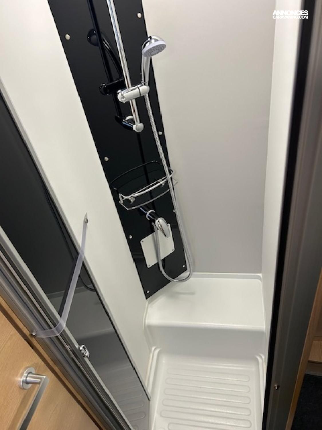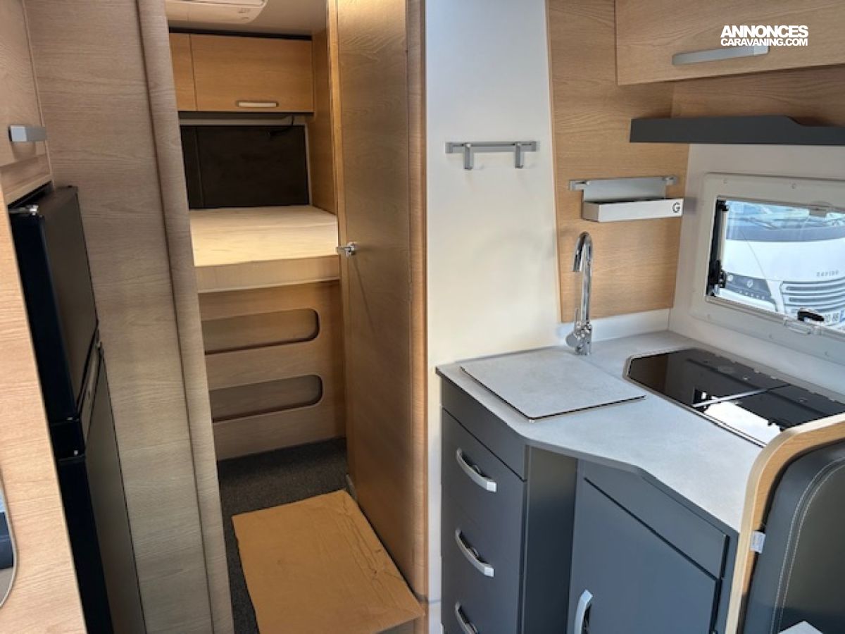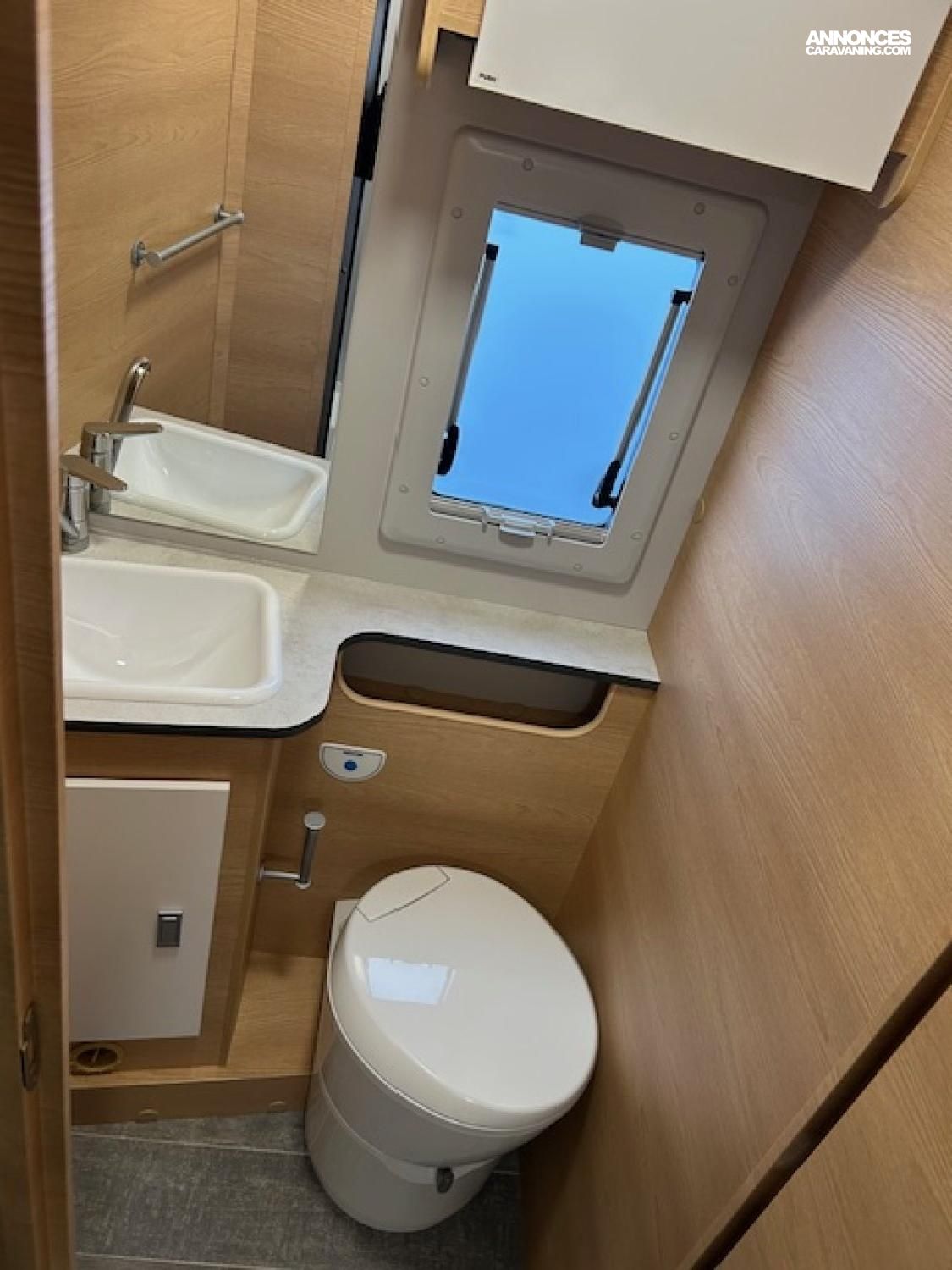 Porte cellule vitrée avec 2 points de fermeture et centralisée - caméra de recul - façade arrière-« style » avec feux Led - Sellerie elba - Maxi lanterneau Sky Wiew - Climatisation cabine - ESP avec aide à la montée/descente, - Traction + - régulateur de vitesse - 2 Airbags - pré-équipement radio - Suspensions AR renforcées - Housses sur sièges cabine - Eaux usées chauffées - Moustiquaire porte cellule - Sommier à lattes - Pare-chocs peint - éclairage extérieur LED - commande Truma 4000CP+ Radio 6.8“ - Duo control - rideaux occultant cabine - Tapis cabine et cellule - Jantes alu 16’