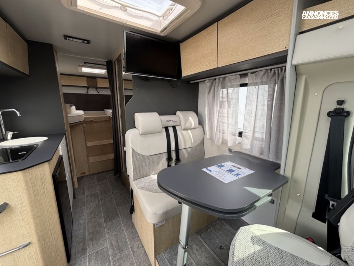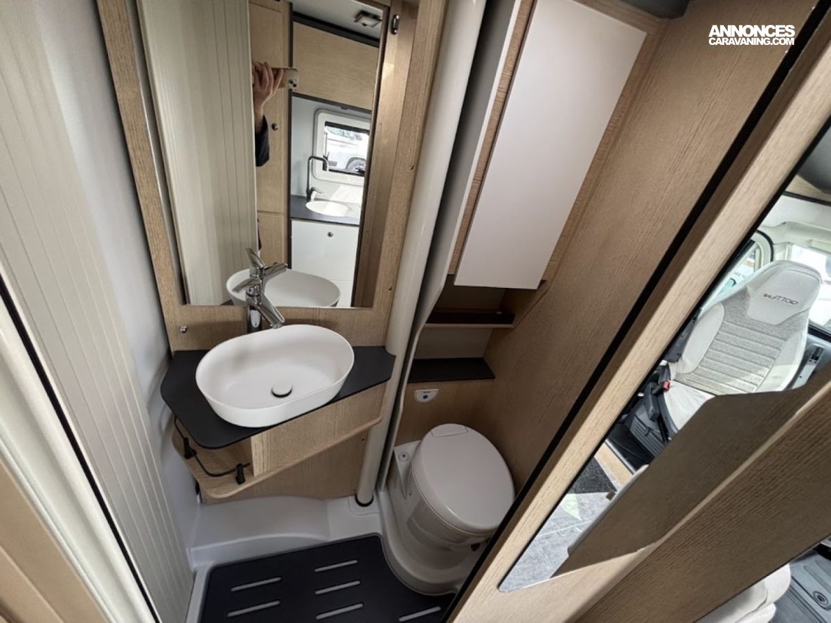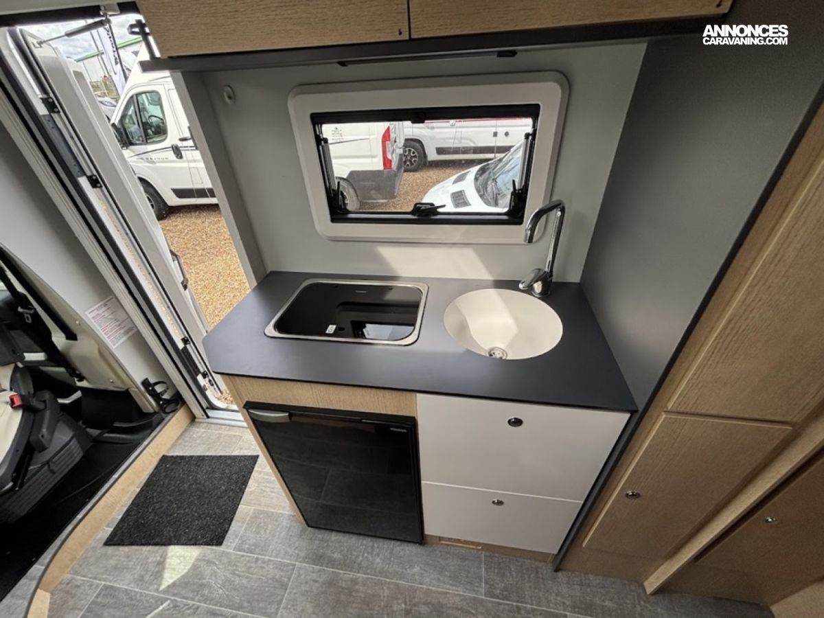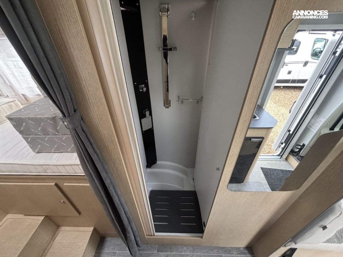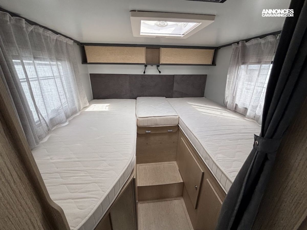Cuisine en long, Douche à vario, Grande soute, Lit dînette avant, lit jumeaux, Salon avant sièges pivotants, WC Cassette.