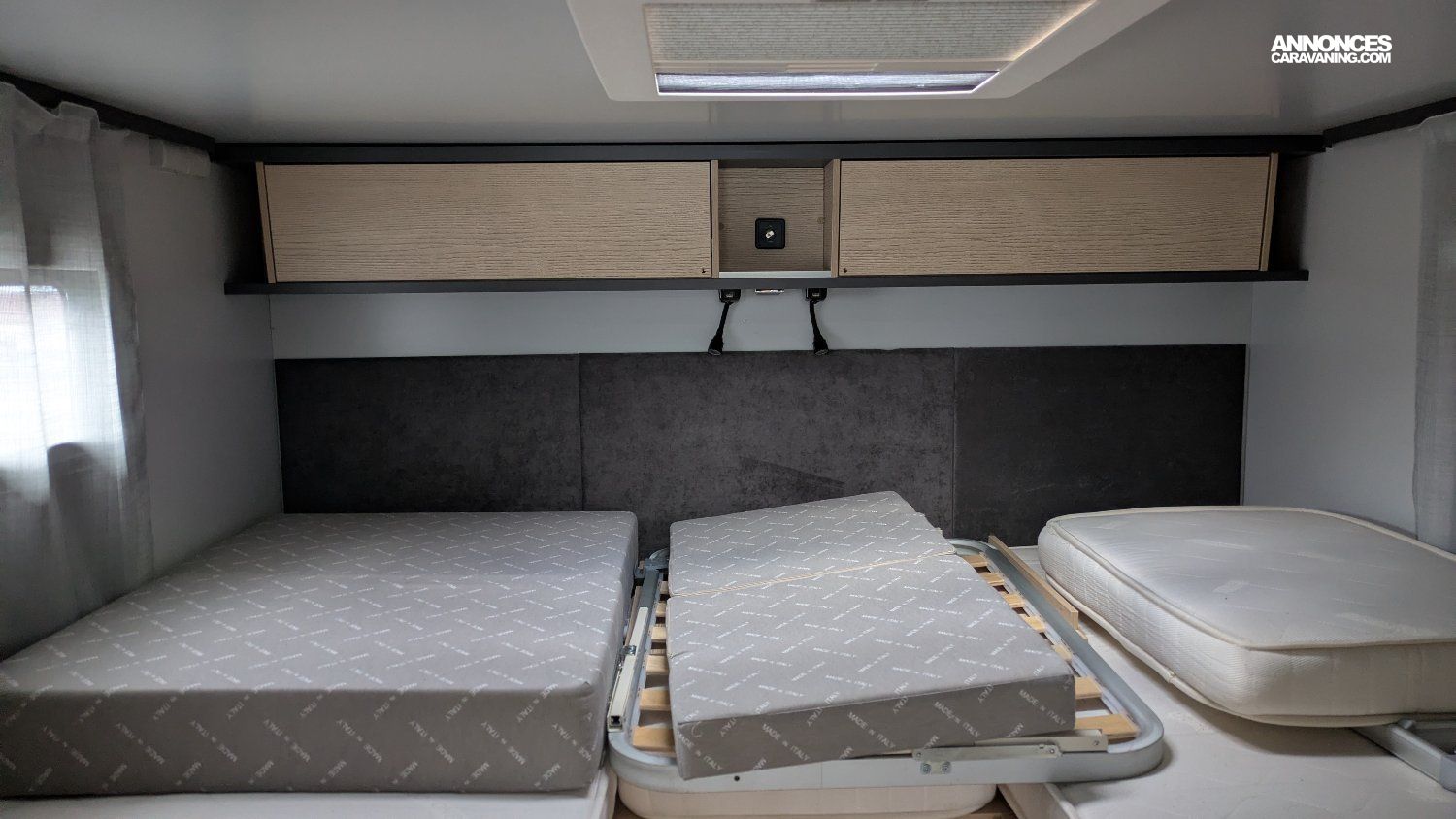Couchages : lits jumeaux (193 x 77 cm et 193 x 74/53 cm), lit de pavillon optionnel
