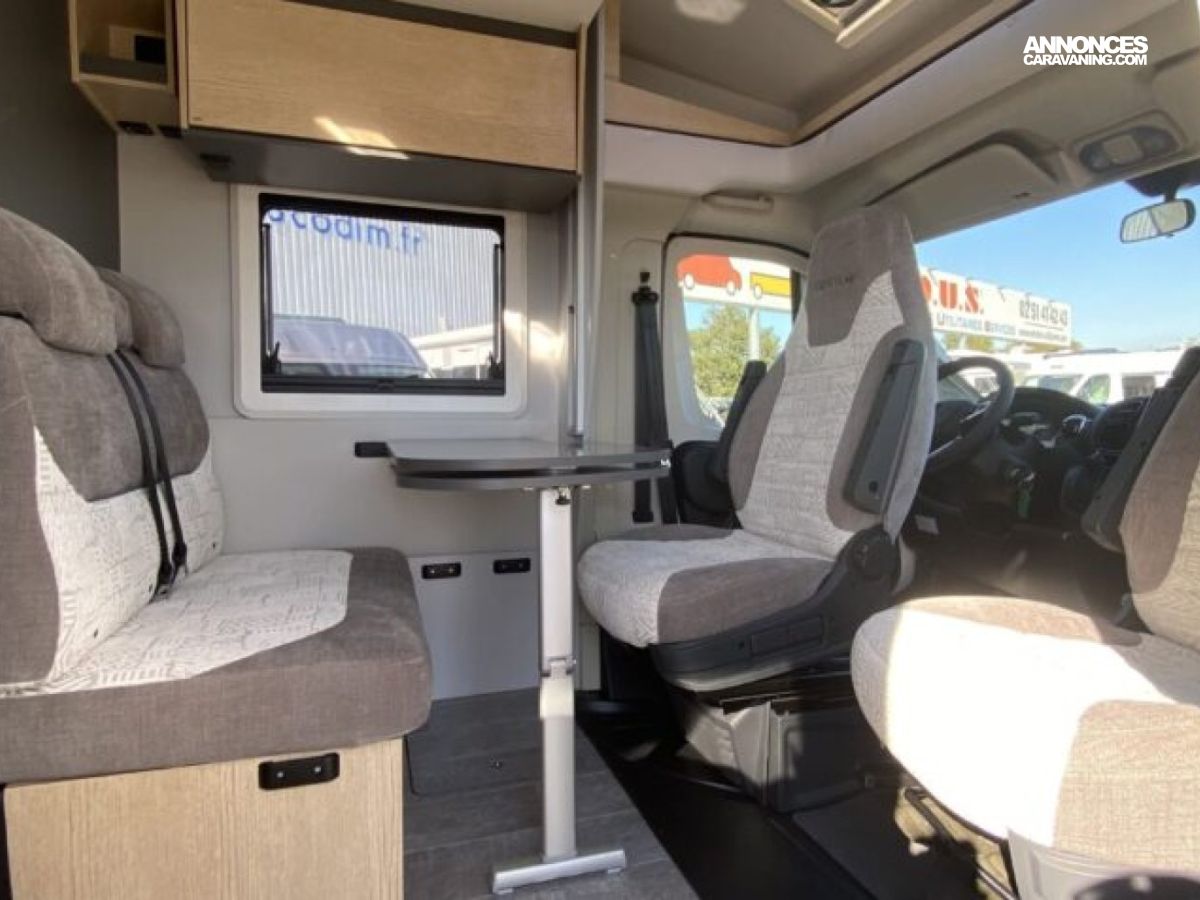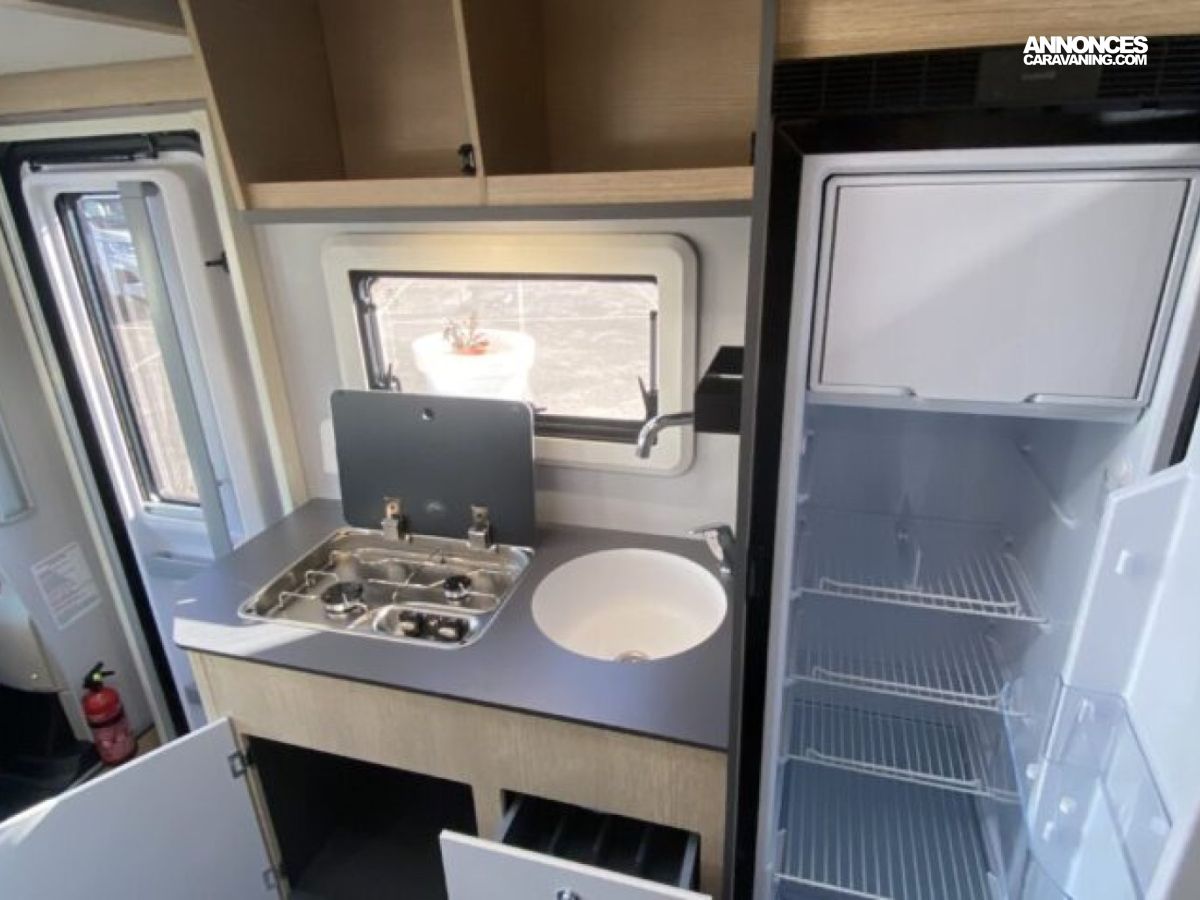 Son agencement compact intègre un lit transversal et un lit pavillon d’une personne, une salle d’eau modulable et un grand volume de rangement.