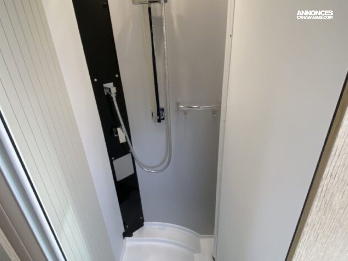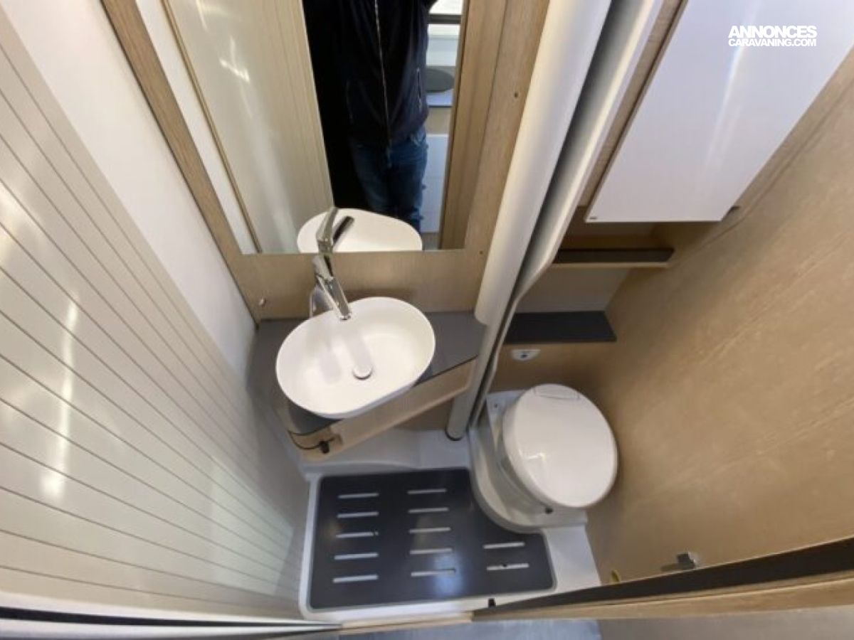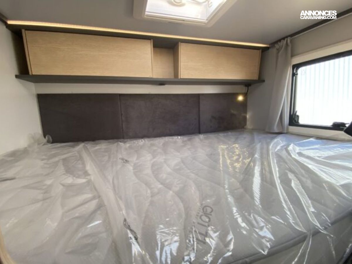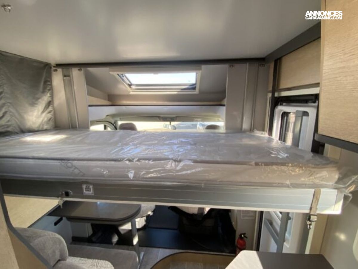 Son agencement compact intègre un lit transversal et un lit pavillon d’une personne, une salle d’eau modulable et un grand volume de rangement.
