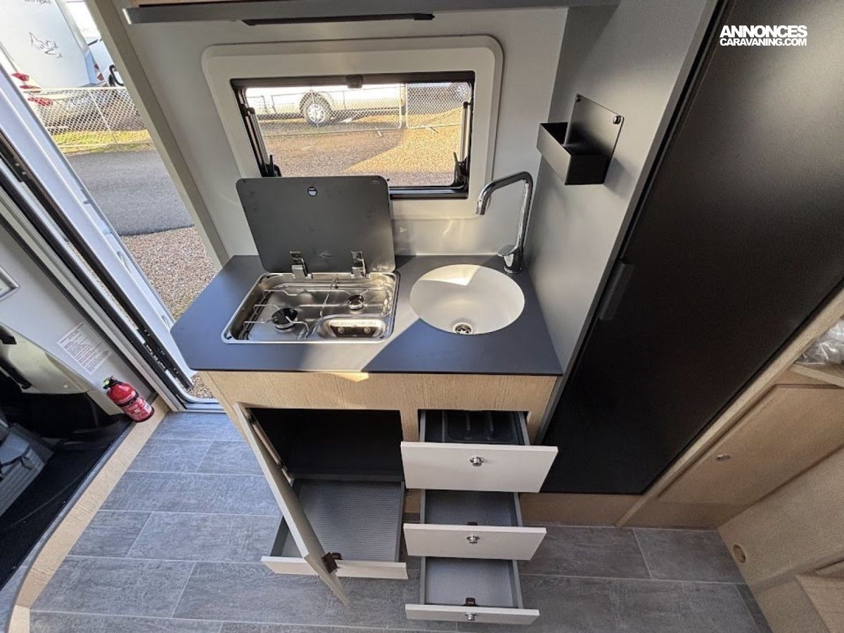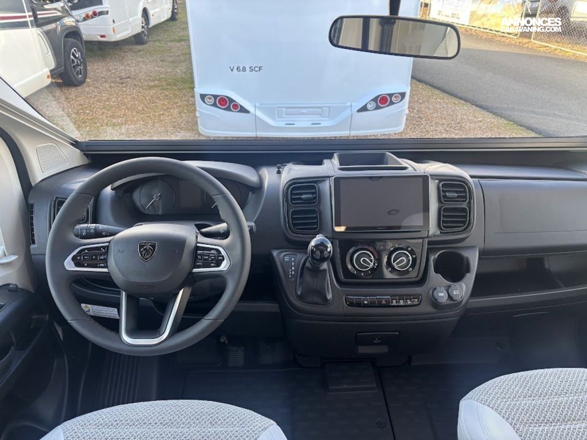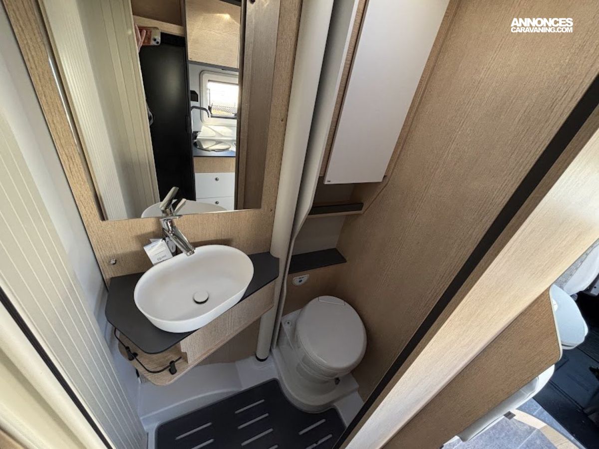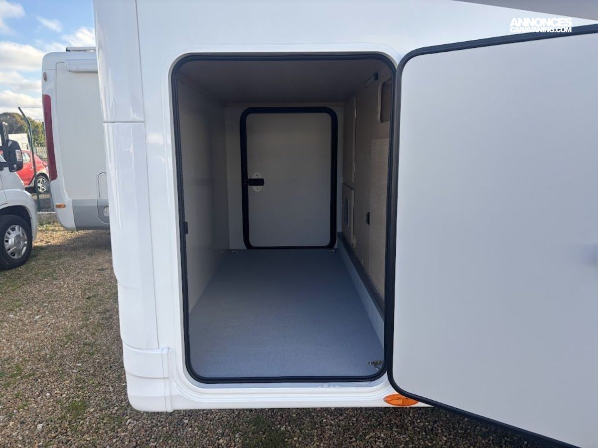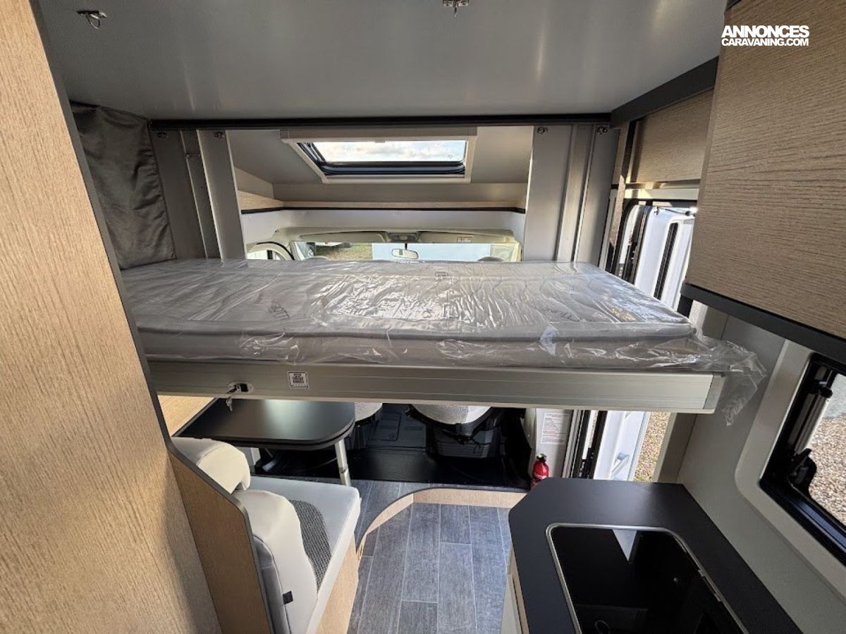Cuisine en long, Douche à vario, Lit dînette avant, lit jumeaux, lit pavillon, Maxi salon, Salon avant sièges pivotants, WC Cassette.