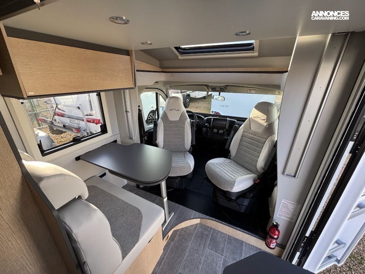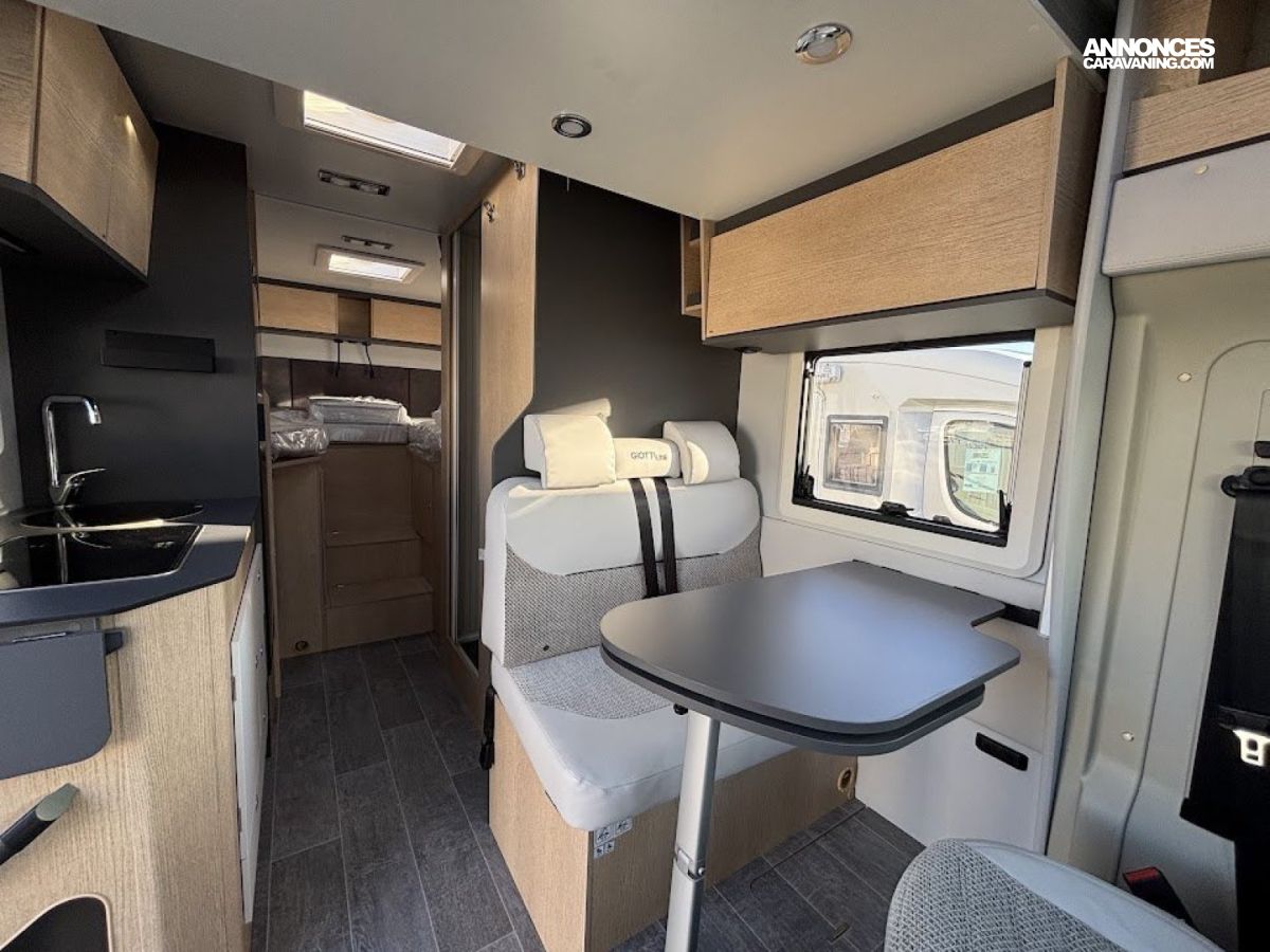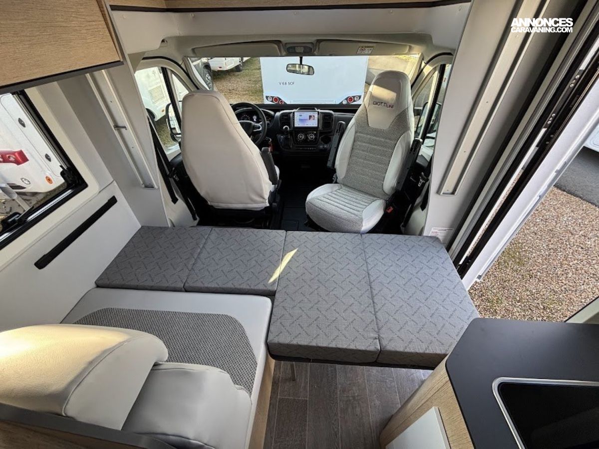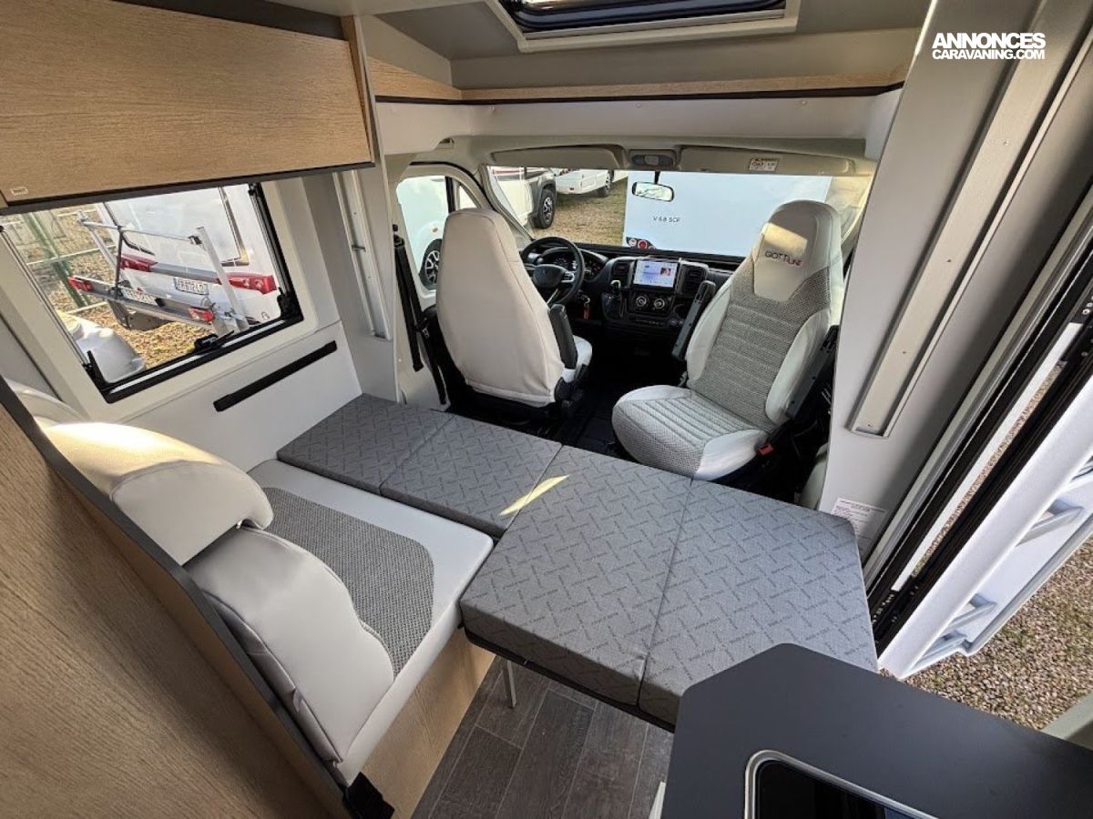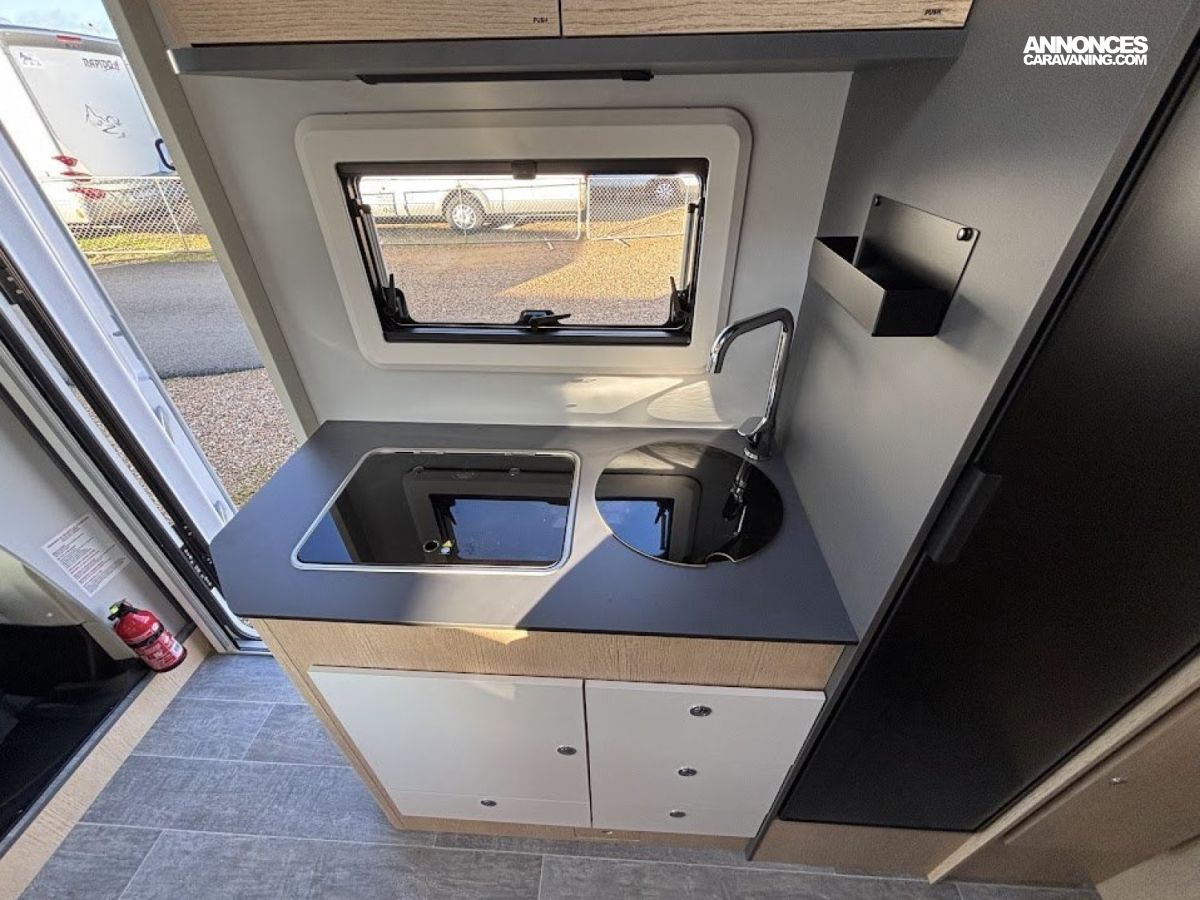 Cuisine en long, Douche à vario, Lit dînette avant, lit jumeaux, lit pavillon, Maxi salon, Salon avant sièges pivotants, WC Cassette.