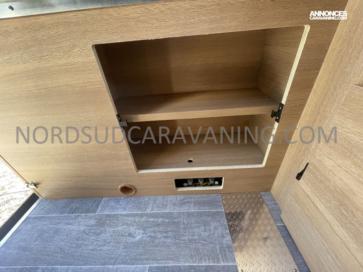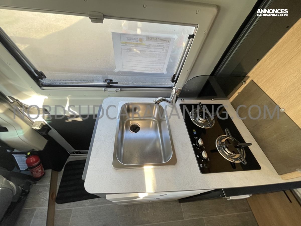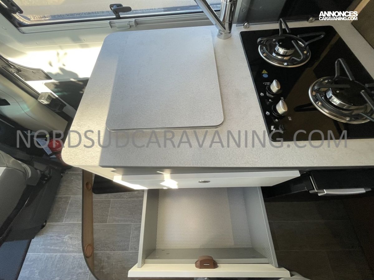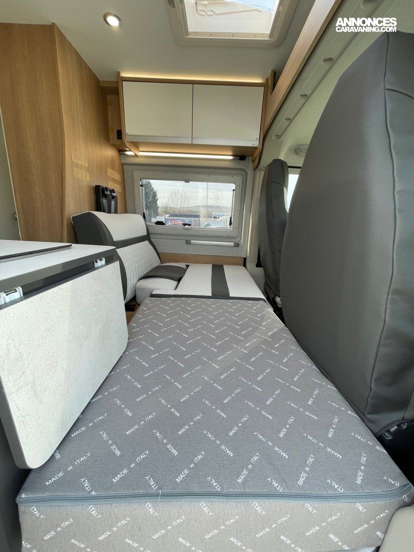 Sa dinette agréable et lumineuse se transforme en couchage d’appoint. Sa cuisine latérale pratique et fonctionnelle est équipée d’un réchaud 2 feux, évier et plan de travail rabattable. En face, une salle d’eau compacte tout-en-un qui ne manque de rien (Lavabo, miroir, WC, Douche). A l’arrière, c’est un couchage transversal confortable et agréable sur soute qui est proposé, vous permettant de ranger vos vélos, de retour de balades. Sans oublier ses nombreux rangements astucieux !