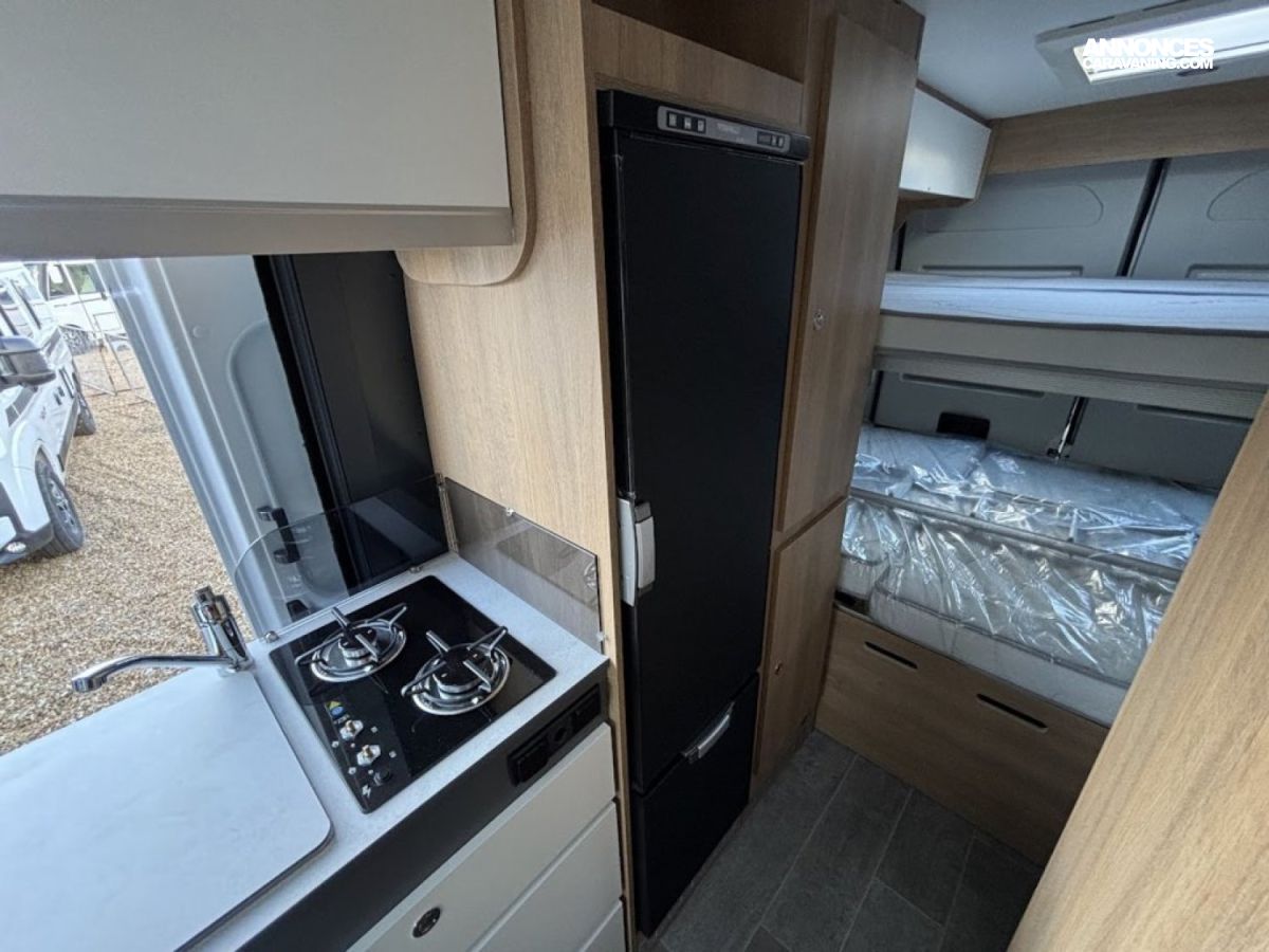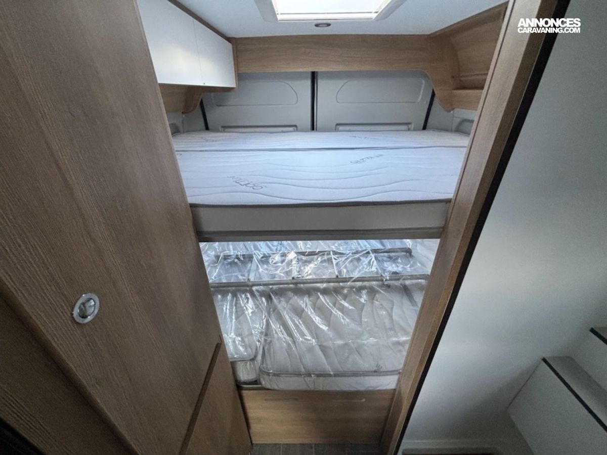 Cuisine en long, Douche modulable, Lit arrière transversal, Lit dînette avant, lit superposés, Salon avant sièges pivotants, WC Cassette.