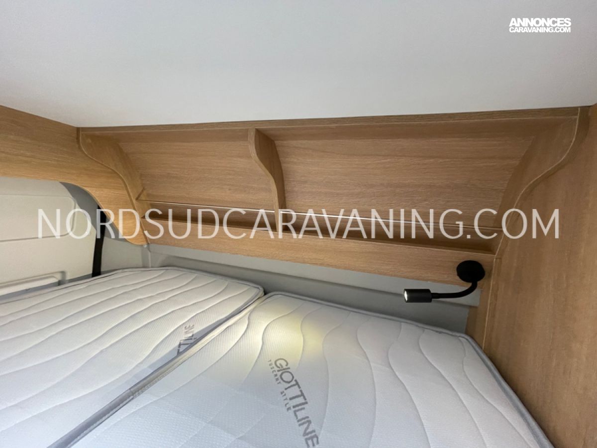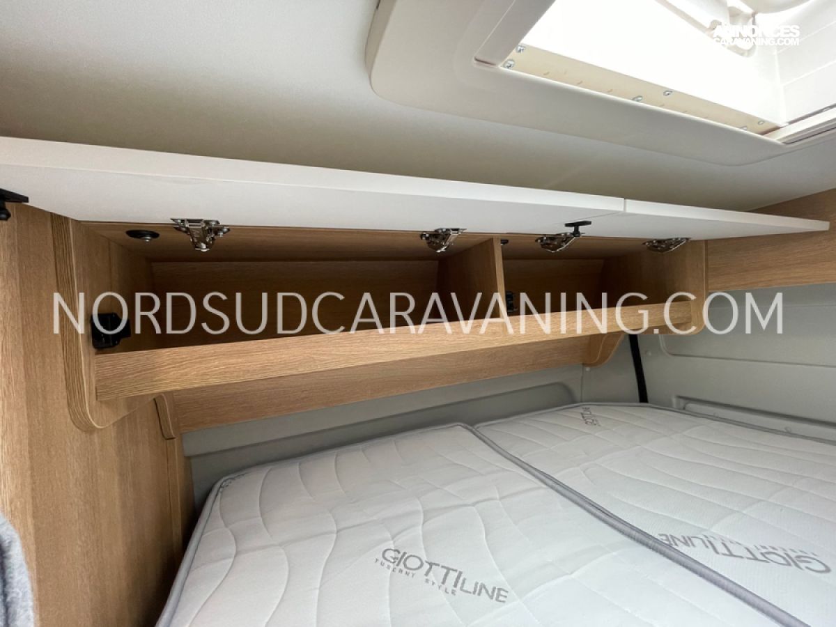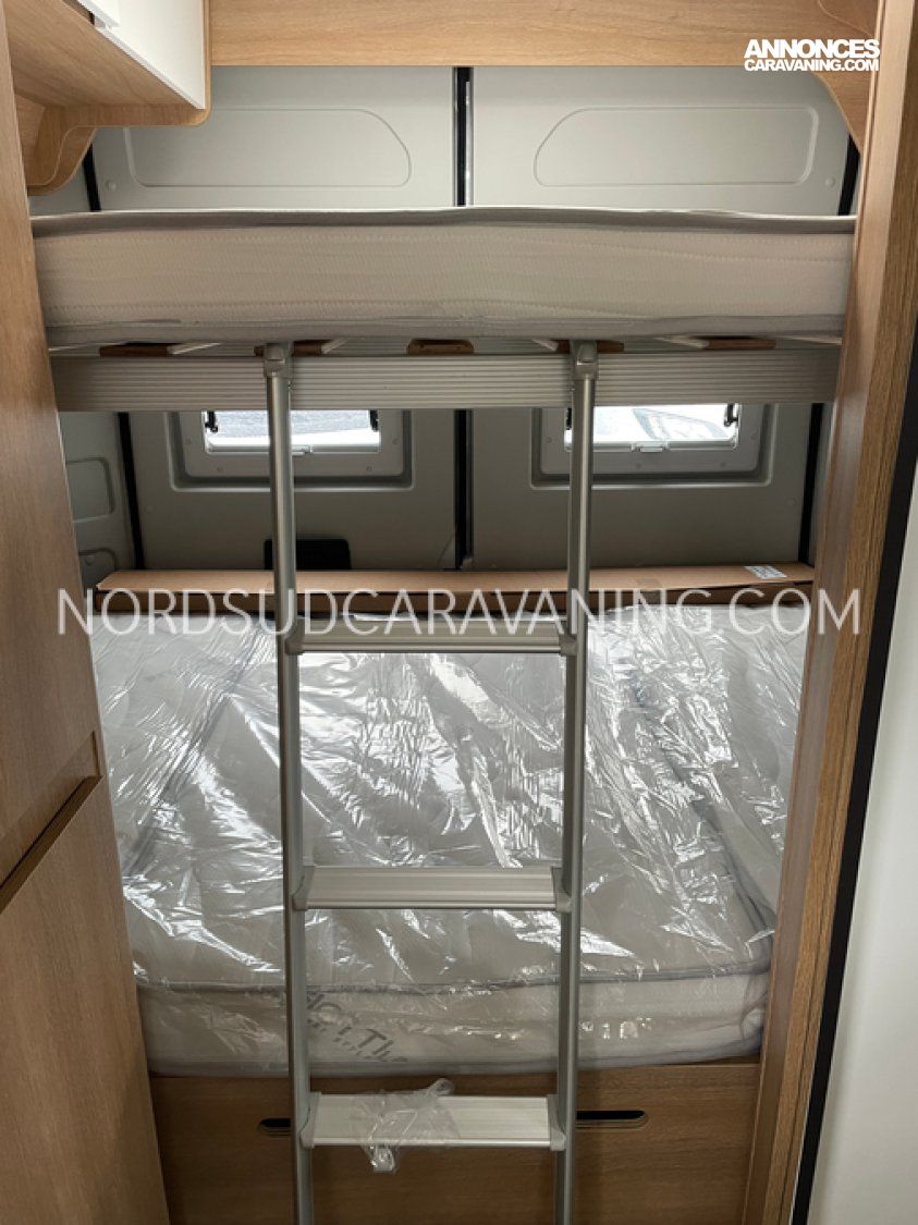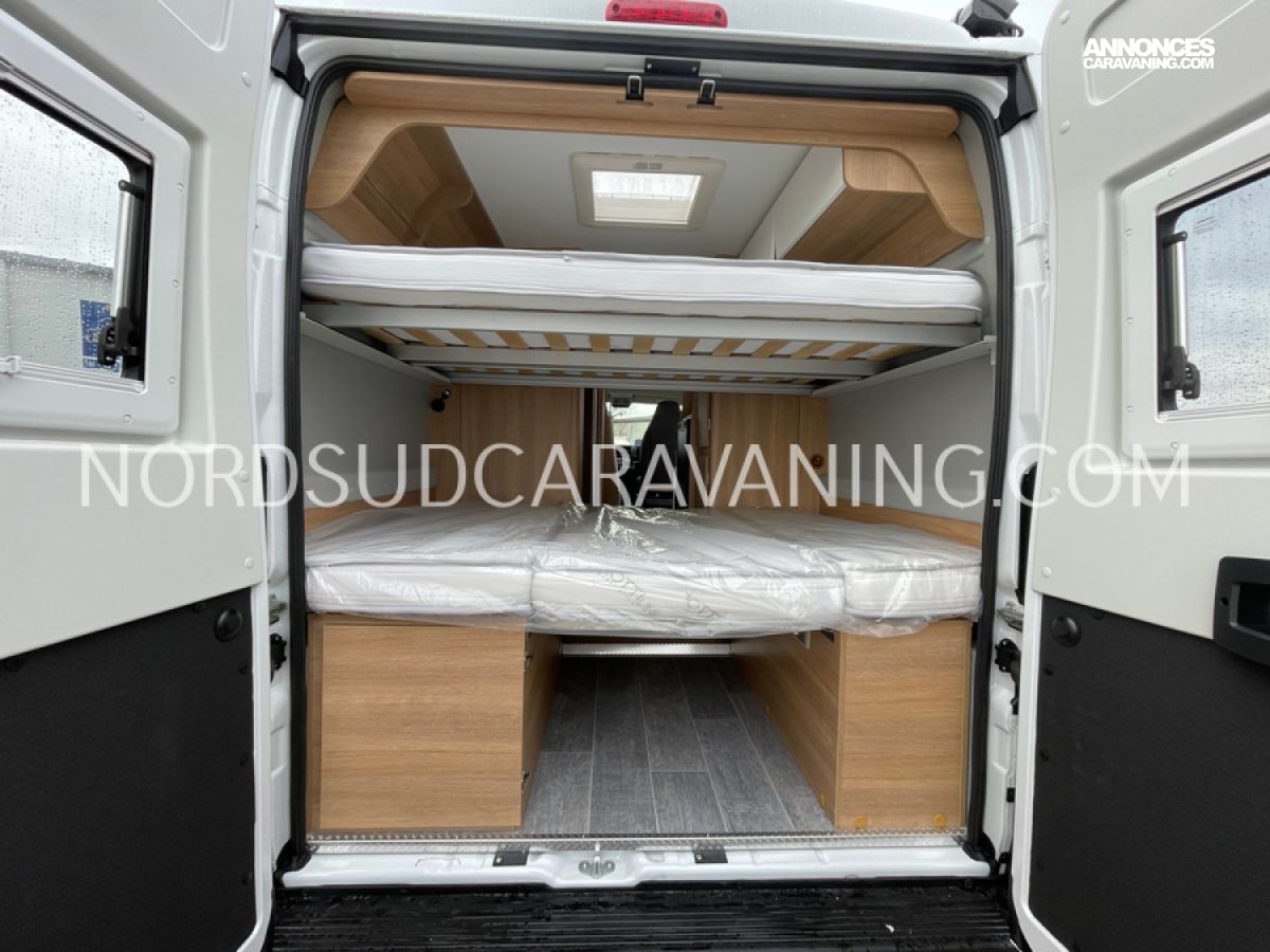 Avec ses 5,99 mètres de long, il propose un aménagement optimisé avec des lits superposés doubles modulables à l'arrière qui permettent selon les besoins de chacun de bénéficier de trois configurations : deux lits doubles superposés, un lit double en bas et une couchette en haut, ou alors un seul lit double en position basse. Une cuisine compacte et fonctionnelle avec réfrigérateur à compression, et une salle de bain avec douche intégrée.