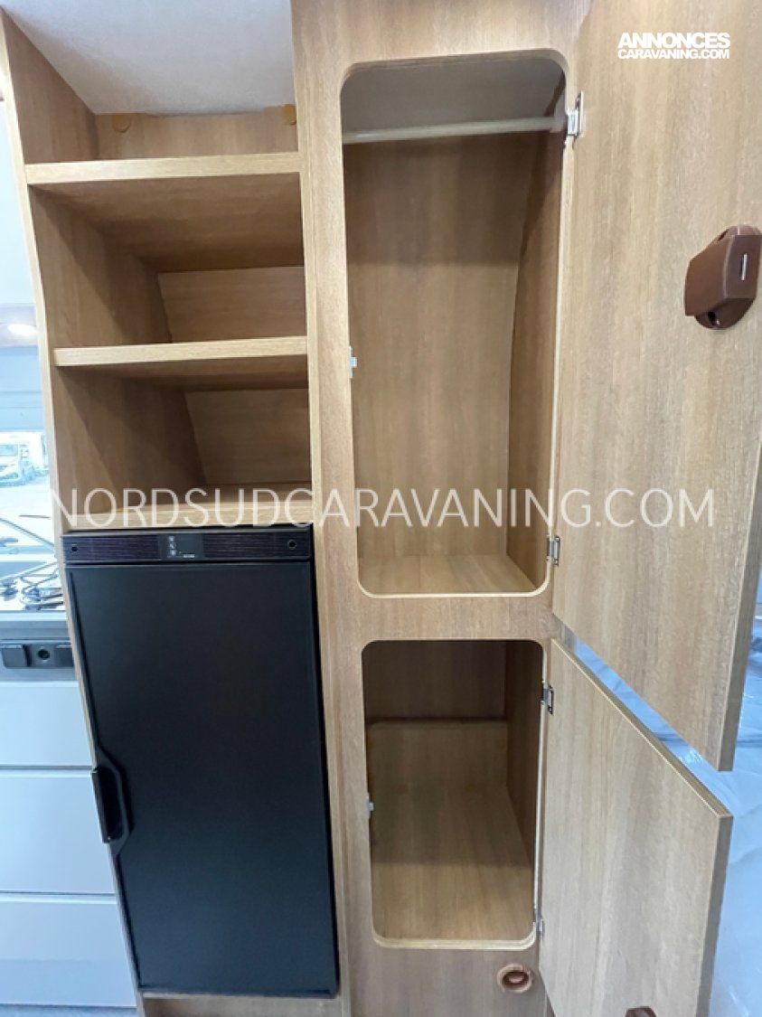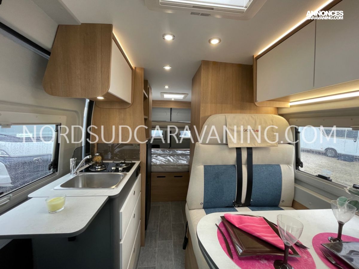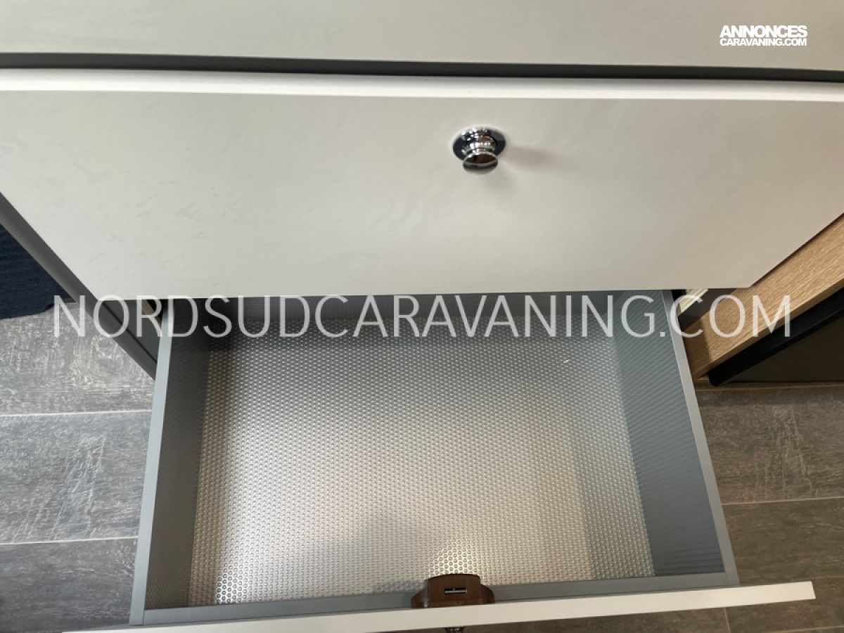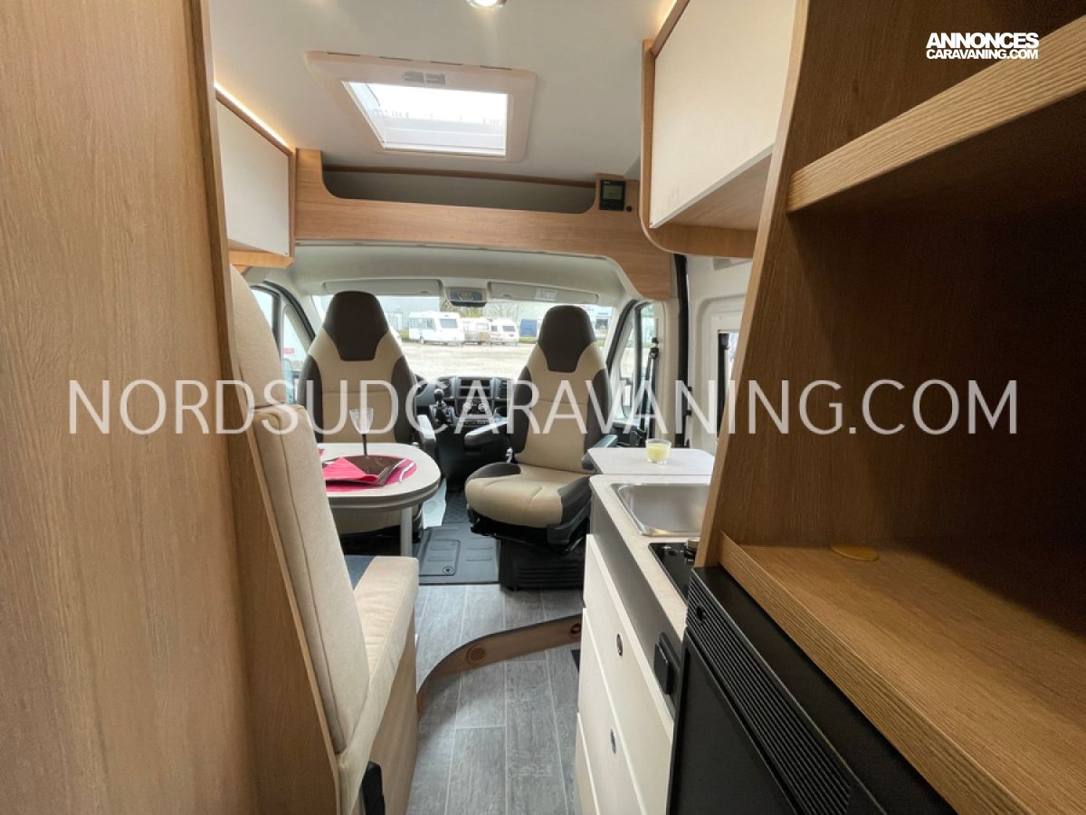 Avec ses 5,99 mètres de long, il propose un aménagement optimisé avec des lits superposés doubles modulables à l'arrière qui permettent selon les besoins de chacun de bénéficier de trois configurations : deux lits doubles superposés, un lit double en bas et une couchette en haut, ou alors un seul lit double en position basse. Une cuisine compacte et fonctionnelle avec réfrigérateur à compression, et une salle de bain avec douche intégrée.