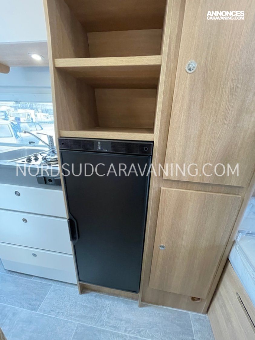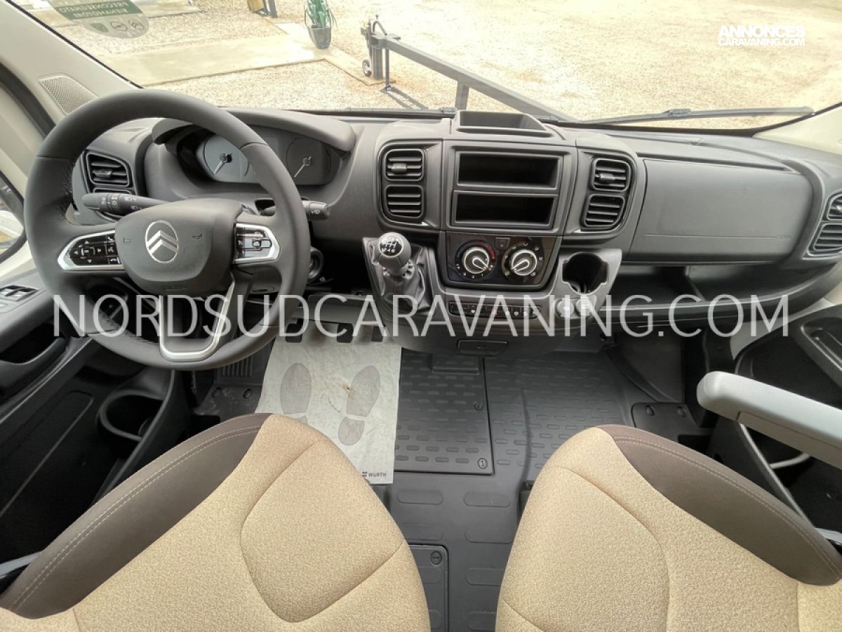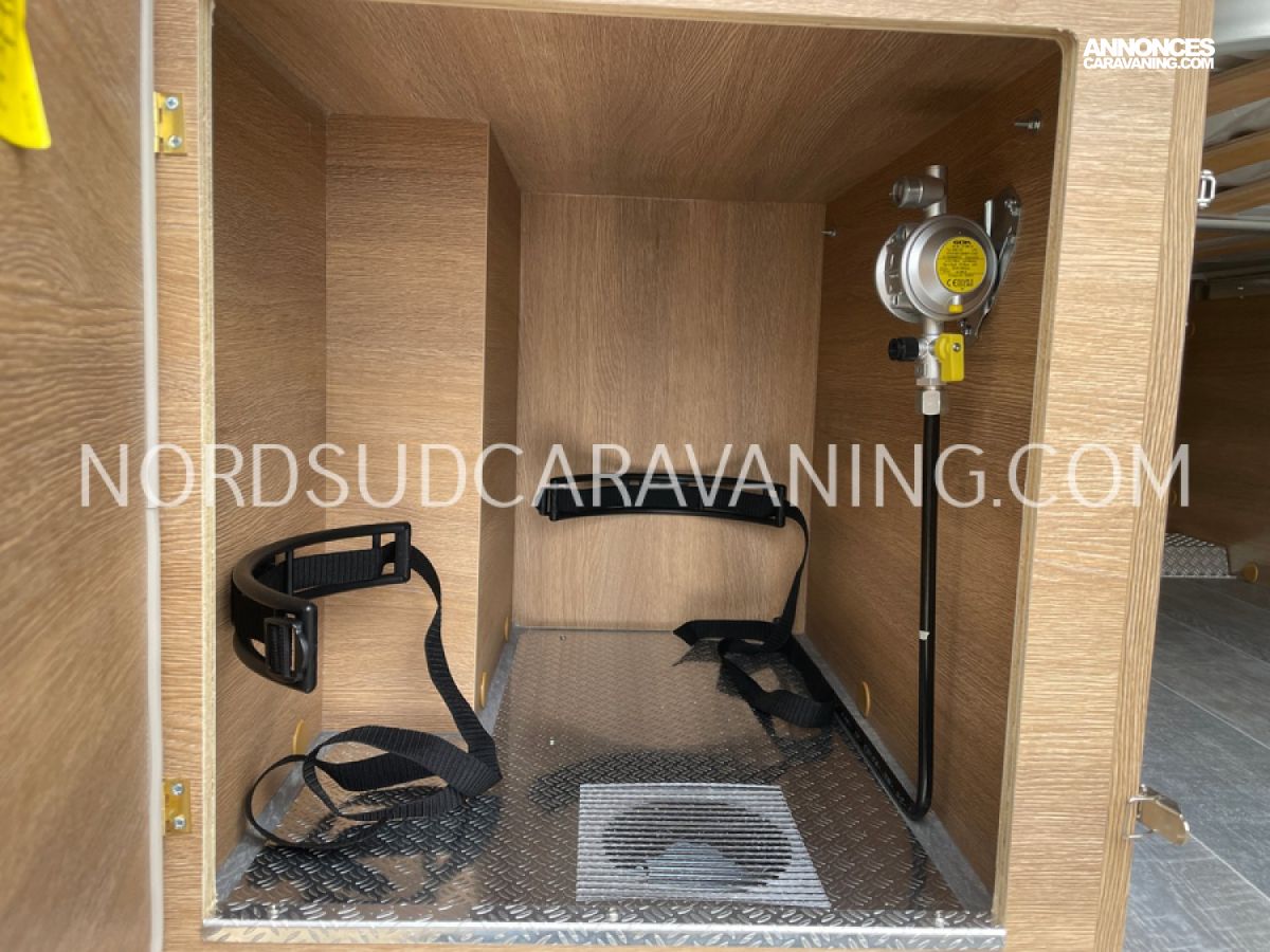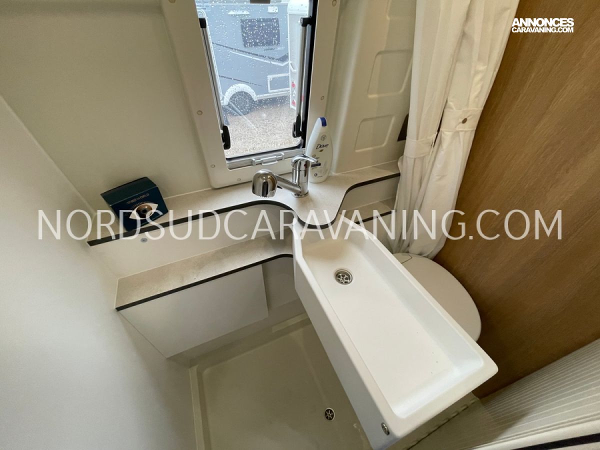 Avec ses 5,99 mètres de long, il propose un aménagement optimisé avec des lits superposés doubles modulables à l'arrière qui permettent selon les besoins de chacun de bénéficier de trois configurations : deux lits doubles superposés, un lit double en bas et une couchette en haut, ou alors un seul lit double en position basse. Une cuisine compacte et fonctionnelle avec réfrigérateur à compression, et une salle de bain avec douche intégrée.