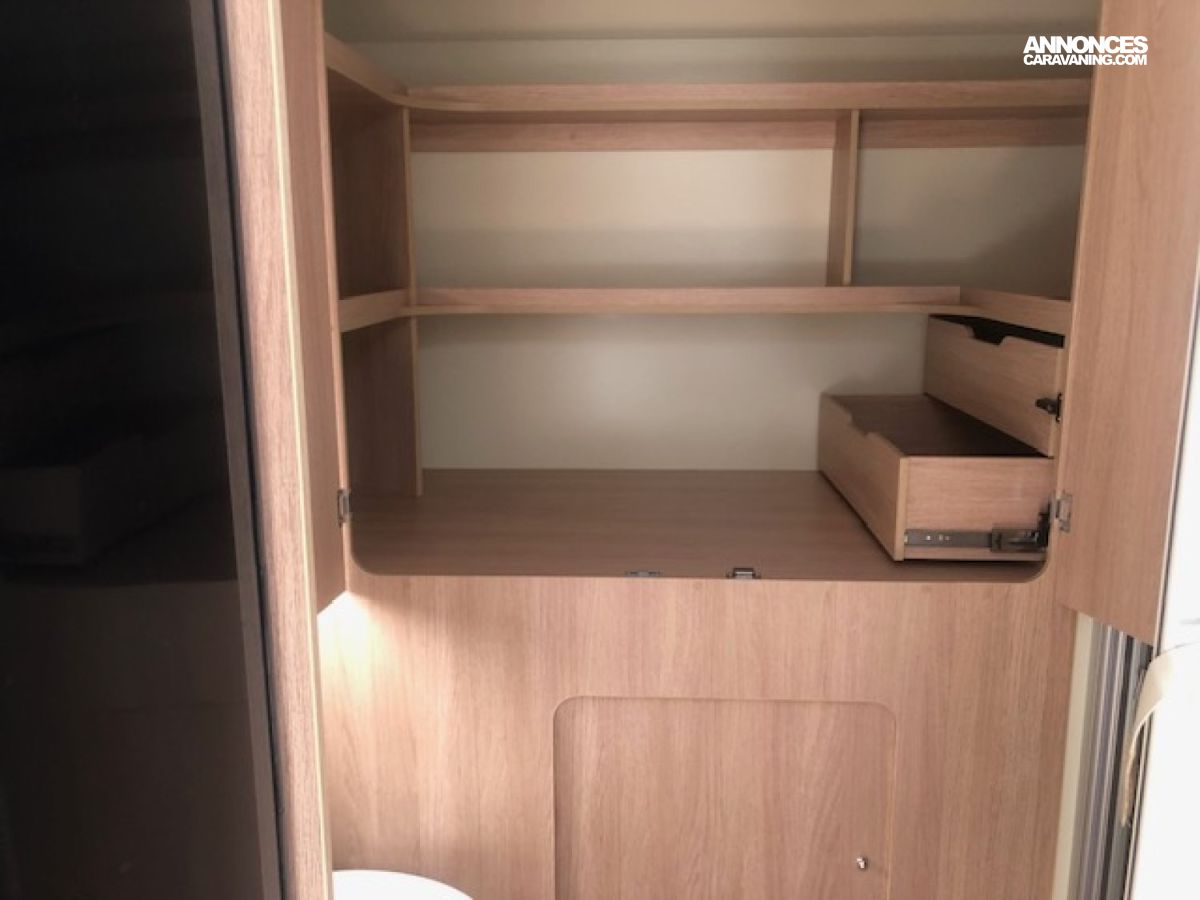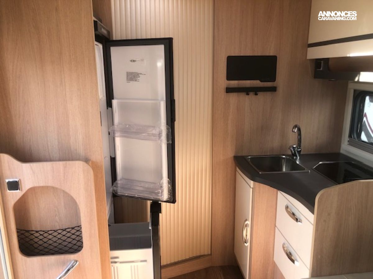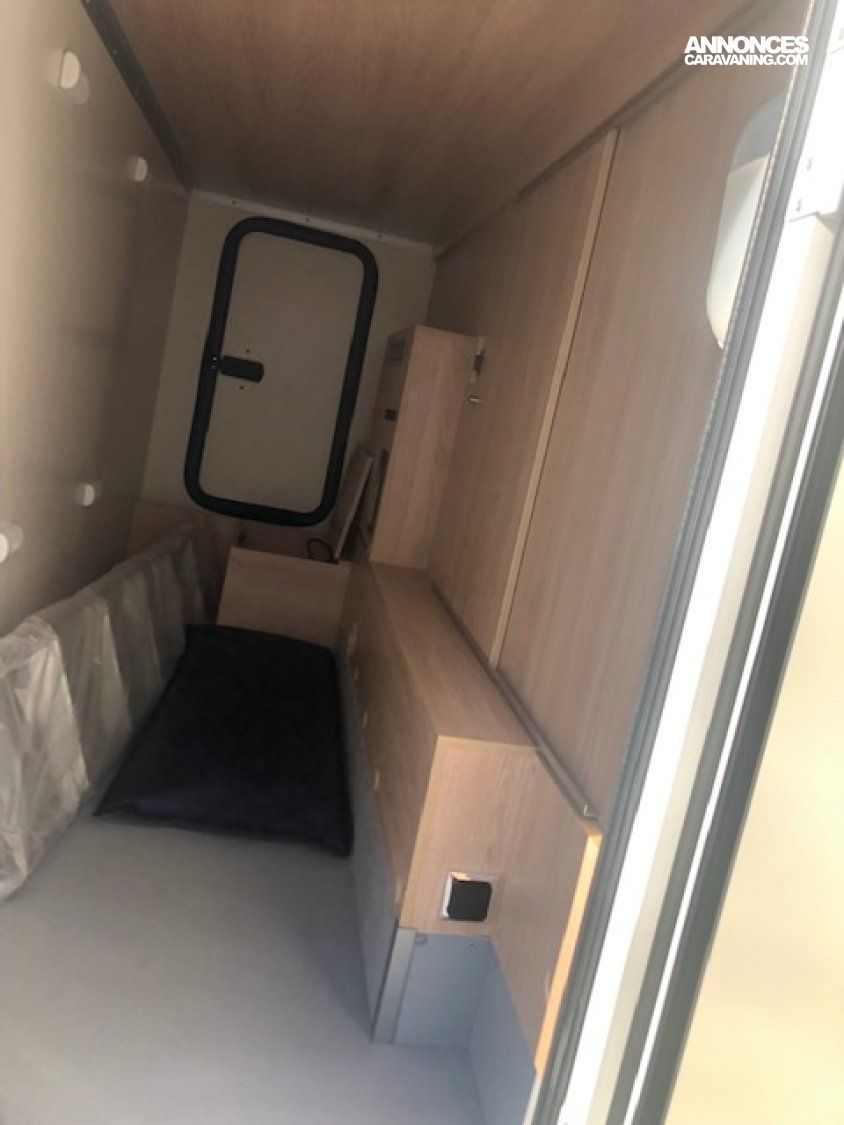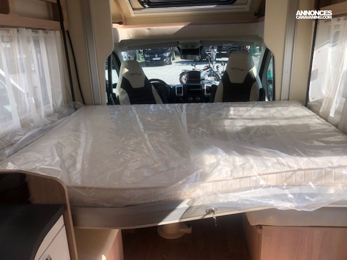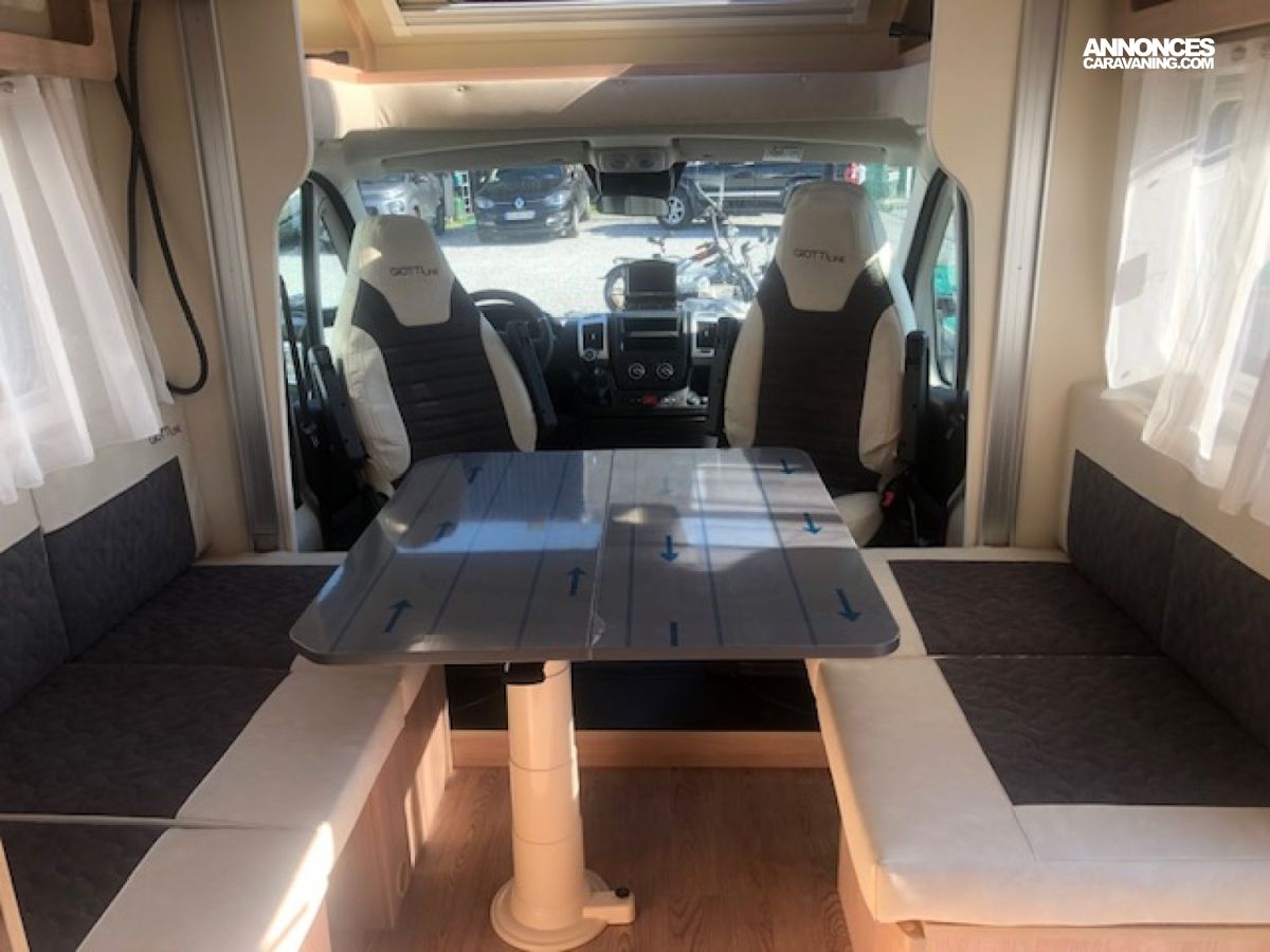 Ce camping-car de 6,36m vous offre un incroyable espace du fait de son lit de pavillon qui se remonte en journée, cela permet d'avoir de nombreux rangements et un salon face à face avec une grande table.