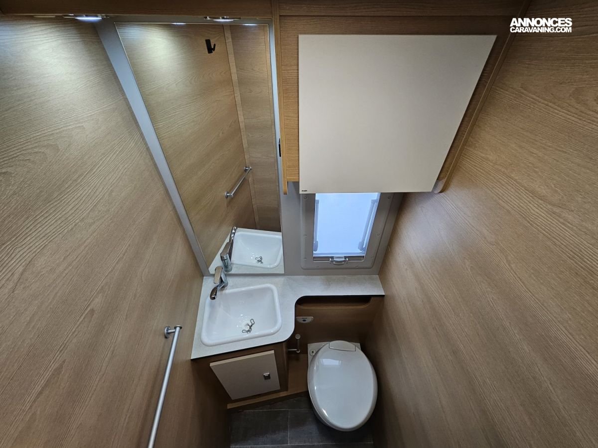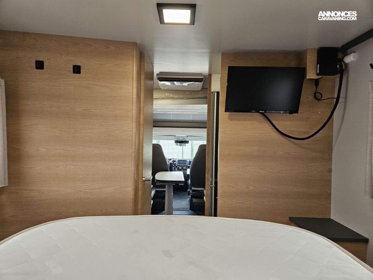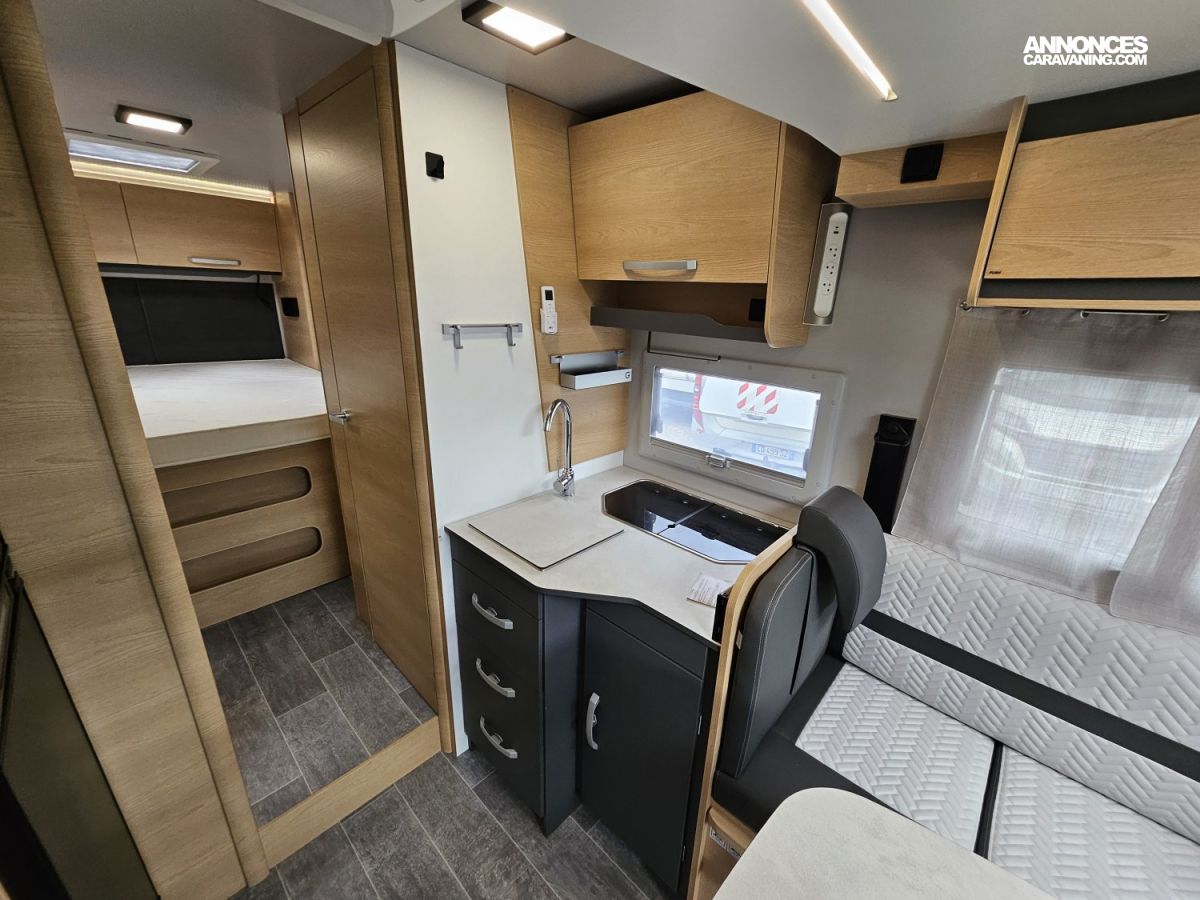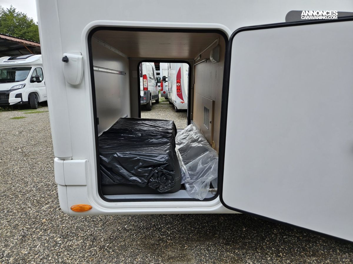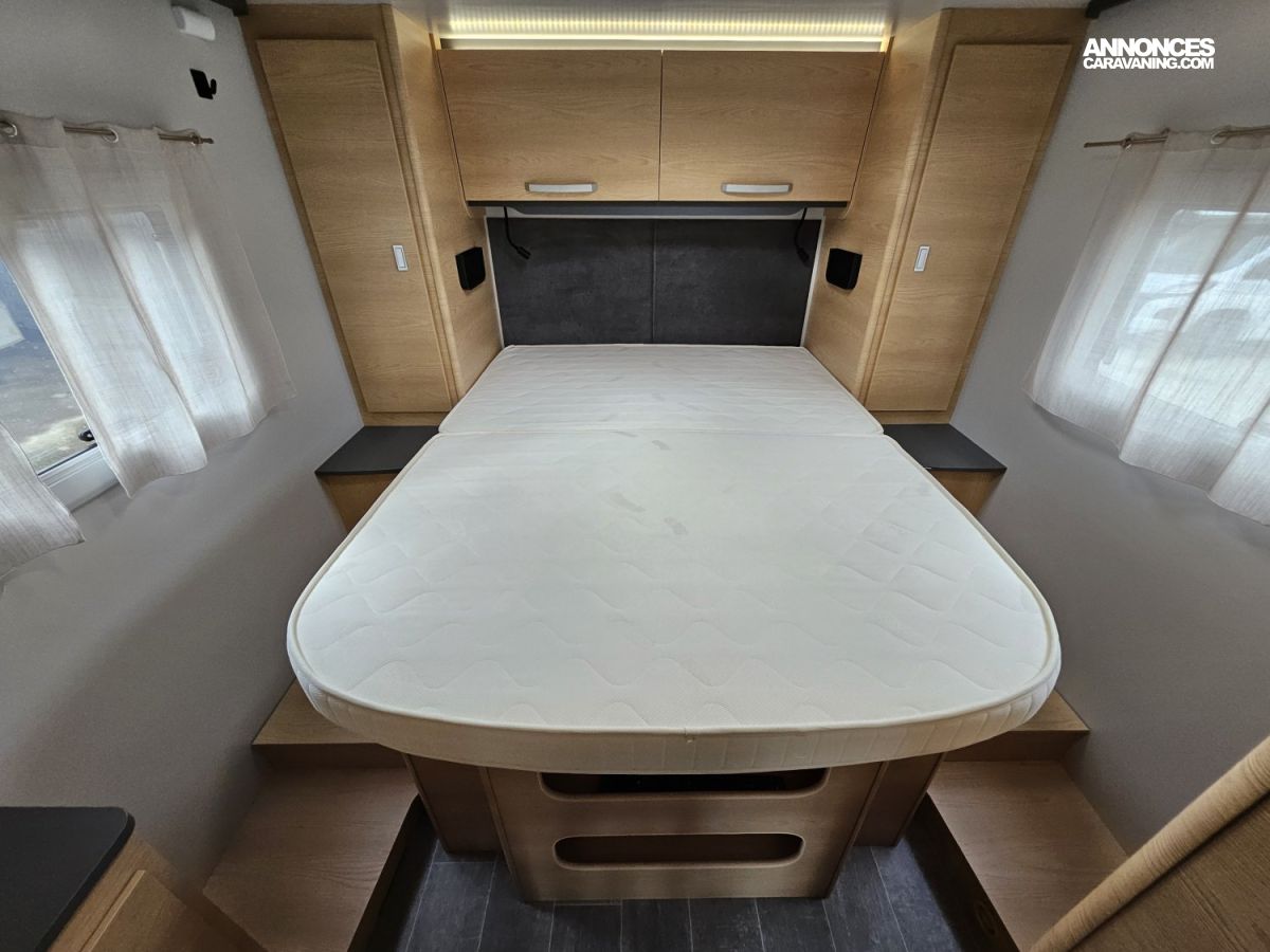D'une longueur de 7,45 mètres, il offre un lit central à l'arrière, un lit pavillon électrique 2 places à l'avant et un couchage simple sur la dinette, une salle de bain avec douche séparée et un grand espace de vie.