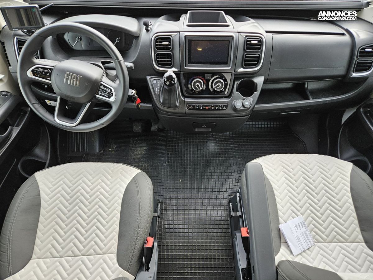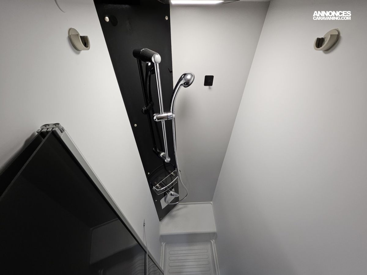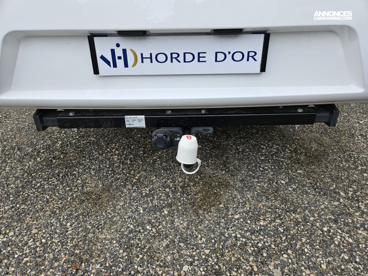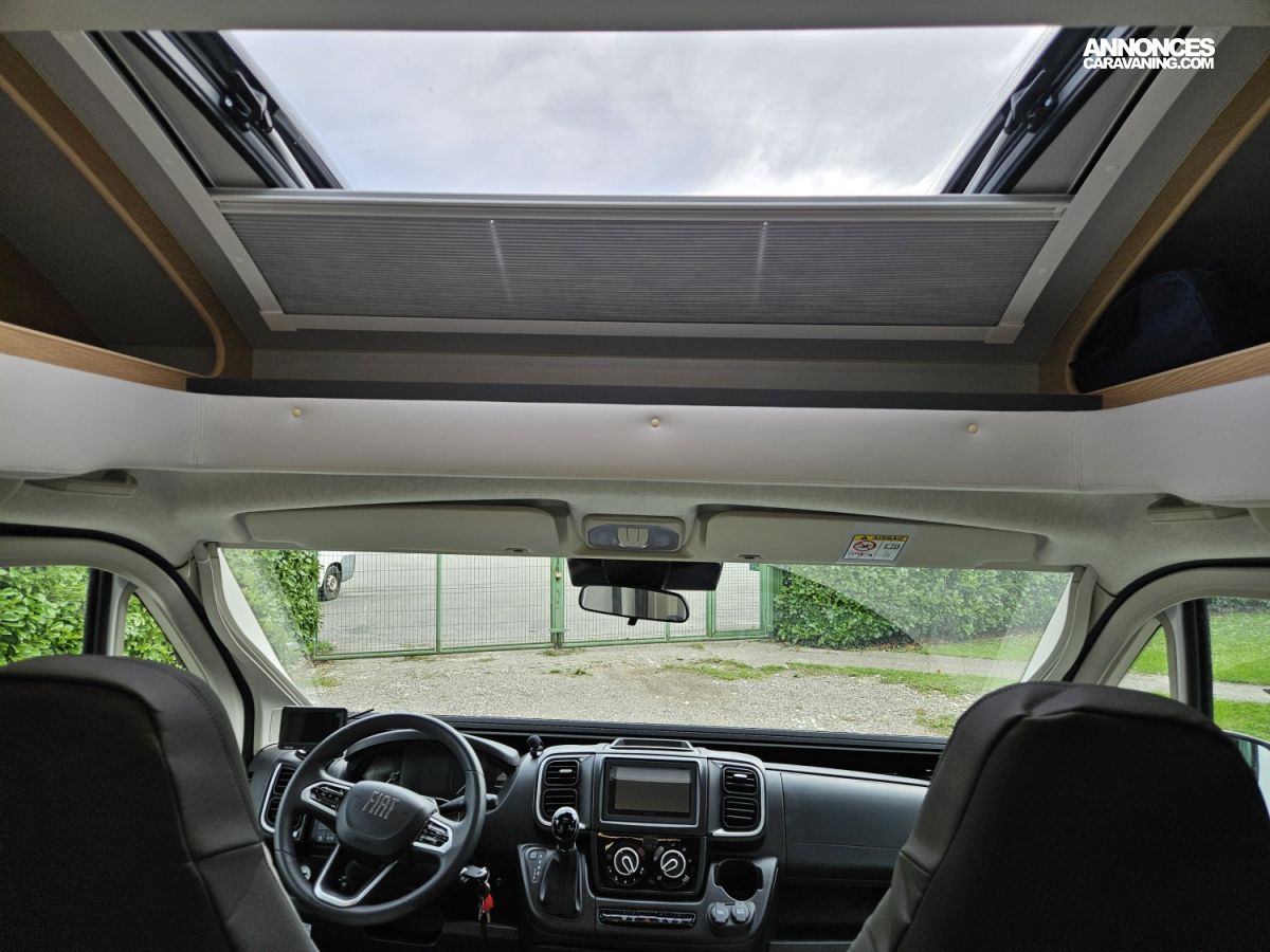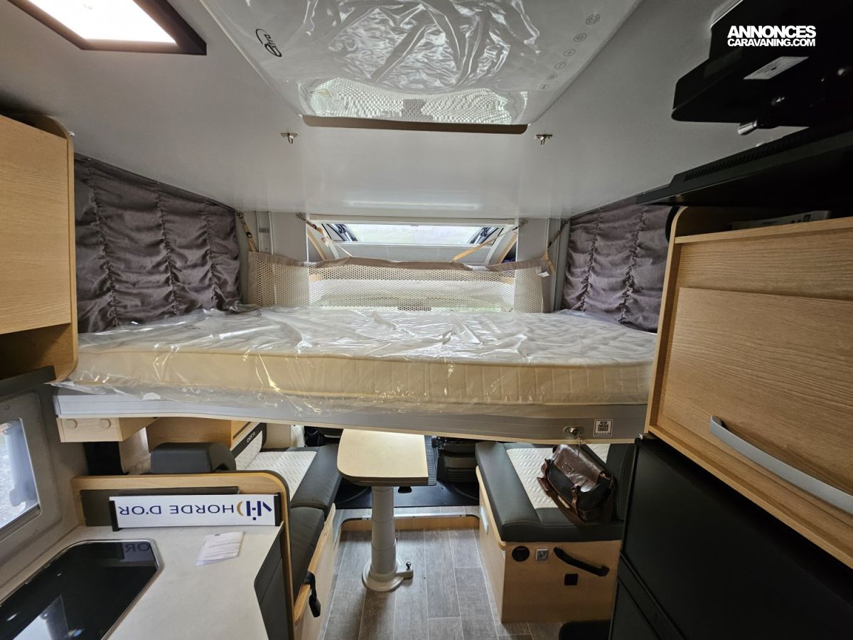 D'une longueur de 7,45 mètres, il offre un lit central à l'arrière, un lit pavillon électrique 2 places à l'avant et un couchage simple sur la dinette, une salle de bain avec douche séparée et un grand espace de vie.