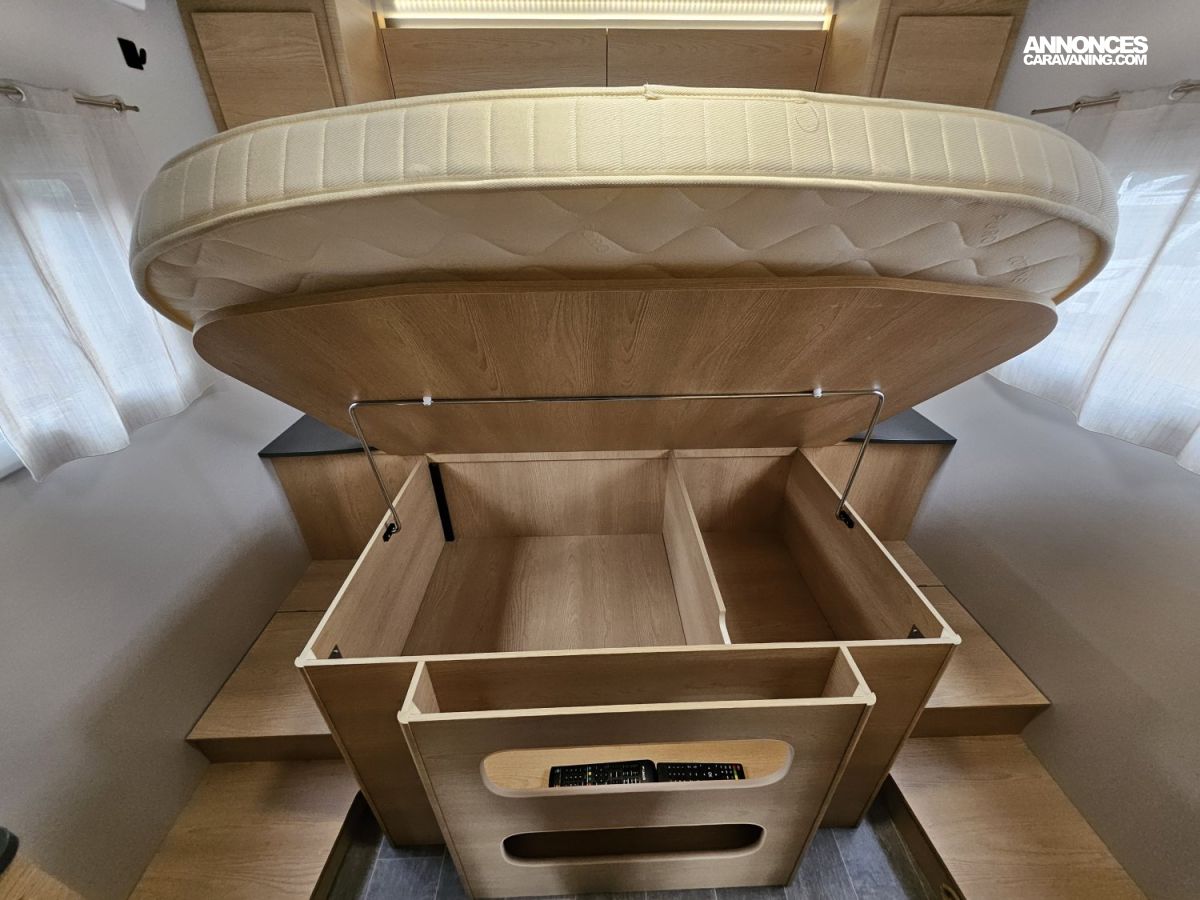 La grande soute garage arrière et les équipements de bord garantissent autonomie, confort et sécurité : parabole automatique, 2 télévisions 22', batterie lithium 200ah et convertisseur 3000w, attelage, coussins pneumatiques, climatiseur réversible etc...
