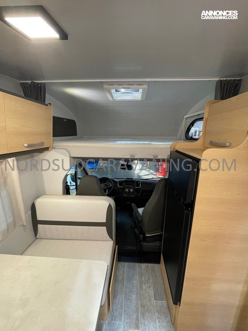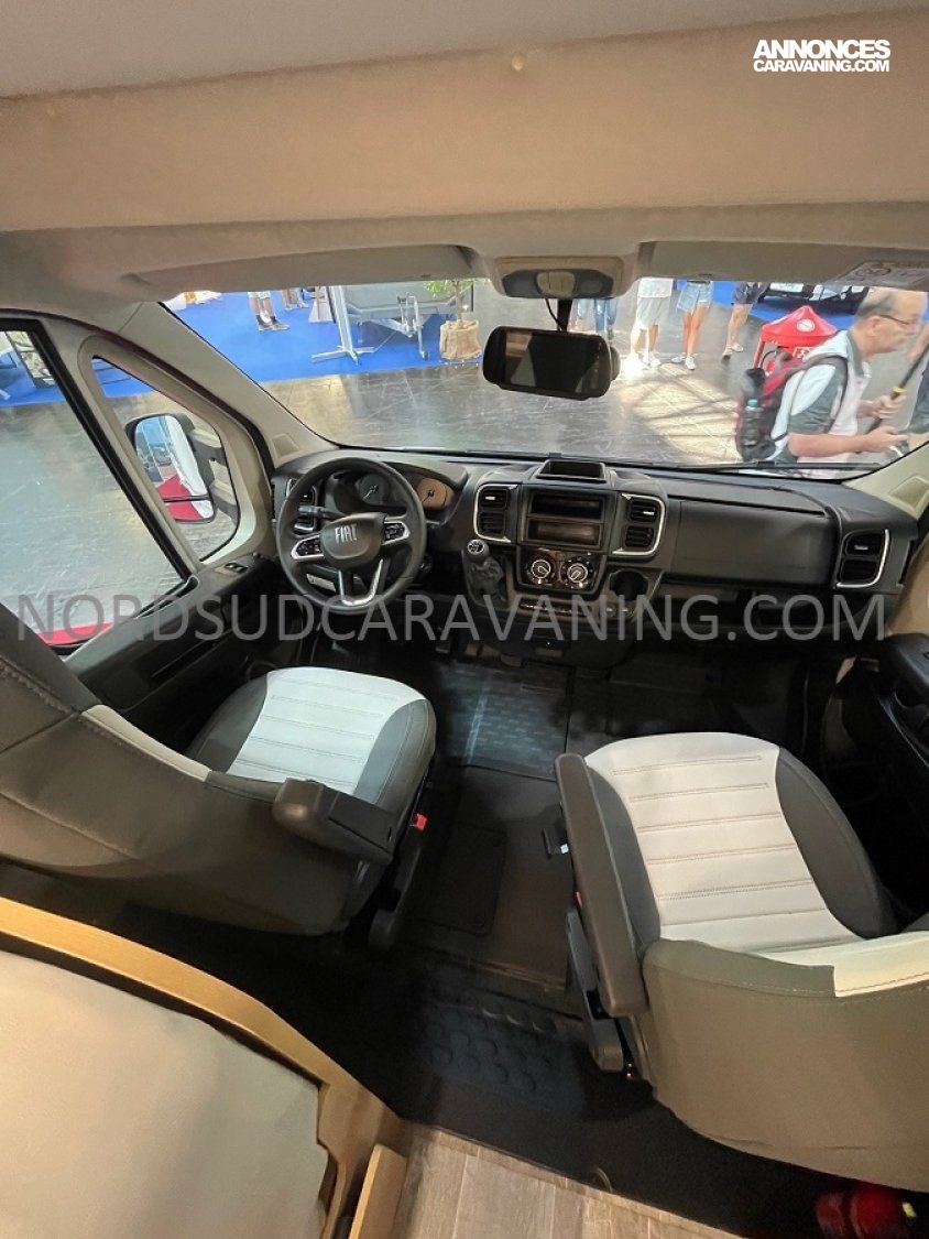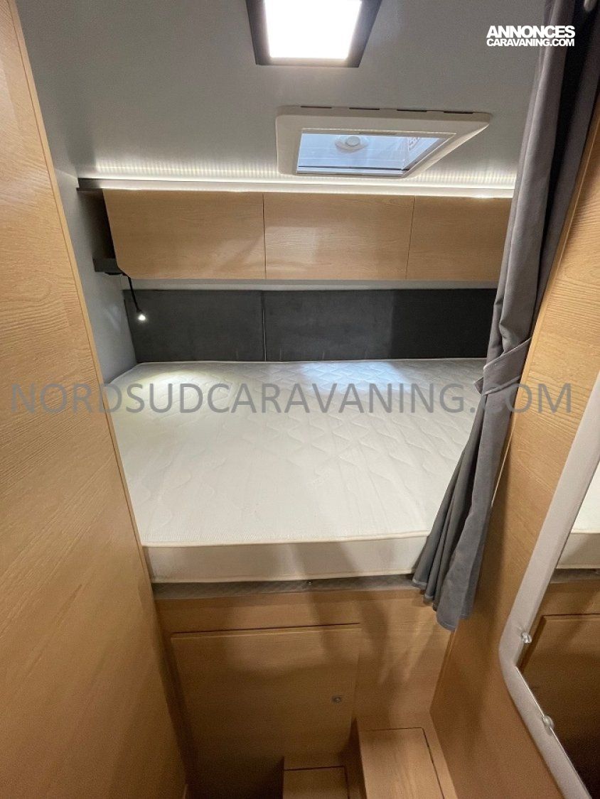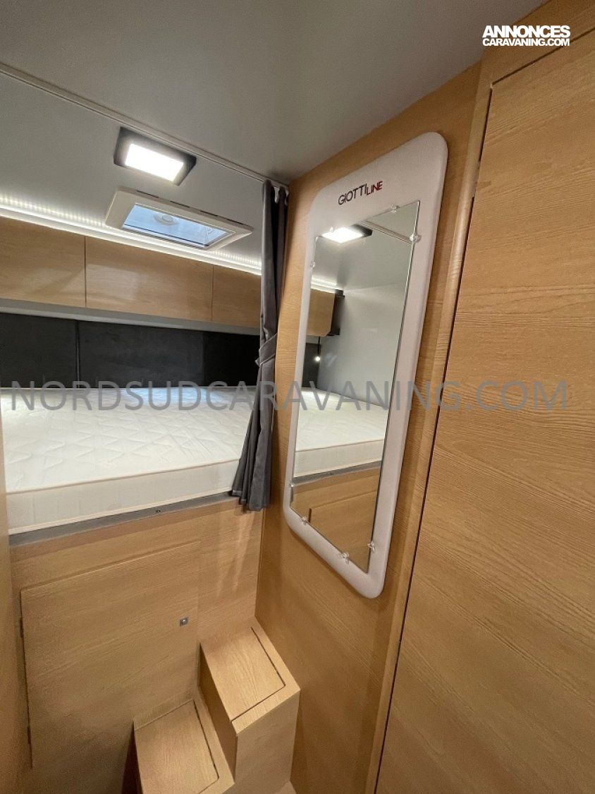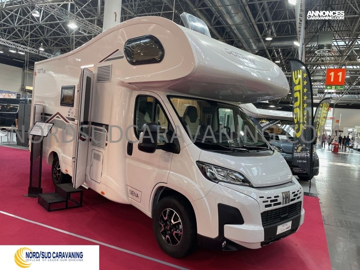CAMPING-CAR CAPUCINE GIOTTILINE SIENA 440 moins de 7m, grande soute garage, 6 places carte grise, Grand lit arrière transversal de 136 cm de large, Grandes portes d'accès au garage à droite et à gauche.