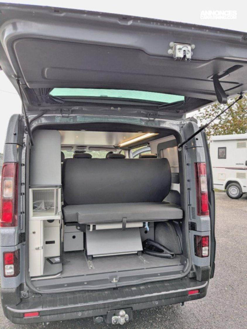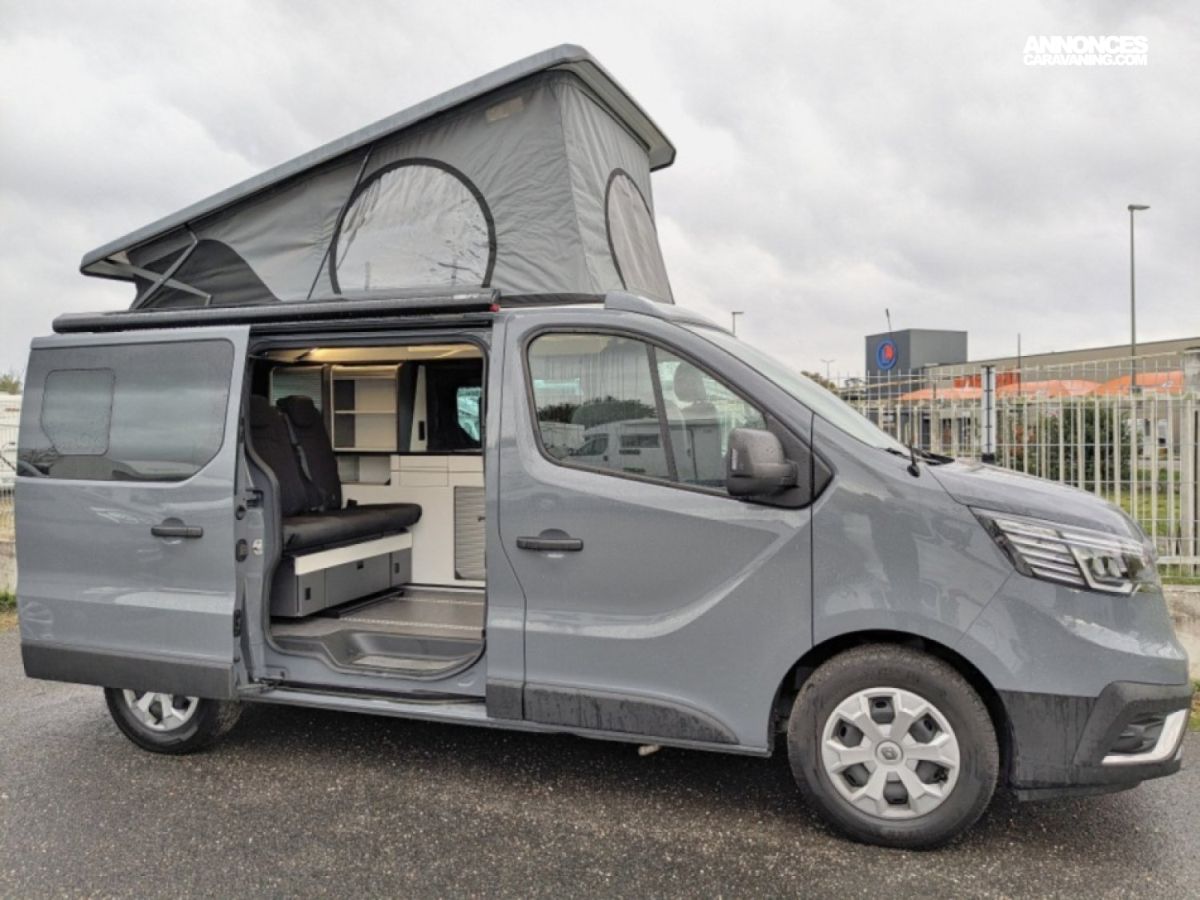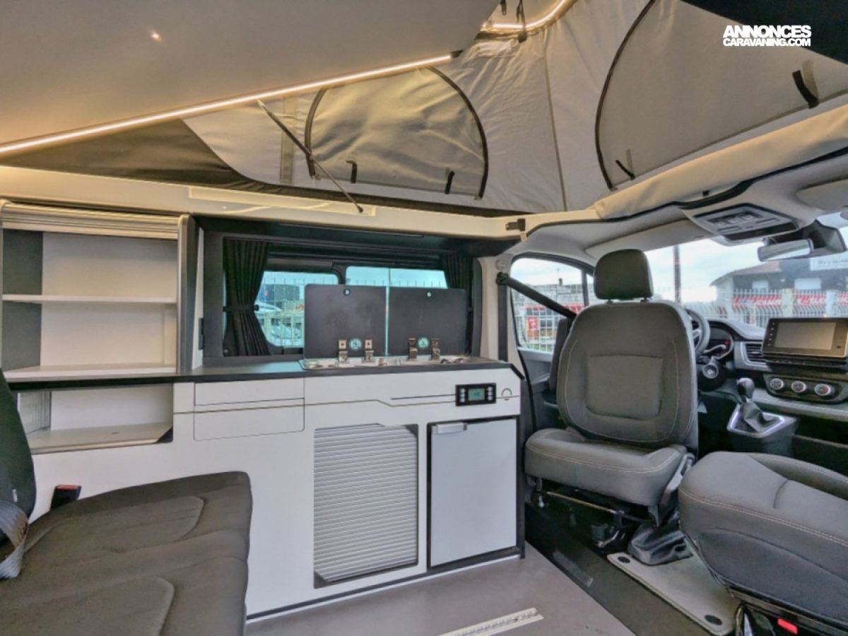 Van à toit relevable en parfait état sur Renault Trafic 2,0 dCi 150 cv en boîte automatique 6 vitesses. Ce van dispose d'une banquette rabbattable convertible en couchage de deux personnes, une cuisine droite avec plaque de cuisson au gaz et frigo à compression et d'un salon avant avec sièges pivotants. Le toit relevable manuellement peut accueillir deux adultes.