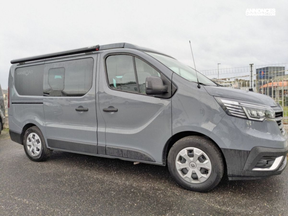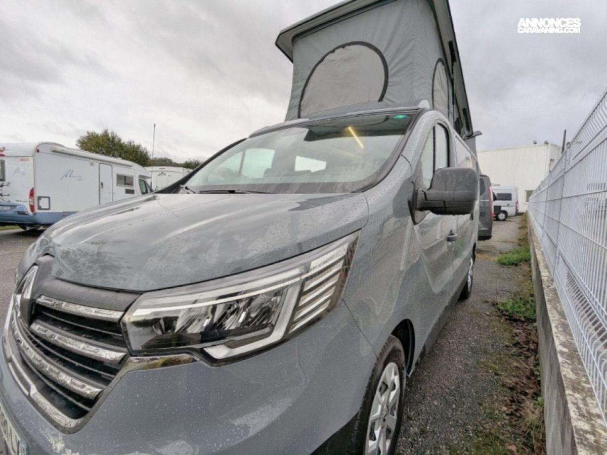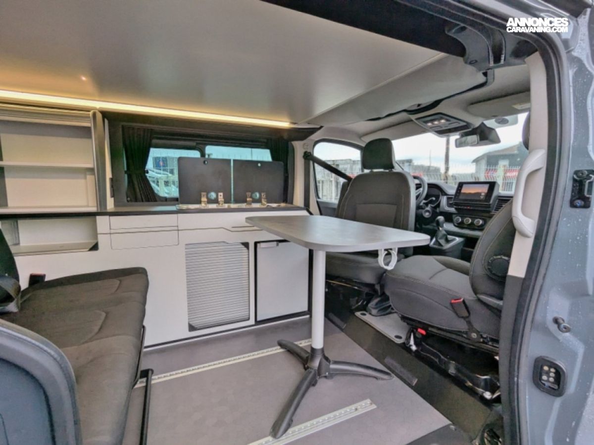 Van à toit relevable en parfait état sur Renault Trafic 2,0 dCi 150 cv en boîte automatique 6 vitesses. Ce van dispose d'une banquette rabbattable convertible en couchage de deux personnes, une cuisine droite avec plaque de cuisson au gaz et frigo à compression et d'un salon avant avec sièges pivotants. Le toit relevable manuellement peut accueillir deux adultes.