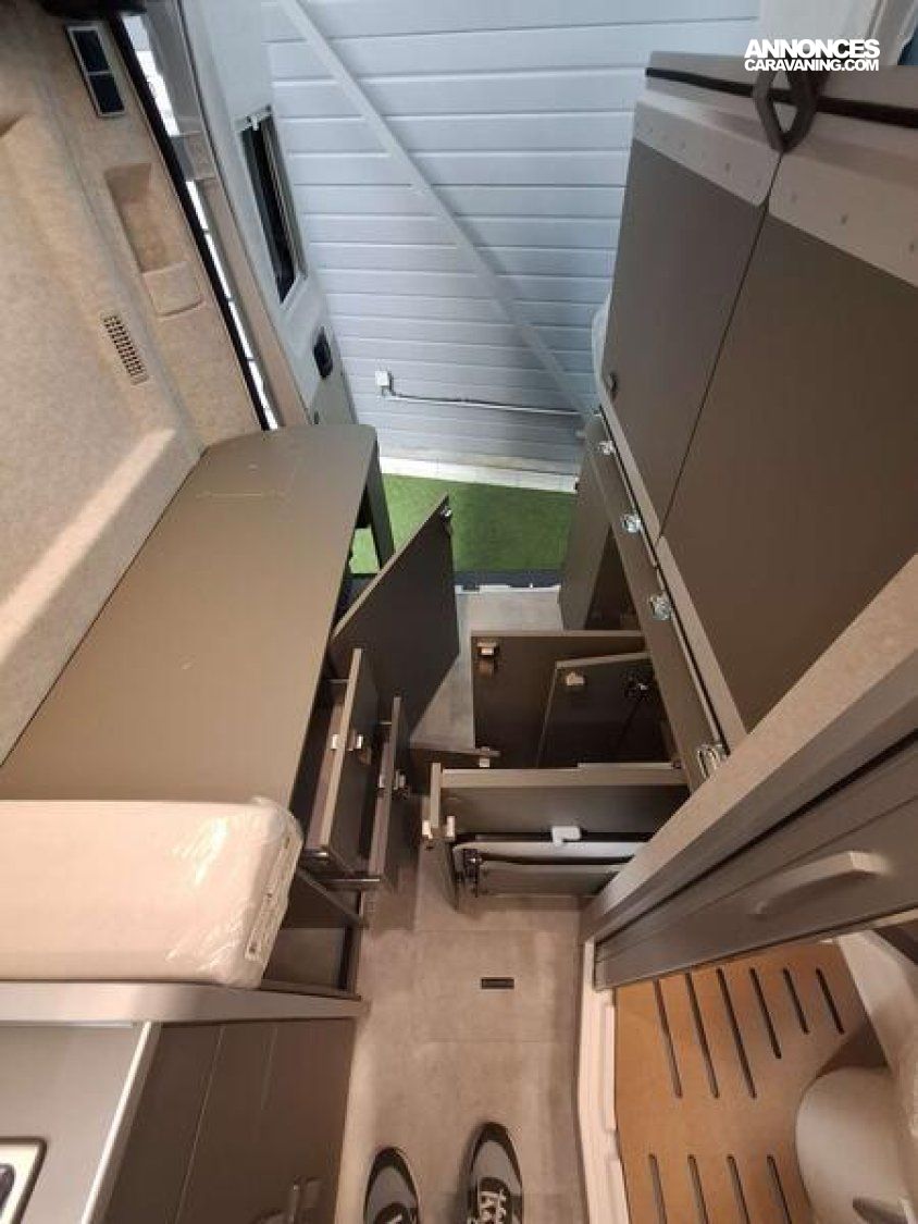 OPTIONS CONSTRUCTEUR Finition Plus : Réservoir carburant 90 l Frein de parking électrique Régulateur de vitesse Prédisposition audio avec 4 haut-parleurs Climatisation automatique avec filtre à pollen Volant et pommeau de levier de vitesse en cuir Jantes alliage 16" Cockpit intégralement digital avec écran 7" intégré Rangement pour smartphones avec fonction de recharge sans fil et indicateur du niveau de charge Tableau de bord avec inserts coloris aluminium + Pack Confort : Skyview avec store occultant Système d'éclairage d'ambiance : système d'éclairage à plusieurs niveaux avec commande dynamique et individuelle (y compris l'intensité de la lumière) ainsi qu'un balisage au sol Ambiance style "HOME" (2 coussins houssés + pochette de rangement en tissu) Draps-housses sur mesure pour lits arrière adaptés aux contours du matelas Caillebotis de douche avec surface en liège : 4325 €