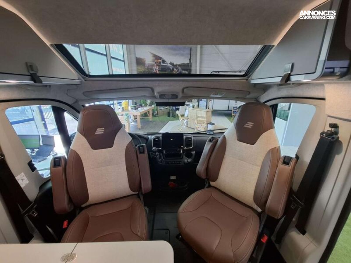 Pack Assistance à la conduite : Système d'aide à la conduite : freinage d'urgence, maintien dans la voie & assistant de vitesse intelligent, capteur de pluie & de luminosité y compris assistant de feux de route, reconnaiss Aide au stationnement (avertissement sonore des obstacles dans la zone arrière) Avertisseur d'angle mort avec système de détection arrière de mouvement latéral Rétroviseurs extérieurs rabattables électriquement + Pack Style : Skid plate coloris noir brillant Feux antibrouillard avec feux de virage Pare-chocs couleur carrosserie (uniquement pour Fiat Ducato 3,5 t) + Toit relevable blanc (maxi couchage avec lanterneau et verrouillage électrique) + Backrack+ (Une solution adaptée à tous vos besoins de transport : vélos, planches de surf, skis, bagages, roue de secours...) + ISOFIX - fixation siège enfant pour banquette dînette + Chaises pliantes (2 pièces) + table (y compris fixation) + Système d'infodivertissement Fiat avec écran tactile 10", système de navigation intégré, DAB+, Apple Car Play, Google Android Auto avec caméra de recul et volant multifonction + Chauffage gazole à air pulsé de 6 kW avec chauffe-eau de 10 l, résistance électrique de 1 800 watts et coffre à gaz compact pour bouteille de gaz de 6 kg ainsi que 3 tiroirs de rangement + Cuir / tissu Moreno : 15615 €