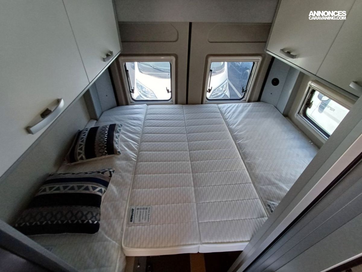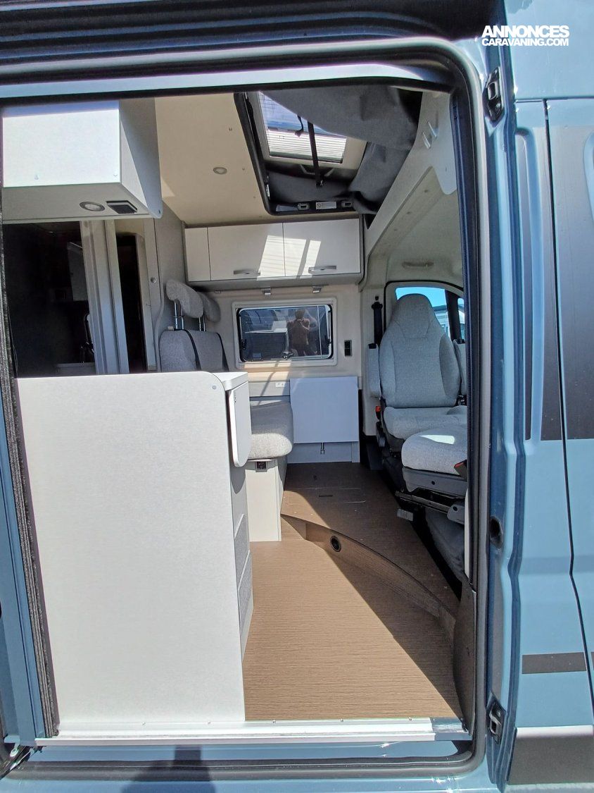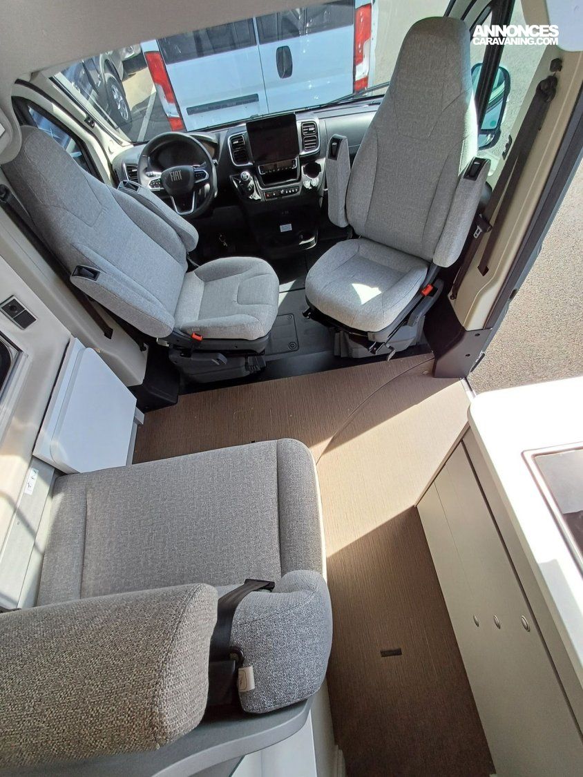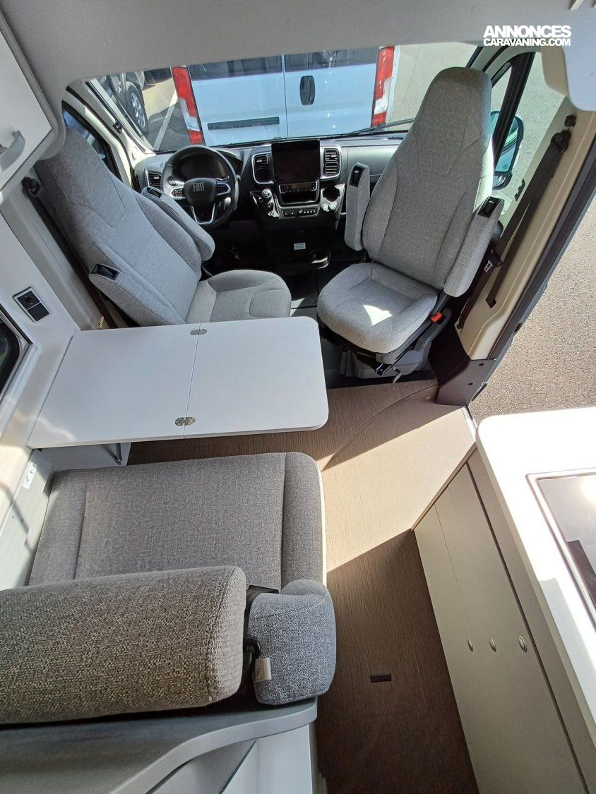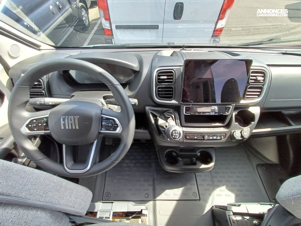 - Finition Campus :Peinture Gris Lanzarote pastel, frein de parking électrique, feux antibrouillard avec feux de virage, skid plate coloris noir brillant, PC couleur carrosserie (uniquement pour Fiat Ducato 3,5 t),climatisation automatique avec filtre à pollen,cockpit intégralement digital avec écran 7" intégré, rangement pour smartphones avec fonction de recharge sans fil et indicateur du niveau de charge, système d'infodivertissement Fiat avec écran tactile 10", système de navigation intégré, DAB+, Apple Car Play, Google Android Auto avec caméra de recul et volant multifonction, volant et pommeau de levier de vitesse en cuir, tableau de bord avec inserts coloris aluminium, prédisposition radio DAB et audio avec haut- parleurs à l'arrière, toit relevable couleur carrosserie (maxi couchage avec lanterneau et verrouillage électrique), store extérieur avec adaptateur pour toit relevable, boîtier coloris anthracite, baie projetante arrière côté gauche avec store occultant et moustiquaire, sérigraphie noir mat des jupes latérales, ISOFIX, stores plissés de cabine, tissu Korfu, finition argent, ambiance style "HOME" (2 coussins houssés + pochette de rangement en tissu), caillebotis de douche, prises supplémentaires : 2 x 230 V / 1 x 12 V.