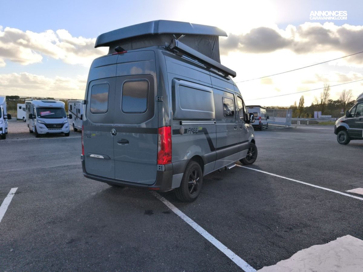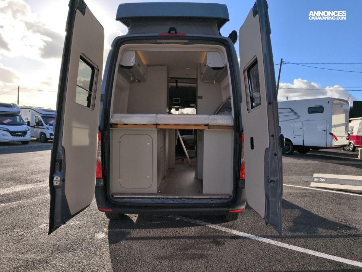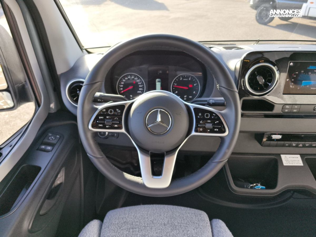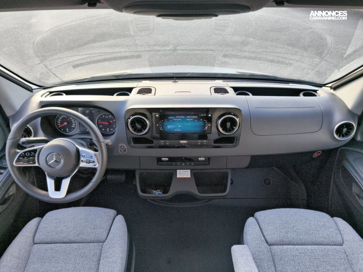- Pack "Campus" (Régulateur de vitesse actif Distronic Plus avec commandes au volant, boîte de vitesse automatique 9G-Tronic, système multimédia MBUX avec écran tactile 10.25" et caméra de recul + navigation, prédisposition audio avec 4 haut-parleurs, instrumentation avec écran "Pixel-Matrix" Mercedes, volant en cuir, climatisation semi-automatique Tempmatic, store plissés de cabine, prises supplémentaires, réservoir d'eaux usées isolé et chauffé, 2 coussins + pochette de rangement, mobilier coloris blanc, fixations Isofix, sérigraphie noir mat des jupes latérales, store 3m avec boîtier anthracite, toit relevable coloris du véhicule avec couchage double, jantes alu 16" coloris noir avec pneus 4 saisons, bandes décoratives chromées sur la calandre rétroviseurs électriques et dégivrants, réservoir carburant 92L,, peinture coloris gris bleu pastel, motorisation 170cv, tissu "Korfu"),