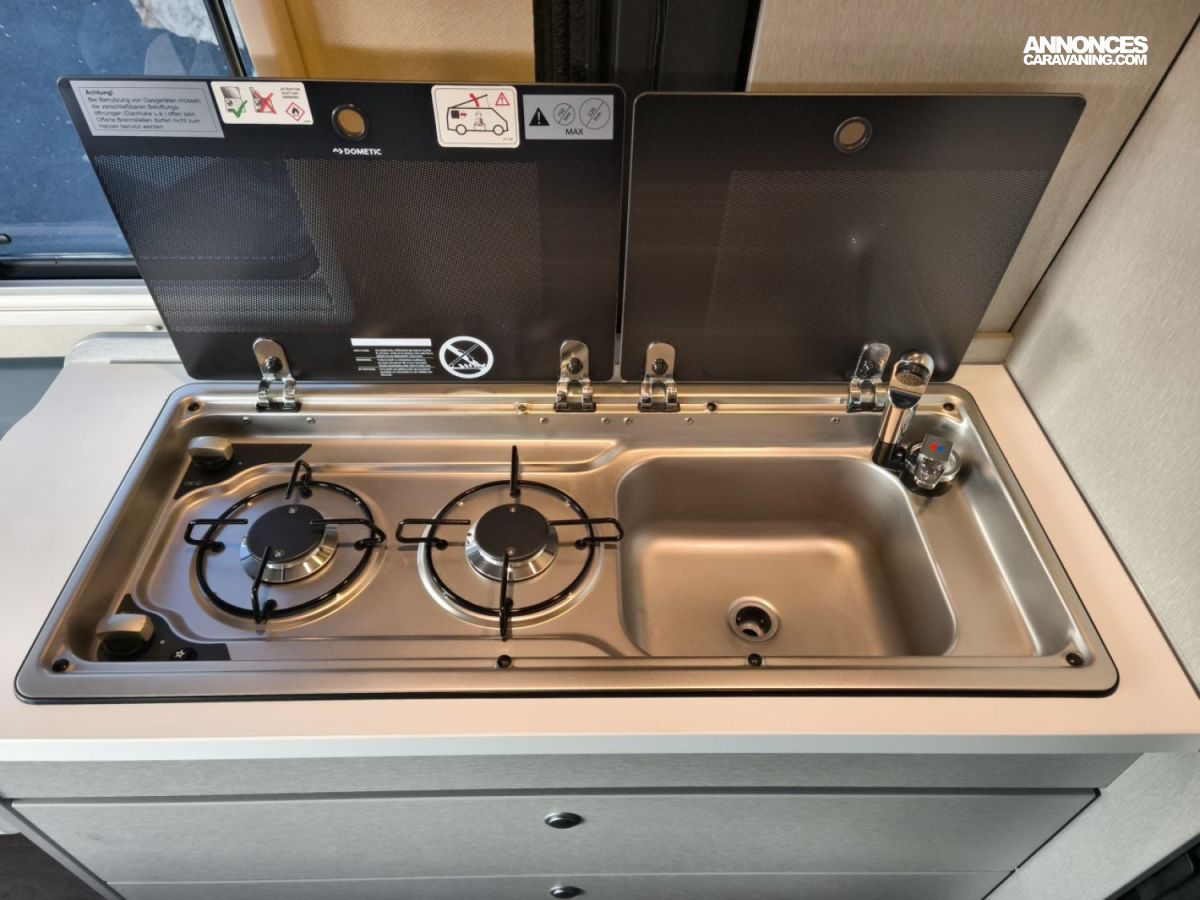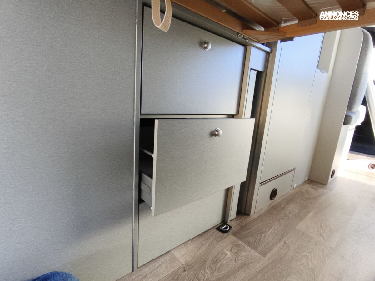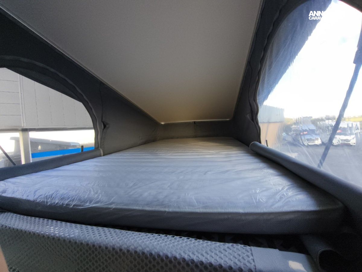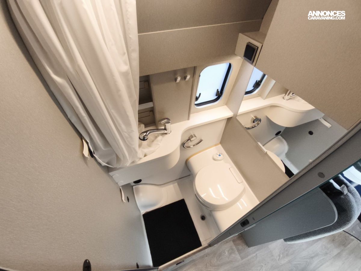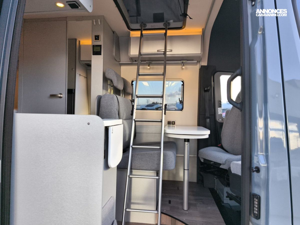 - Pack "Campus" (Régulateur de vitesse actif Distronic Plus avec commandes au volant, boîte de vitesse automatique 9G-Tronic, système multimédia MBUX avec écran tactile 10.25" et caméra de recul + navigation, prédisposition audio avec 4 haut-parleurs, instrumentation avec écran "Pixel-Matrix" Mercedes, volant en cuir, climatisation semi-automatique Tempmatic, store plissés de cabine, prises supplémentaires, réservoir d'eaux usées isolé et chauffé, 2 coussins + pochette de rangement, mobilier coloris blanc, fixations Isofix, sérigraphie noir mat des jupes latérales, store 3m avec boîtier anthracite, toit relevable coloris du véhicule avec couchage double, jantes alu 16" coloris noir avec pneus 4 saisons, bandes décoratives chromées sur la calandre rétroviseurs électriques et dégivrants, réservoir carburant 92L,, peinture coloris gris bleu pastel, motorisation 170cv, tissu "Korfu"),