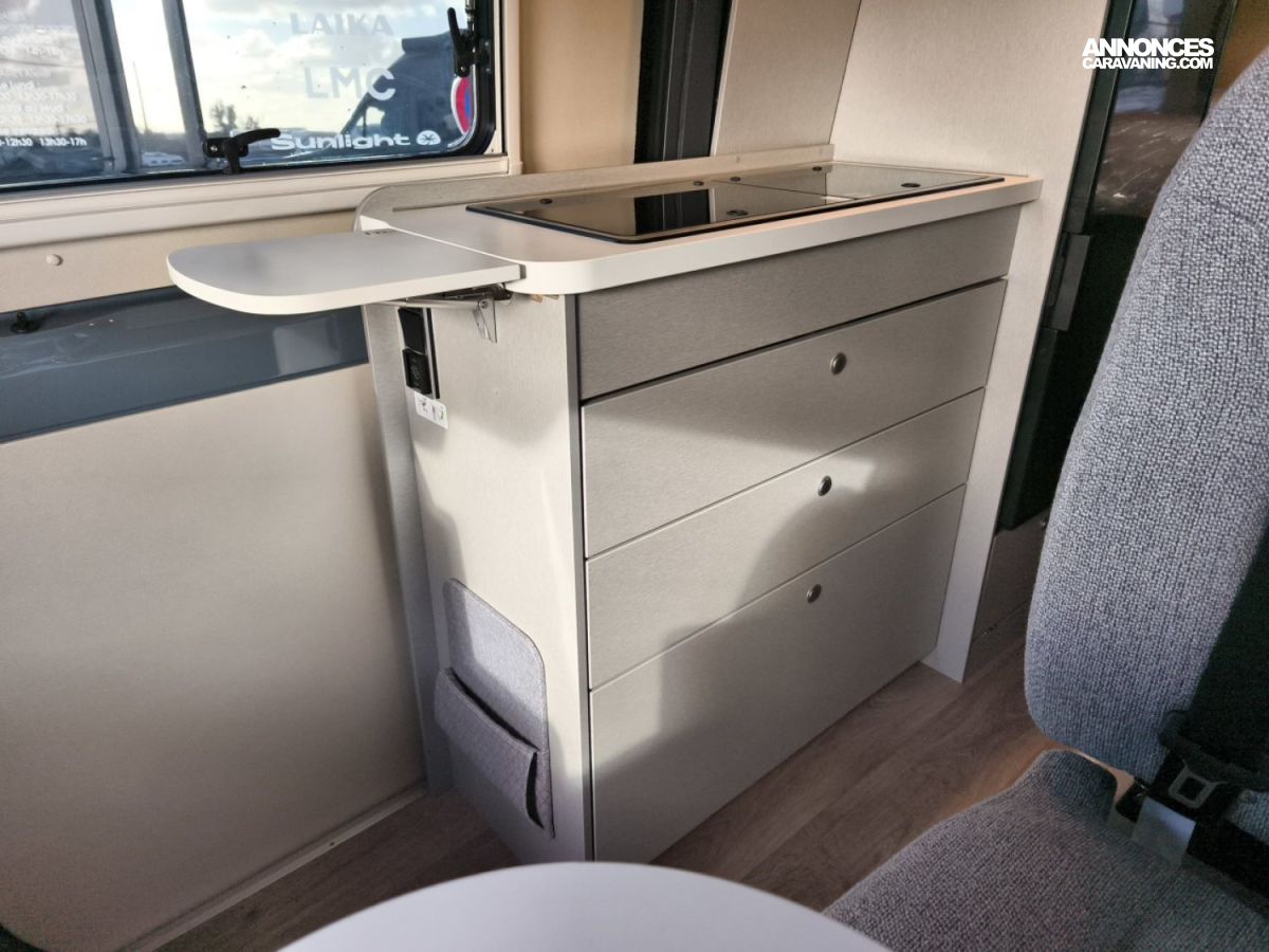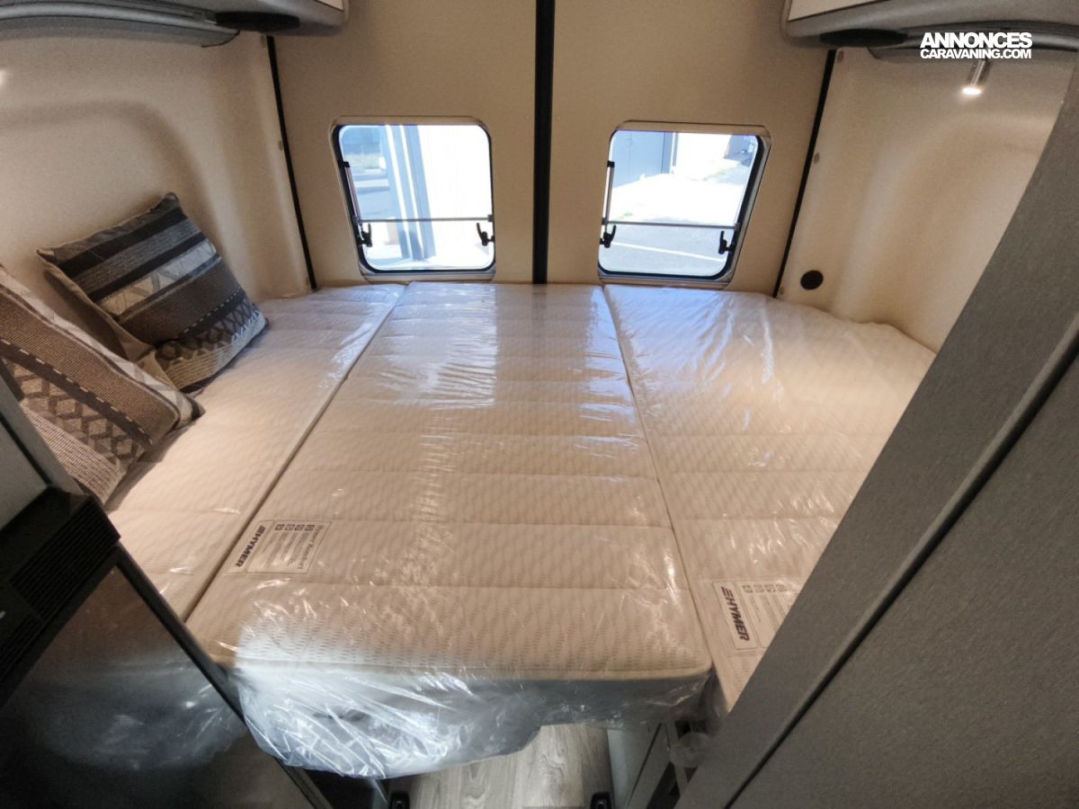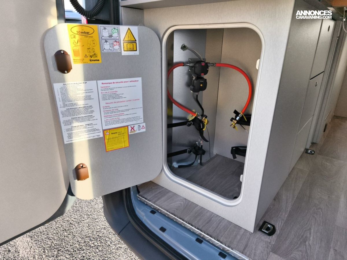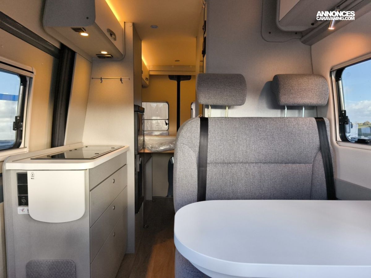 - Pack "Campus" (Régulateur de vitesse actif Distronic Plus avec commandes au volant, boîte de vitesse automatique 9G-Tronic, système multimédia MBUX avec écran tactile 10.25" et caméra de recul + navigation, prédisposition audio avec 4 haut-parleurs, instrumentation avec écran "Pixel-Matrix" Mercedes, volant en cuir, climatisation semi-automatique Tempmatic, store plissés de cabine, prises supplémentaires, réservoir d'eaux usées isolé et chauffé, 2 coussins + pochette de rangement, mobilier coloris blanc, fixations Isofix, sérigraphie noir mat des jupes latérales, store 3m avec boîtier anthracite, toit relevable coloris du véhicule avec couchage double, jantes alu 16" coloris noir avec pneus 4 saisons, bandes décoratives chromées sur la calandre rétroviseurs électriques et dégivrants, réservoir carburant 92L,, peinture coloris gris bleu pastel, motorisation 170cv, tissu "Korfu"),