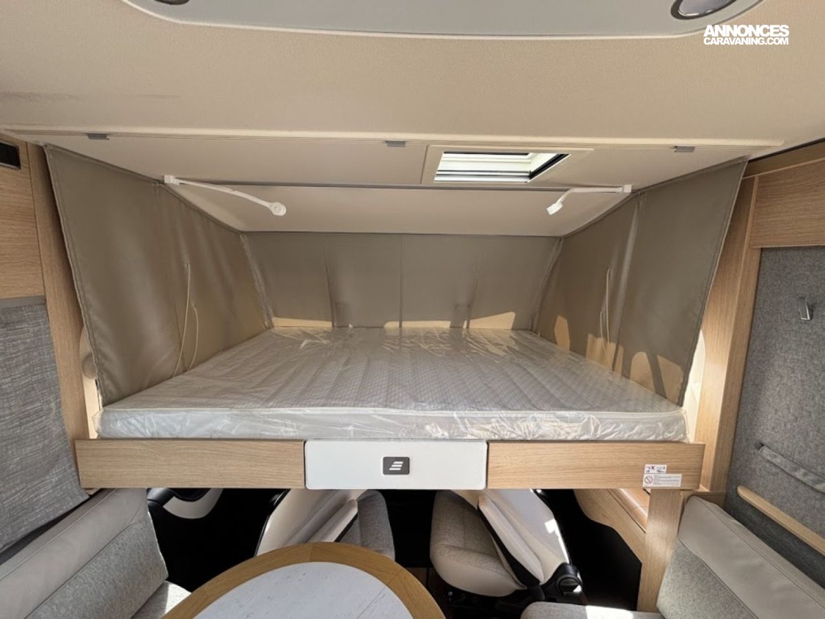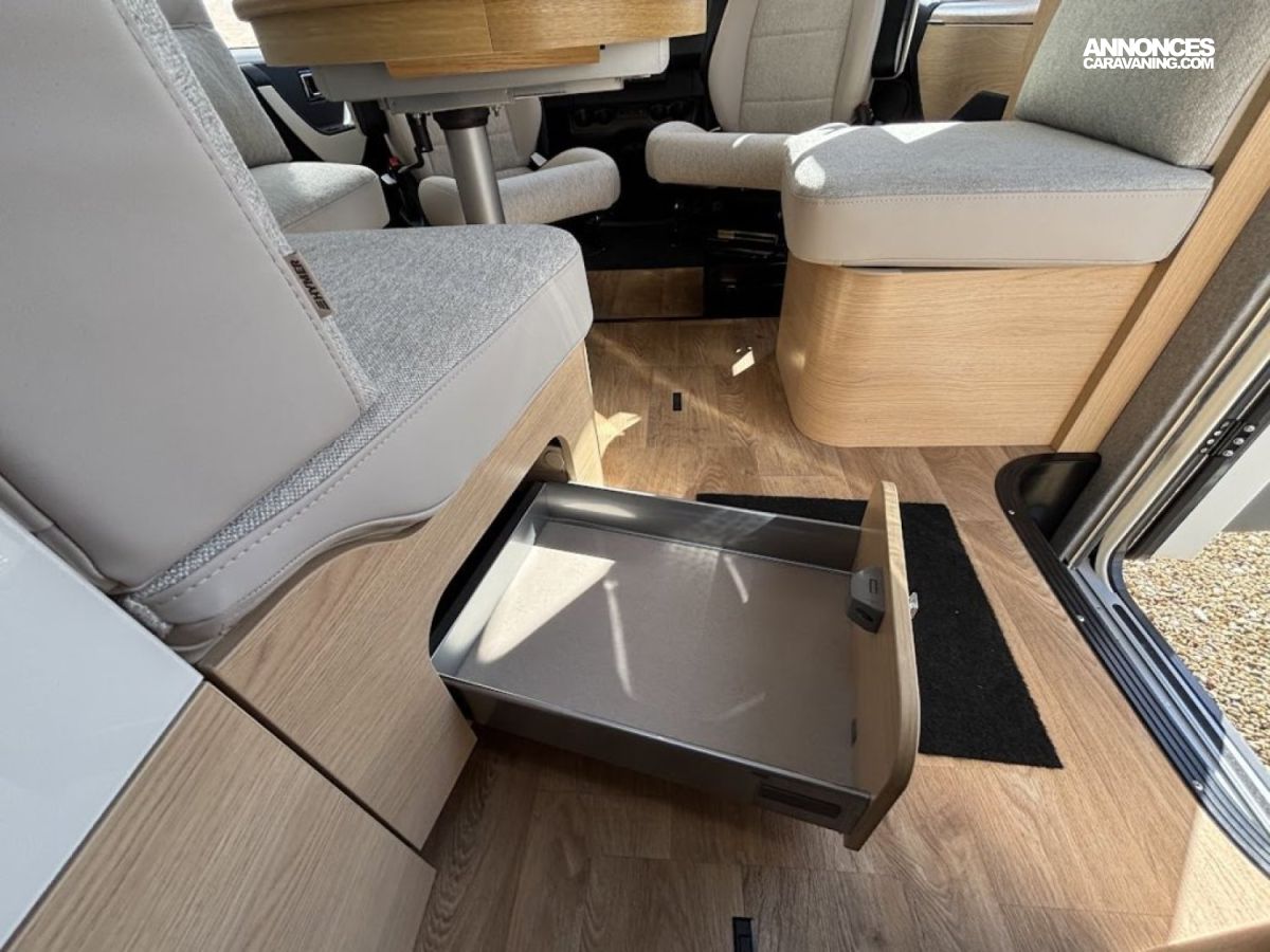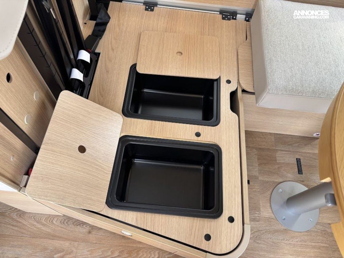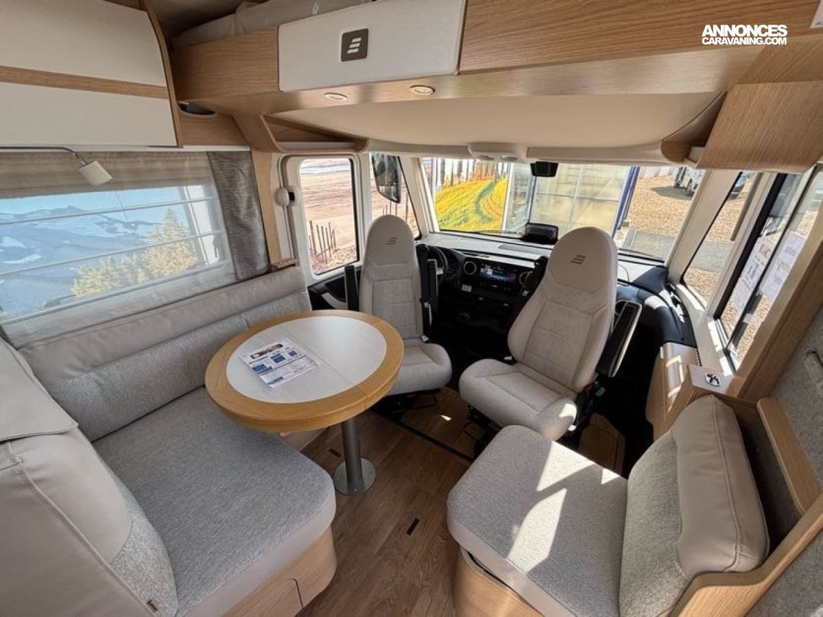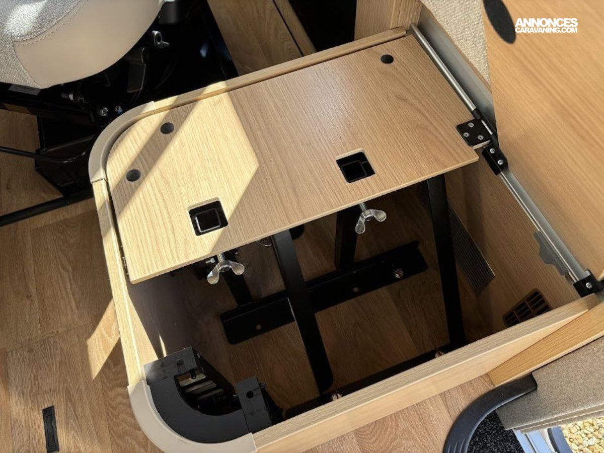 Cuisine en L, Douche indépendante, Douche extérieur, Grande soute, Lit central, lit pavillon, Salon avant sièges pivotants, Salon en L, Soute réglable en hauteur, WC Cassette.