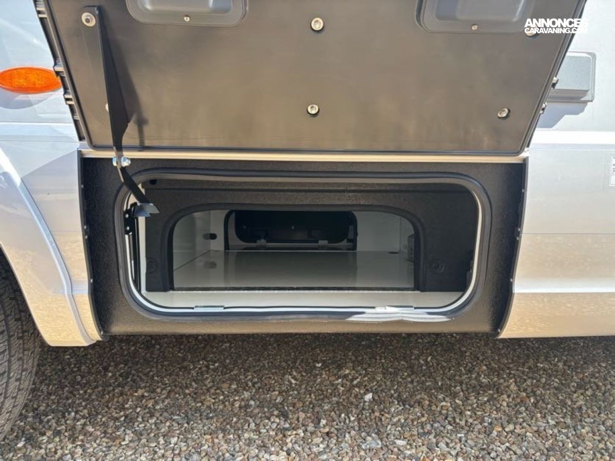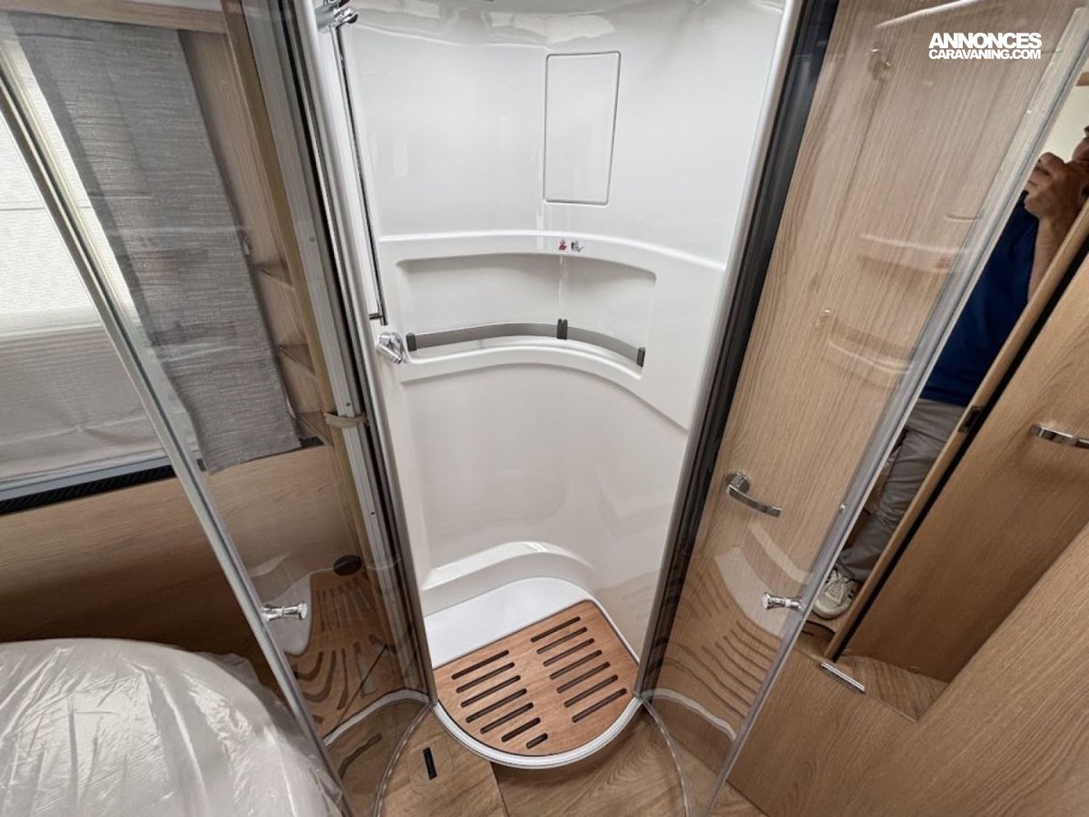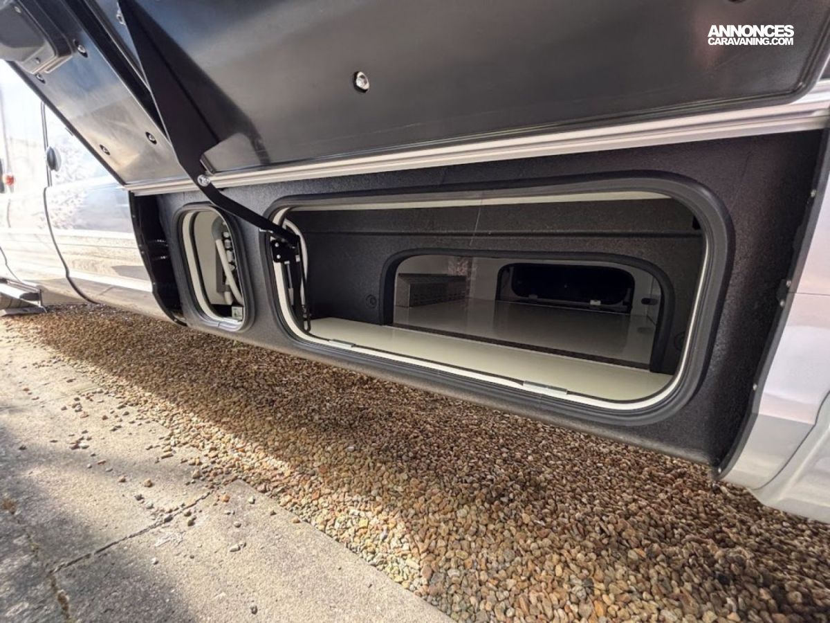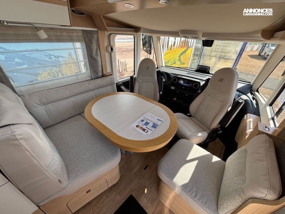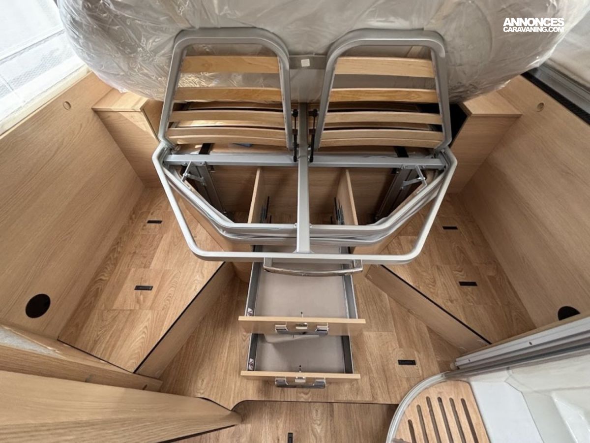 Cuisine en L, Douche indépendante, Douche extérieur, Grande soute, Lit central, lit pavillon, Salon avant sièges pivotants, Salon en L, Soute réglable en hauteur, WC Cassette.