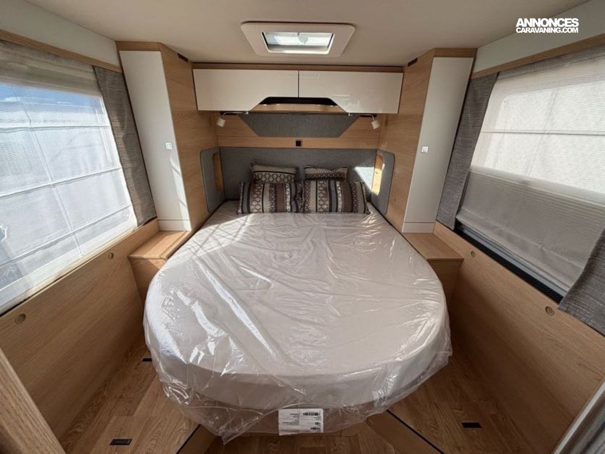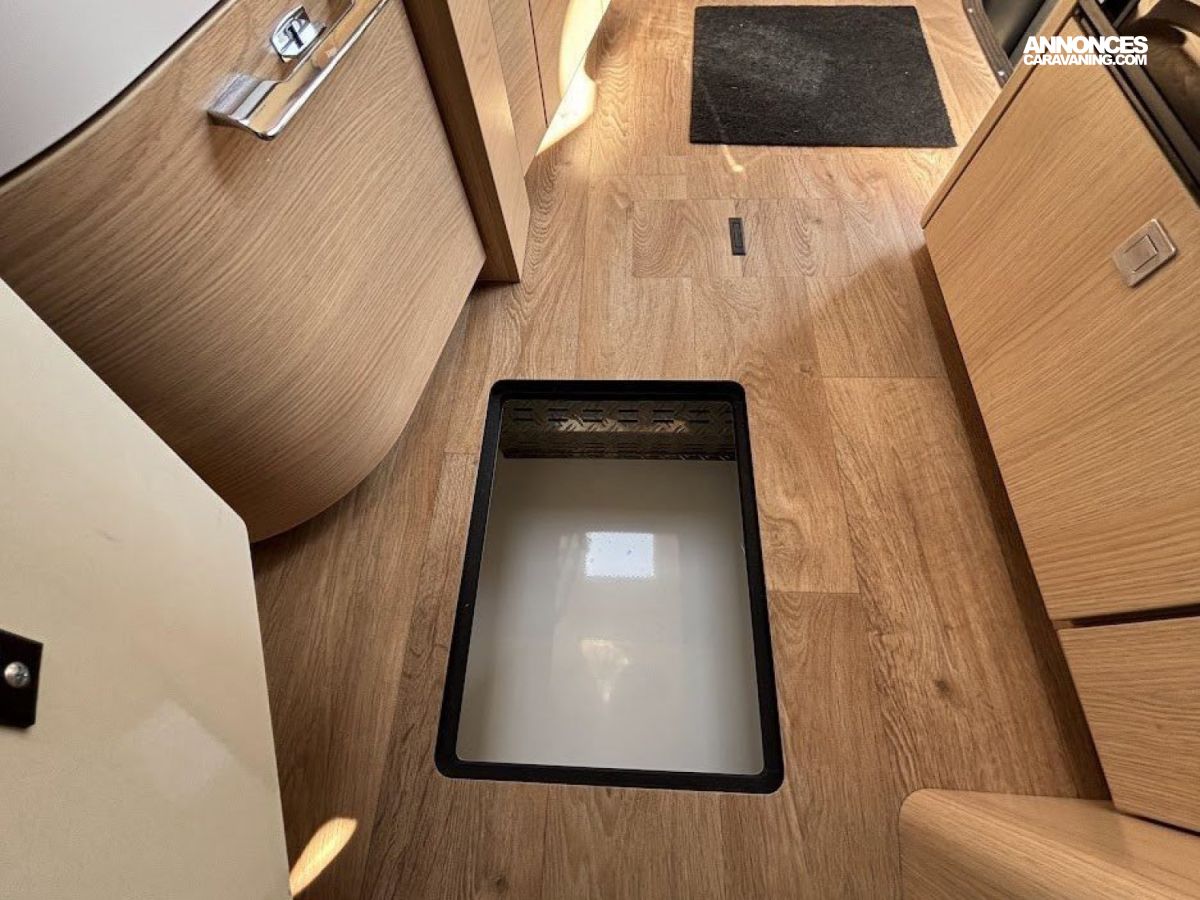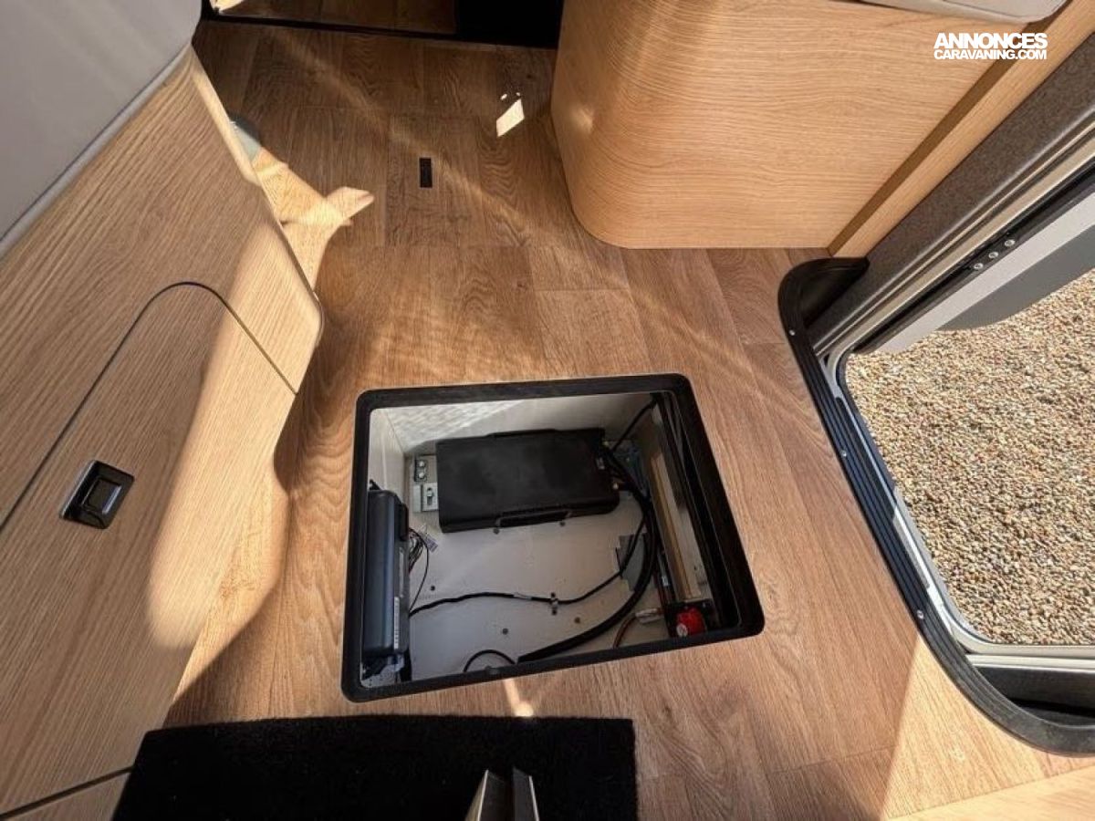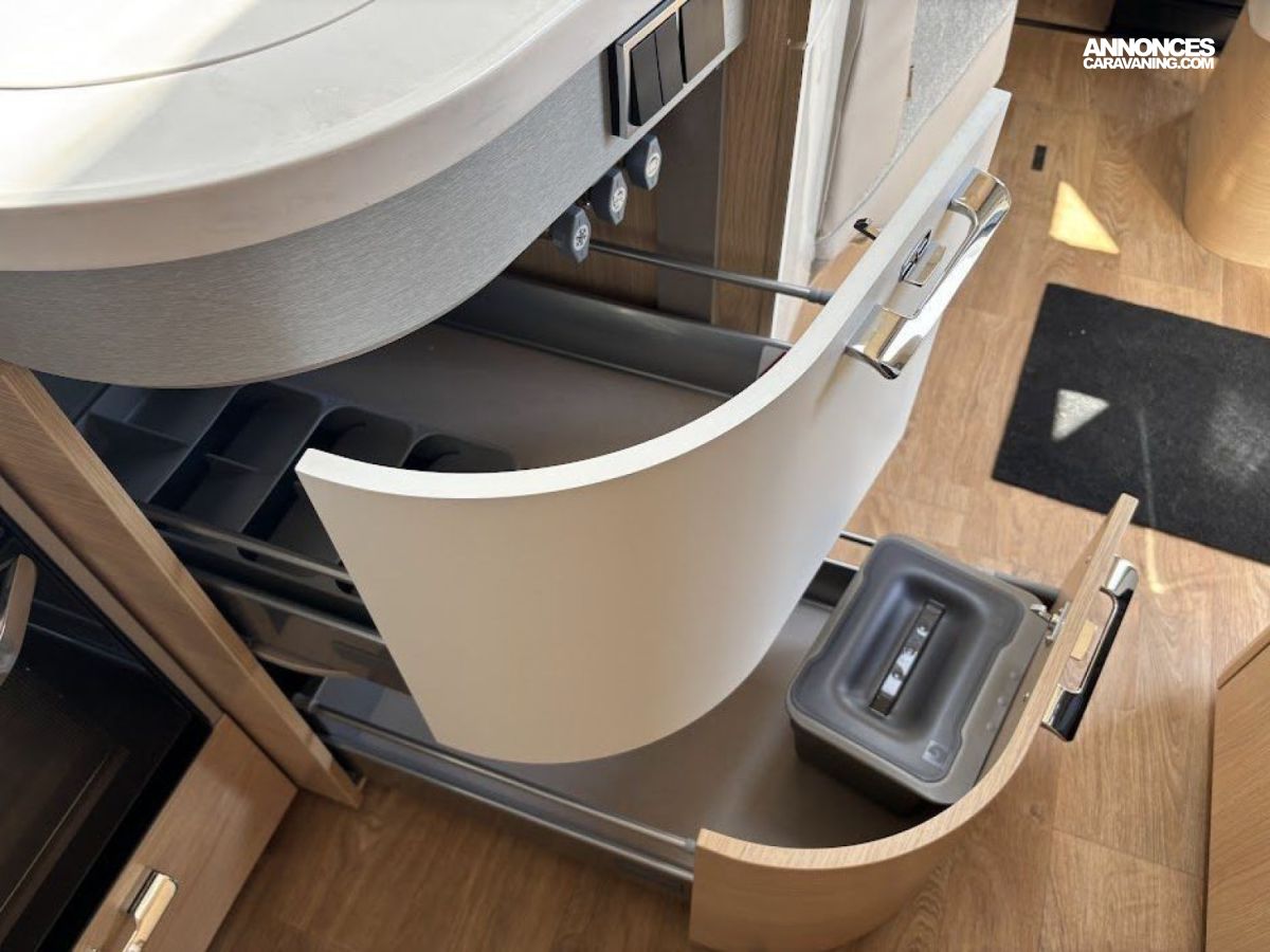 Cuisine en L, Douche indépendante, Douche extérieur, Grande soute, Lit central, lit pavillon, Salon avant sièges pivotants, Salon en L, Soute réglable en hauteur, WC Cassette.
