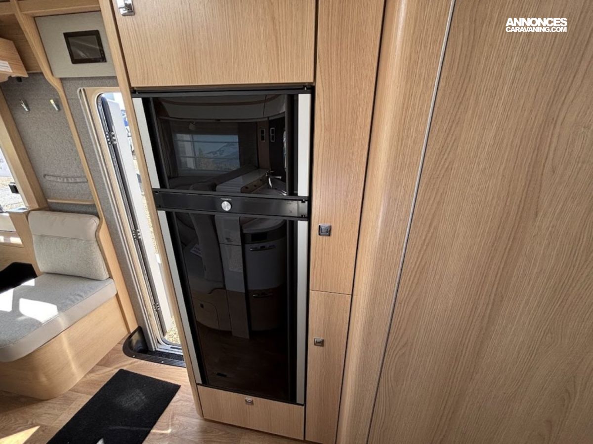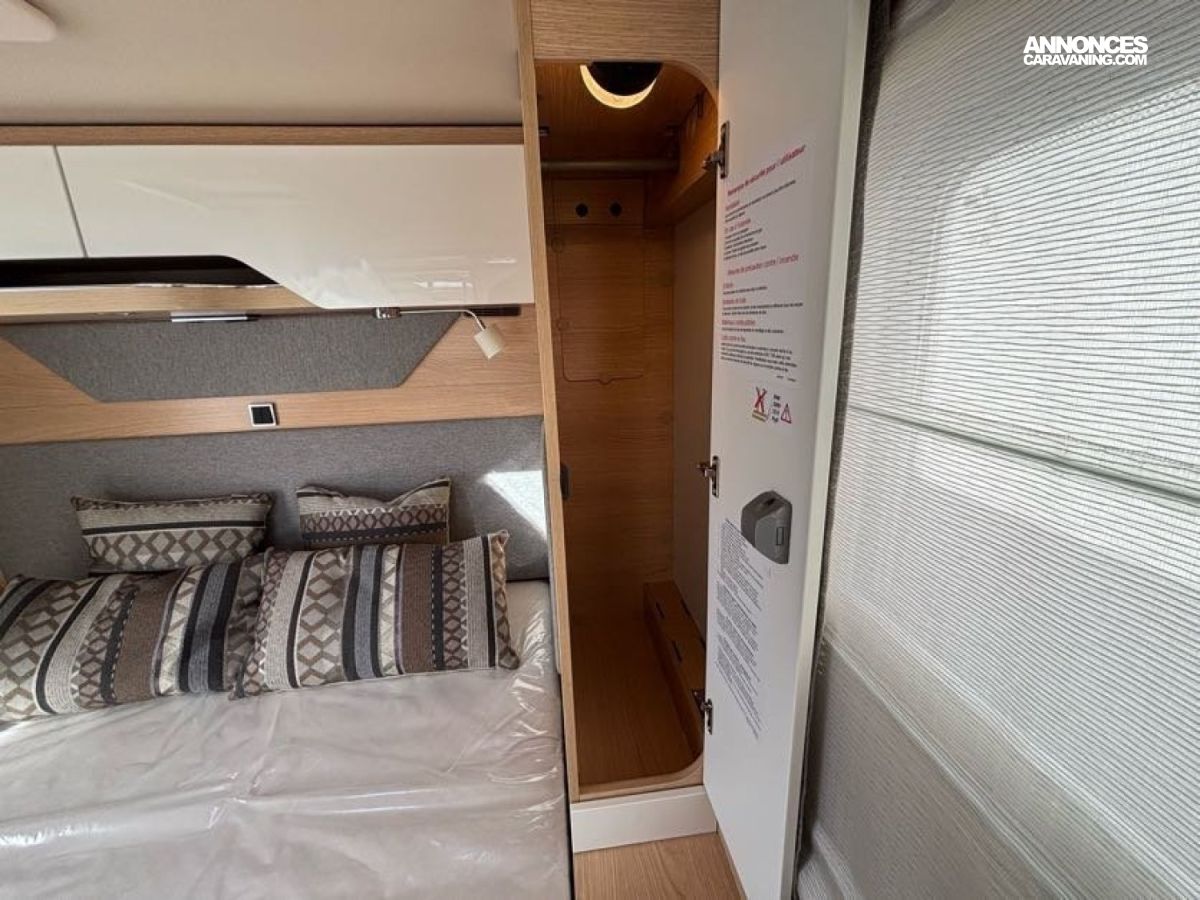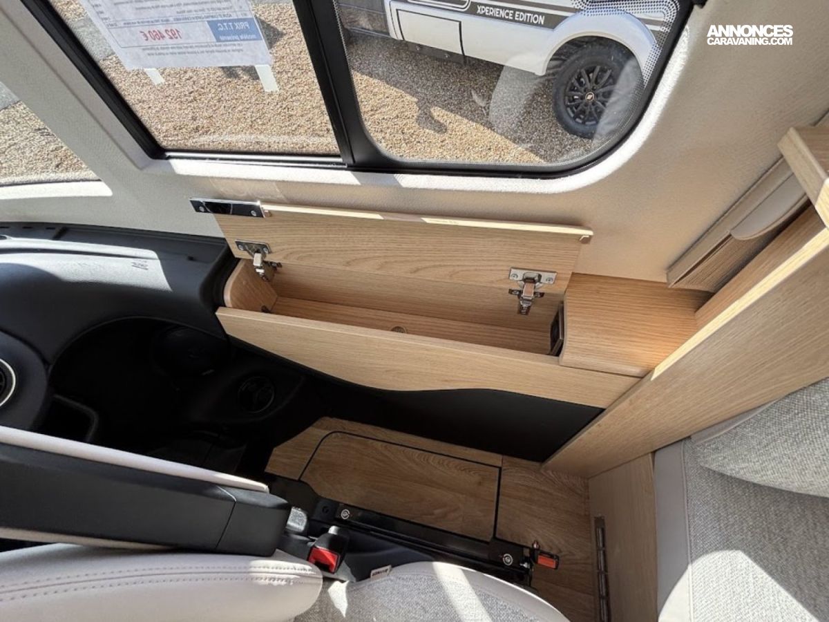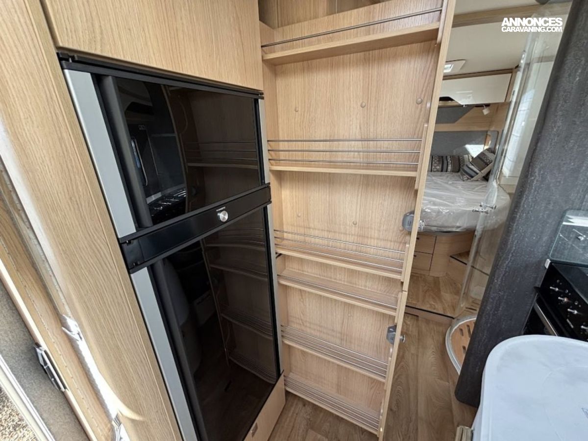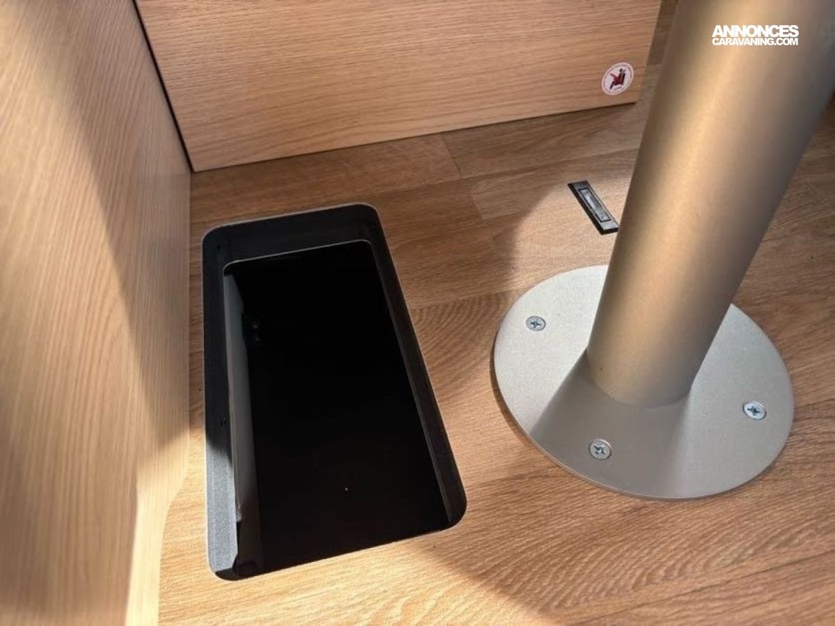 Cuisine en L, Douche indépendante, Douche extérieur, Grande soute, Lit central, lit pavillon, Salon avant sièges pivotants, Salon en L, Soute réglable en hauteur, WC Cassette.