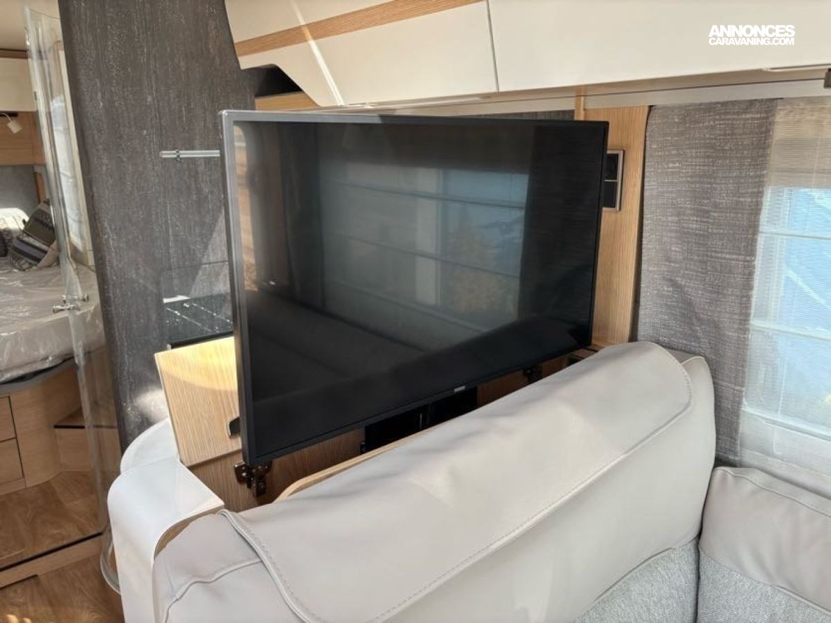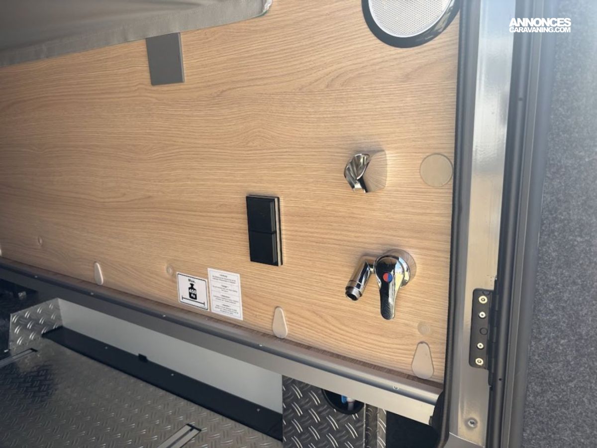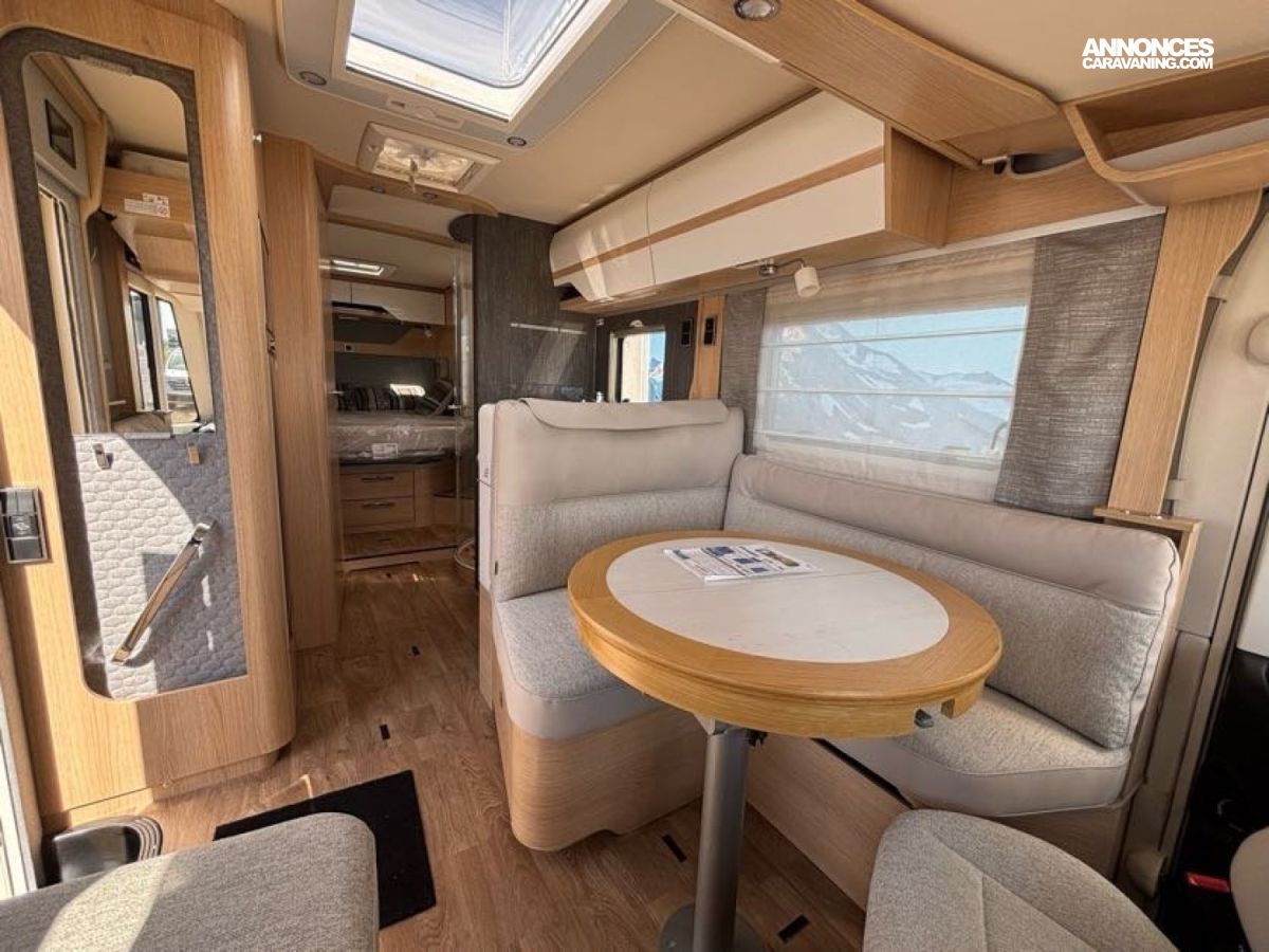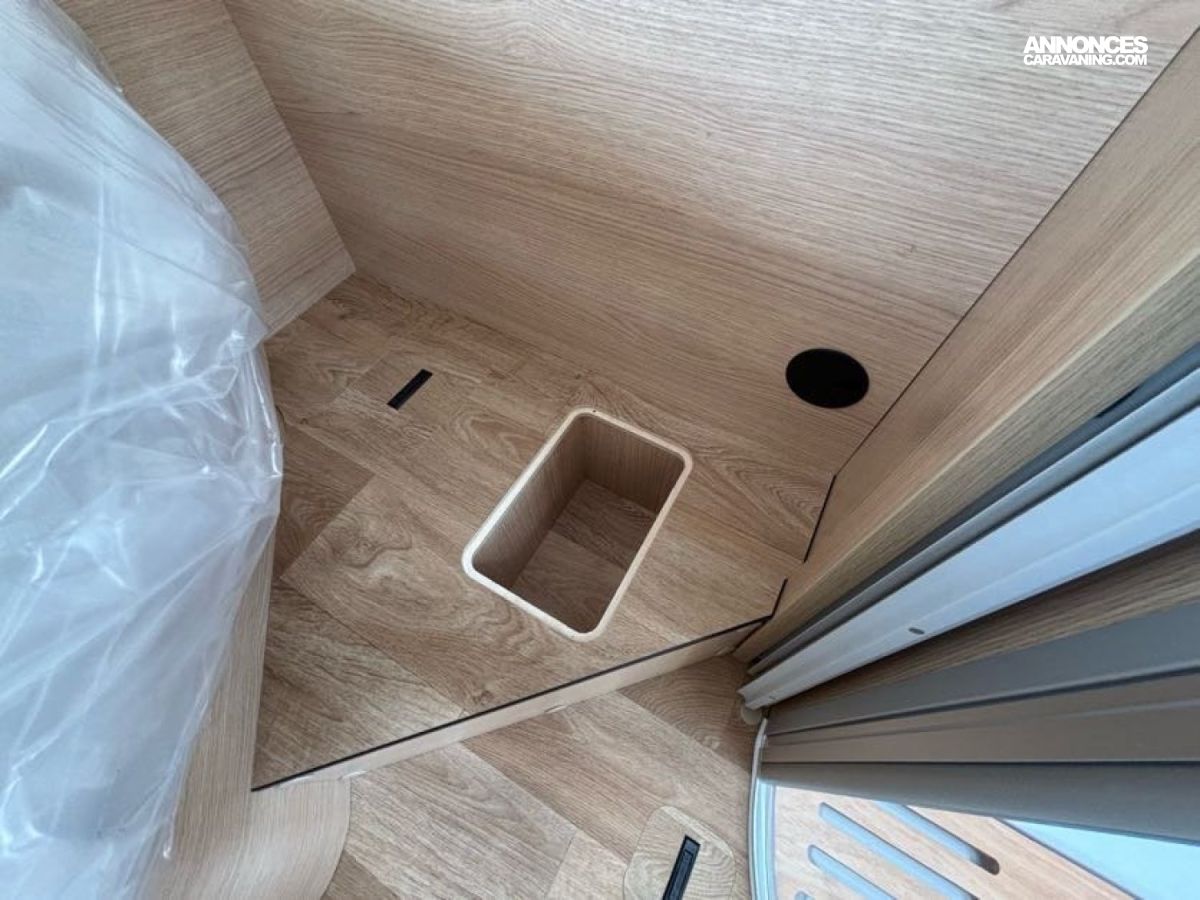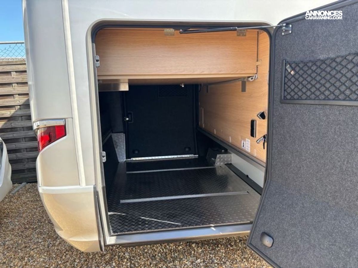 Cuisine en L, Douche indépendante, Douche extérieur, Grande soute, Lit central, lit pavillon, Salon avant sièges pivotants, Salon en L, Soute réglable en hauteur, WC Cassette.
