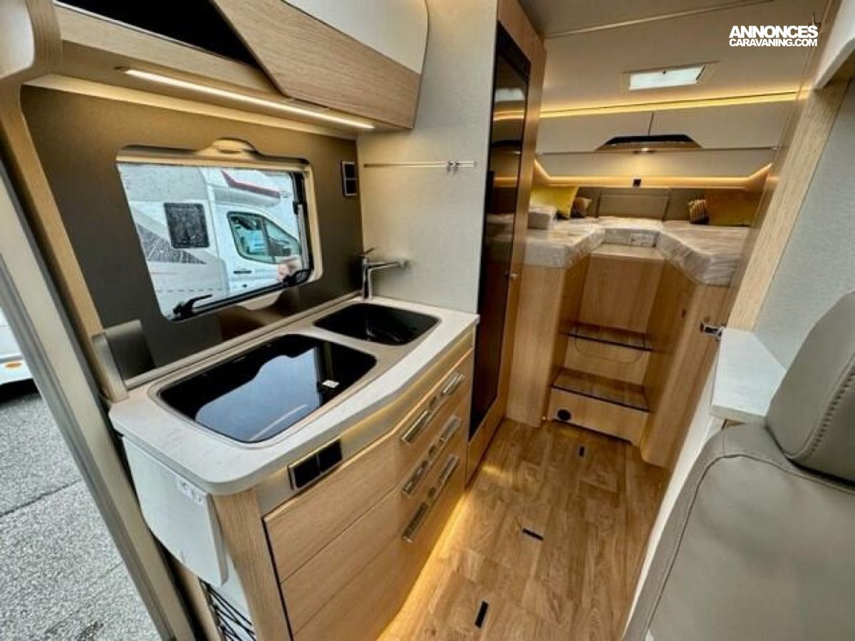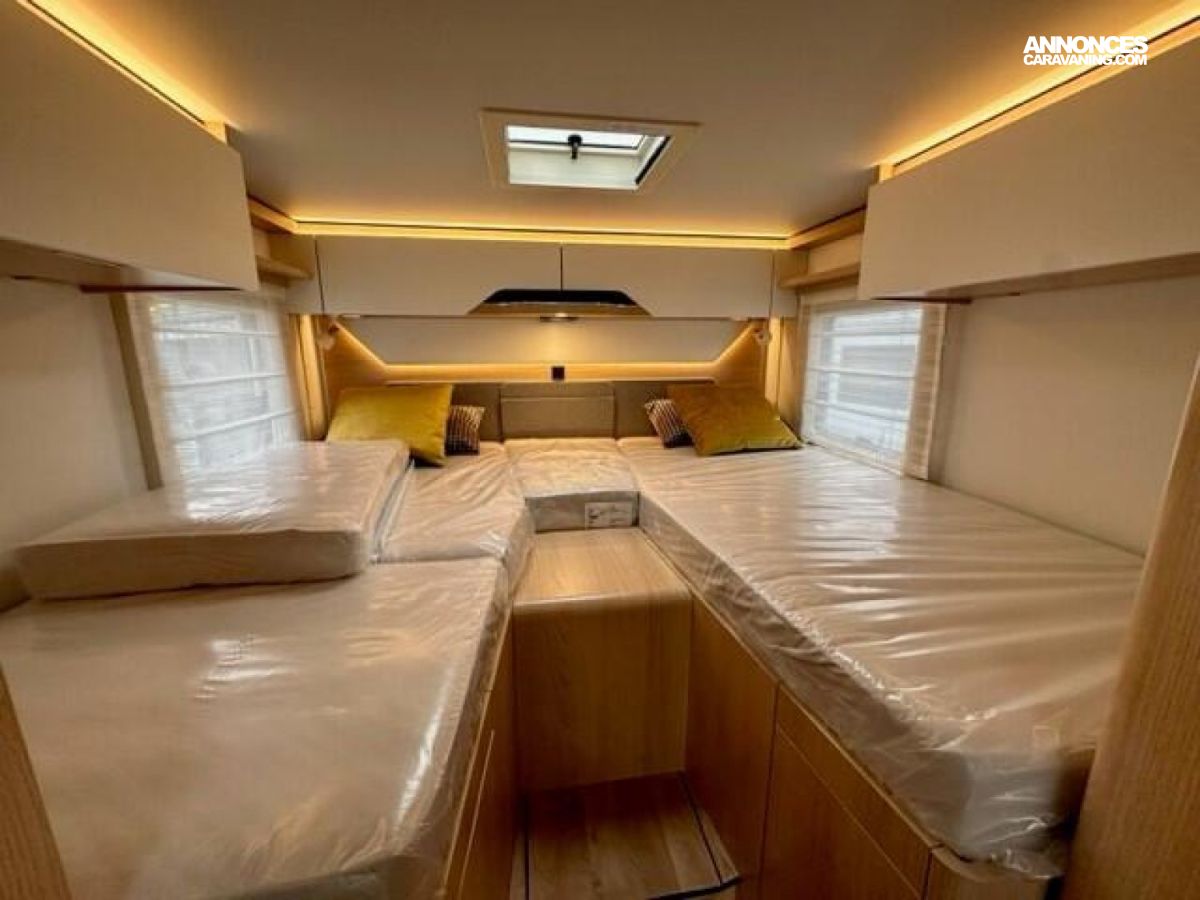 Feux antibrouillard halogènes (290) - douchette extérieure (290) + Chauffage à air pulsé au gaz 6 kW avec chauffe-eau et résistance 1800 W (595) - Pré-équipement panneau solaire et antenne sat (200) + Support écran plat 32" (375) Tissus Dalana (1000) Ventilation des toilettes (295) + Coussin supplémentaire pour lits jumeaux avec accès confort (455) fermeture centralisée (700) + Volet de protection pour l'intimité pour pare-brise (volet de bas en haut) + Marchepied électrique pour porte conducteur (455) - Porte cellule Confort fermeture 2 points avec baie, store occultant et poubelle intégrés (400) + Tiroir et bac comme espaces de rangement dans la dînette + OFFRE SUR DEMONSTRATION NEUF 2026 : 5850 €