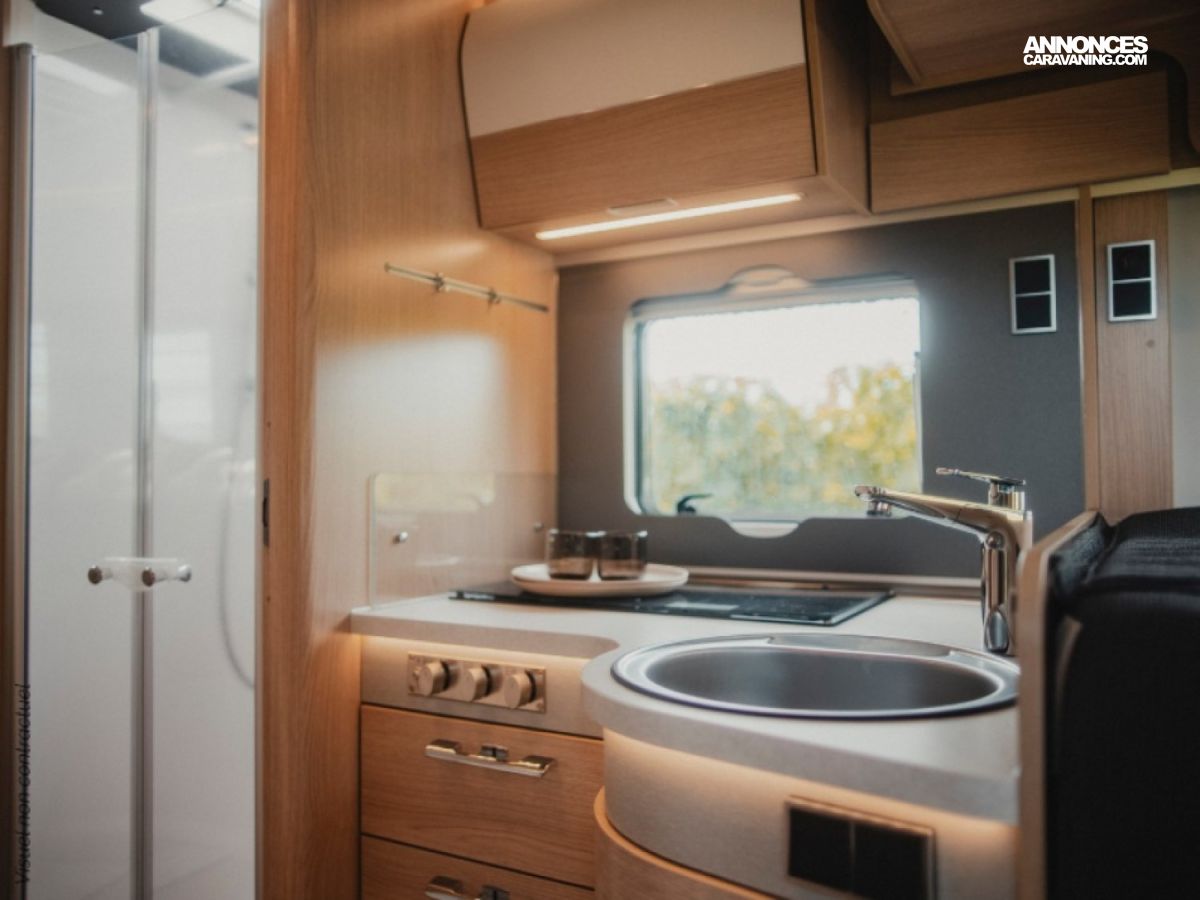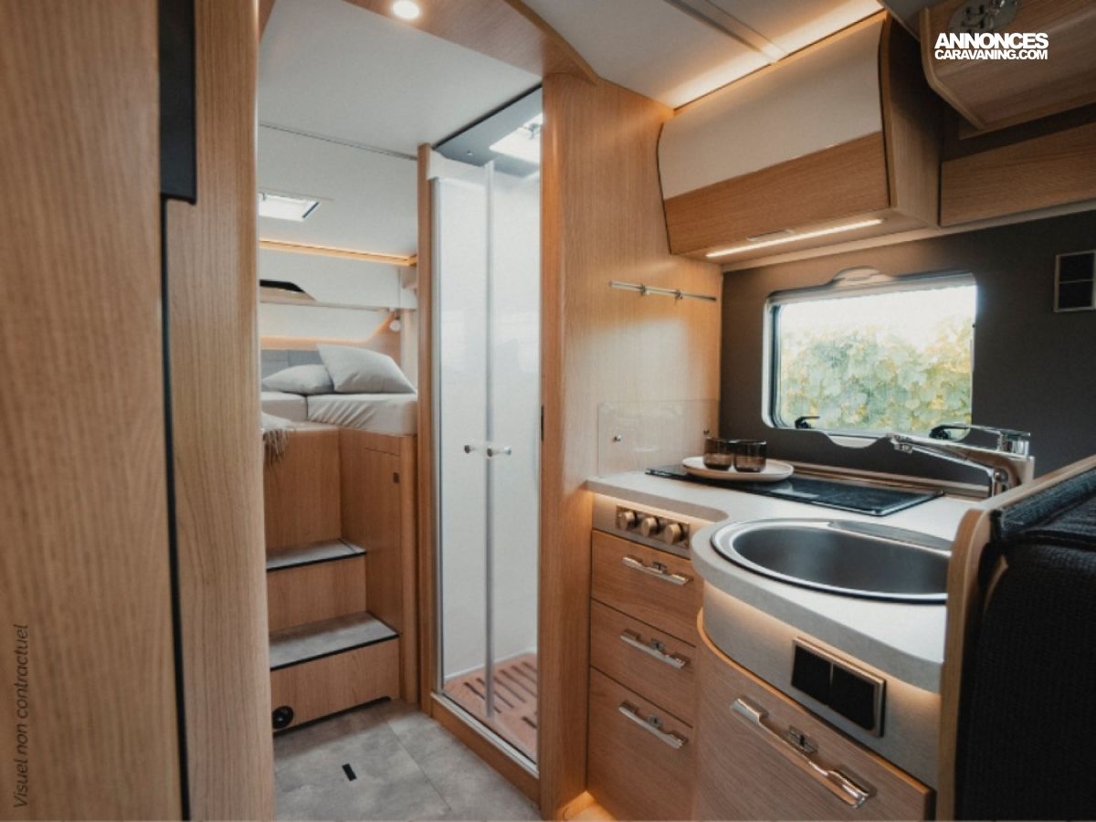 Store extérieur 400 x 250 cm avec adaptateur, boîtier noir Régulateur de vitesse actif DISTRONIC PLUS avec commandes au volant Couleur extérieure cellule : argent Crystal métallisé (y compris casquette) Tiroir et bac comme espaces de rangement dans la dînette Dînette en L confort avec coussins lounge, table coulissante longitudinalement / transversalement et 2 ceintures 3 points intégrées Transformation dînette en L en couchage avec table au pied télescopique Caillebotis de douche avec surface en bois Sérigraphie BlackLine Boîte de vitesses automatique 9G-TRONIC incluant la fonction Hold Jantes alliage 16'' Borbet coloris noir et pneus 4 saisons Volant cuir (uniquement avec la boîte de vitesses automatique) Draps-housses sur mesure pour lits arrière adaptés aux contours du matelas Coussins avec housses (4 pièces) Prises supplémentaires : 4 x 230 V (2 x garage ; 1 x dînette ; 1 x lit) / 1 x 12 V / 1 x double USB (y compris crédence cuisine) Système multimédia MBUX 10,25" avec caméra de recul, commande vocale et écran tactile, y compris navigation & intégration pour smartphone Support écran plat 32" Smart TV LED 32" avec haut-parleurs intégrés, télécommande, lecteur DVD, "Smart-Multimedia-System" HYMER avec Bluetooth (DVB-T / C, DVB-S2), récepteur inclus Pack capteurs HYMER Connect comprenant 1x capteur de niveau de gaz, 1x capteur de température et 2x capteurs de contact Système Ambient Light : système d'éclairage à plusieurs niveaux avec commande dynamique et individuelle (y compris l'intensité de la lumière) ainsi qu'un balisage au sol Mercedes-Benz Sprinter 4,43 t - 417 CDI - 125 KW/170 ch - Euro VI-E Couleur extérieure cabine : noir Obsidienne (métallisé) Bandes décoratives chromées sur la calandre Spoiler, éléments face avant et cadre de la calandre peints couleur carrosserie Assistant reconnaissance des panneaux de signalisation.