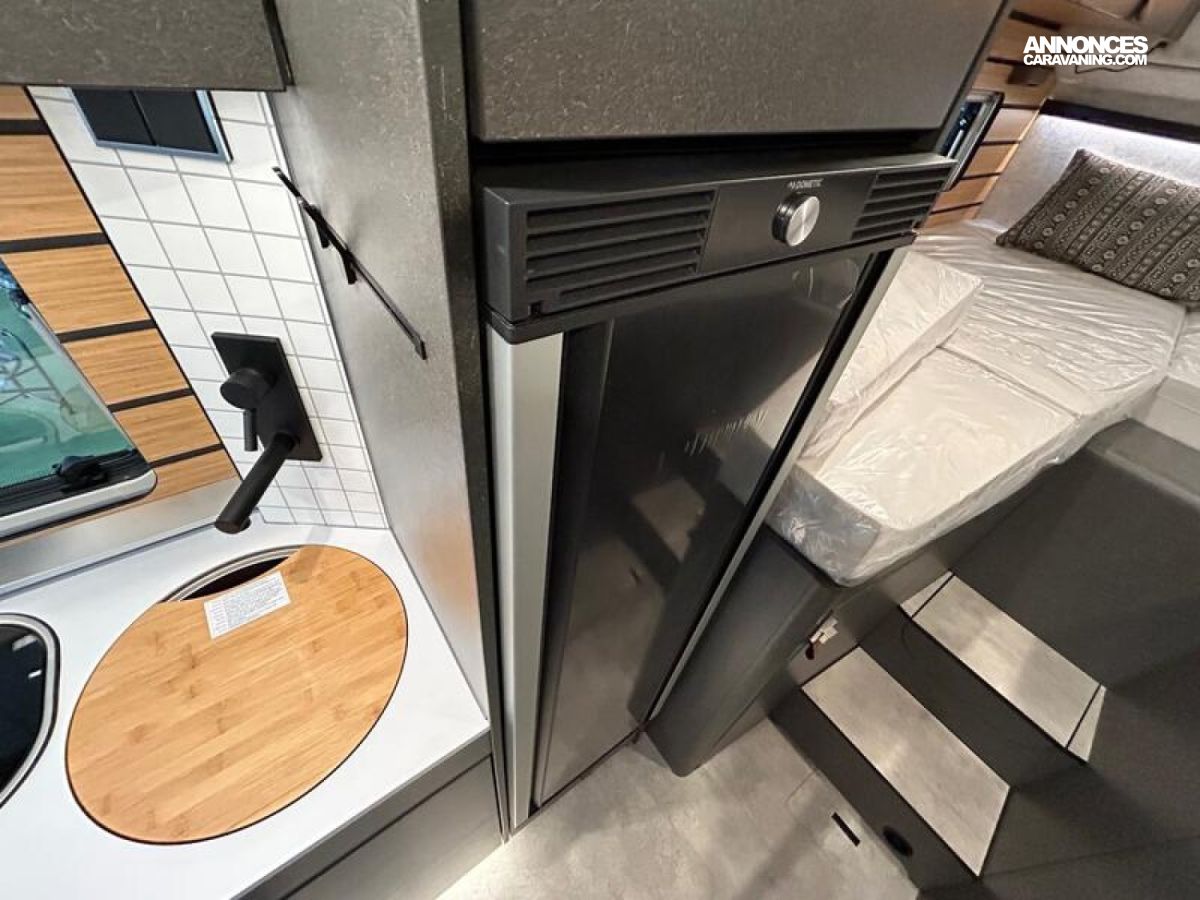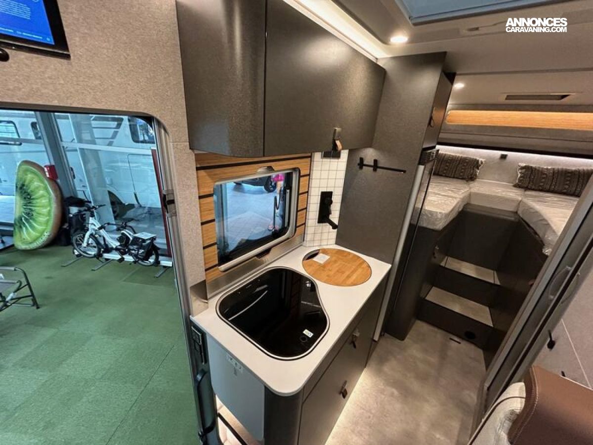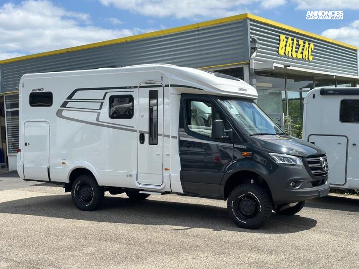 Couleur extérieure cabine : gris / noir + Transmission intégrale 4x4 permanente + réservoir carburant 93 l + sièges chauffants Mercedes + Protection sous châssis pour moteur et réservoir d'eau + Système WET WIPER + Cuir / tissu MORENO + Limiteur de vitesse en descente Downhill Speed Regulation (mode Offroad) + Porte cellule confort avec baie, store occultant, poubelle intégrée et double verrouillage + Roue de secours 16'' avec pneu tout-terrain (All-Terrain) sur jante tôle et support sur paroi arrière + Toit en polyester renforcé + Serrure de sécurité pour porte cellule + Ventilation des toilettes + Fermeture centralisée des portes conducteur, cellule et soute garage + Four séparé au-dessus du réfrigérateur + Dinette en L confort + Douche extérieure dans le garage + HYMER Smart Battery System 2.0 – extension : deuxième module batterie cellule 80 Ah LFP avec chargeur supplémentaire (capacité totale 160 Ah) + Résistance électrique de 1 800 W (pour chauffage à air chaud diesel de 6 kW) + Panneaux solaires 2 x 95 W avec régulateur MPPT et écran d'affichage + Filtre pour le circuit d'eau propre + Routeur Wi-Fi 5G avec antenne extérieure et emplacement double SIM (carte SIM non incluse) + Coussin supplémentaire pour lits jumeaux avec accès confort + Transformation dînette en L en couchage (table au pied télescopique + coussin supplémentaire + utilisation du siège conducteur) : 24495 €