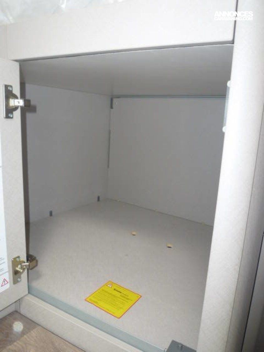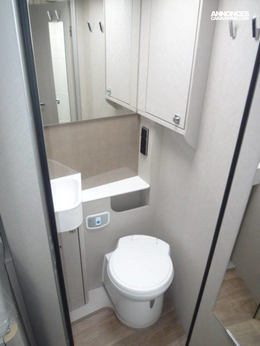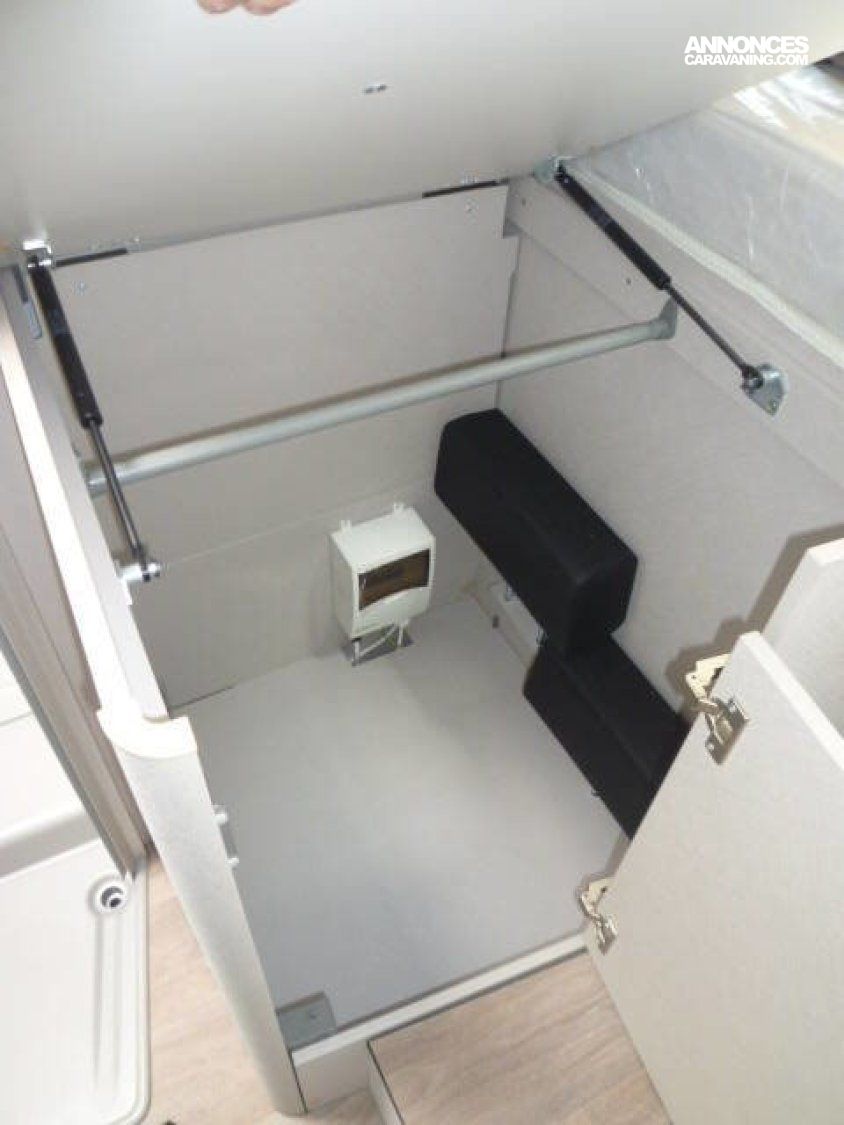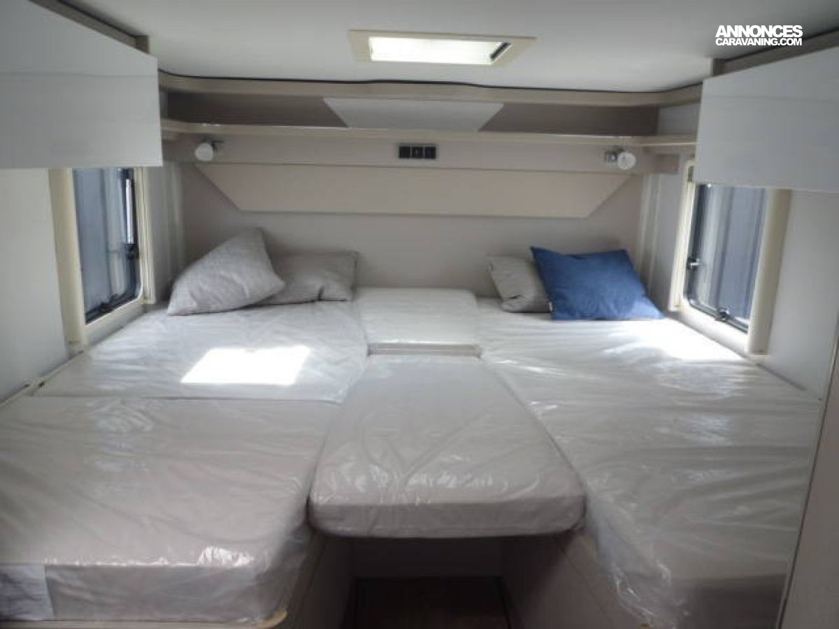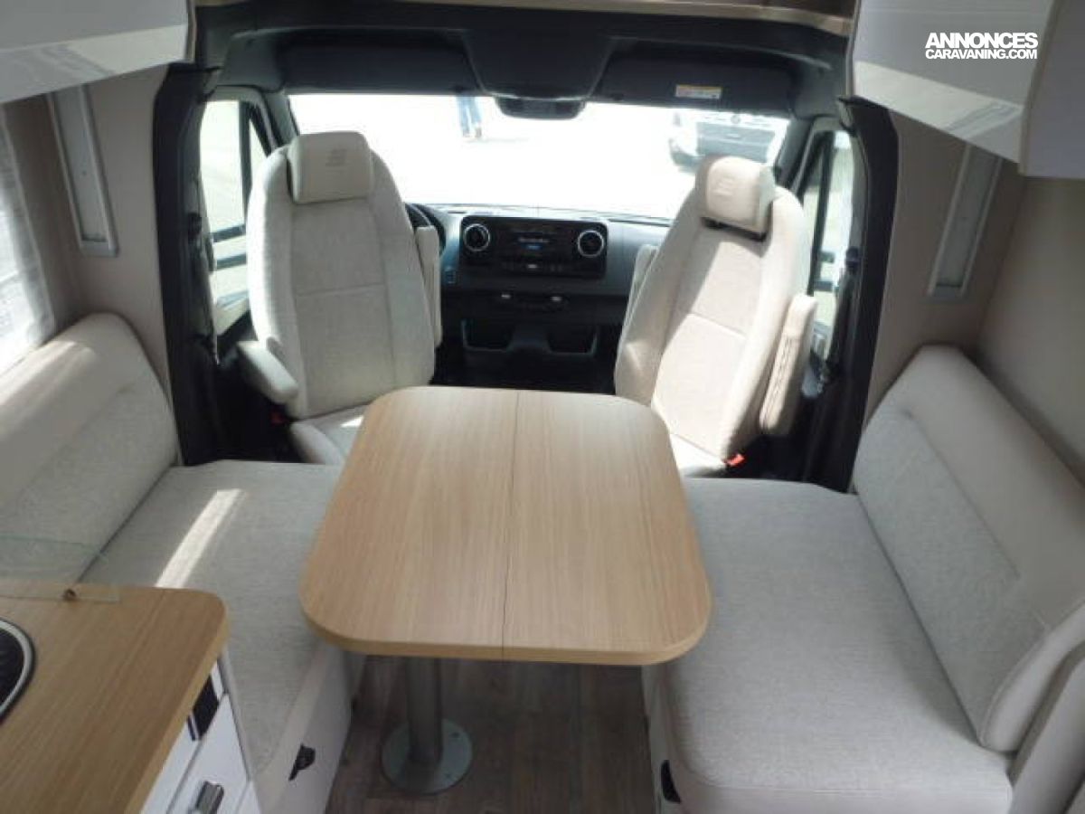 Cuisine en L, Douche indépendante, Grande soute, lit jumeaux, lit pavillon, Salon avant banquettes face à face, Salon avant sièges pivotants, WC Cassette.