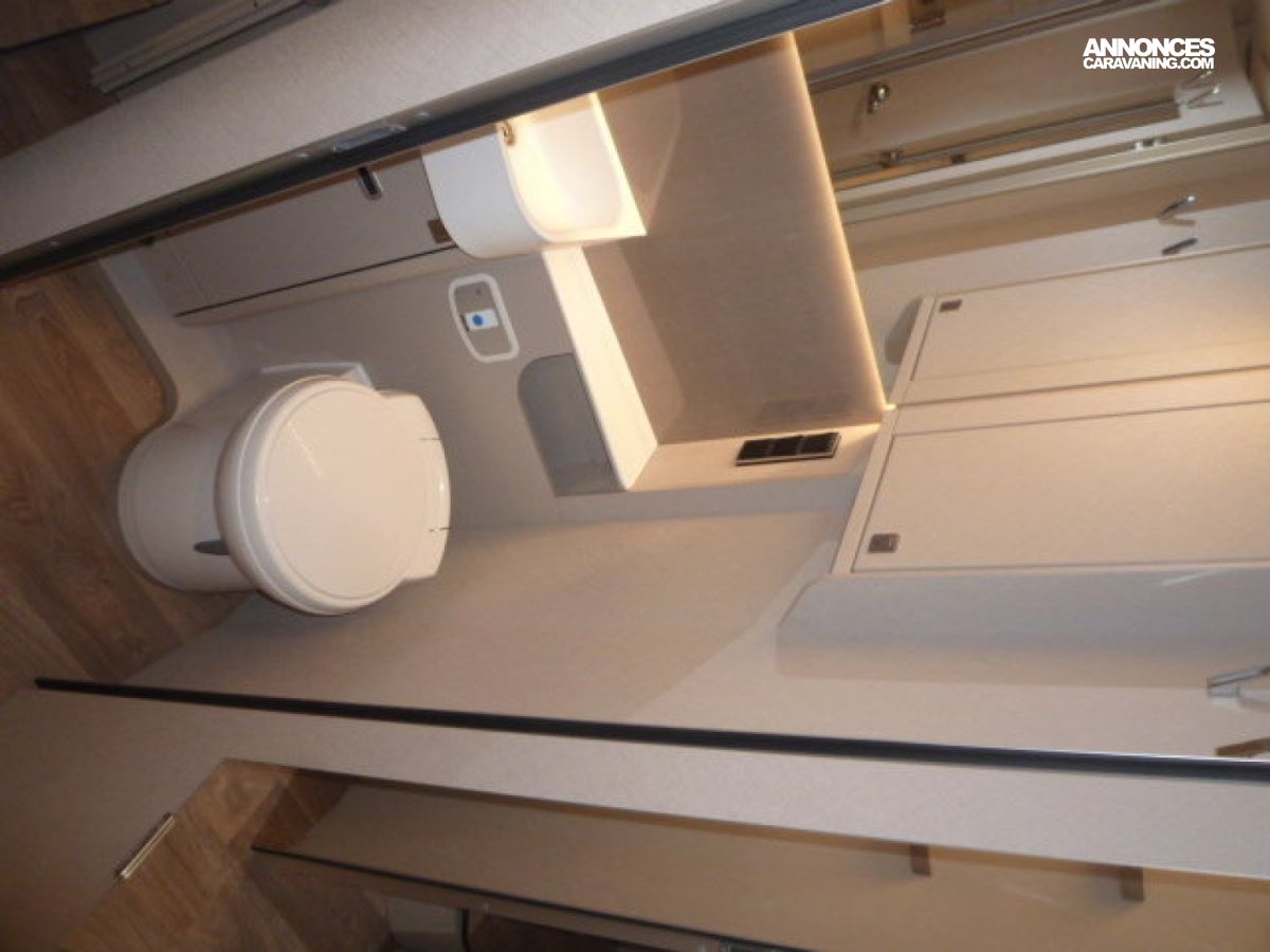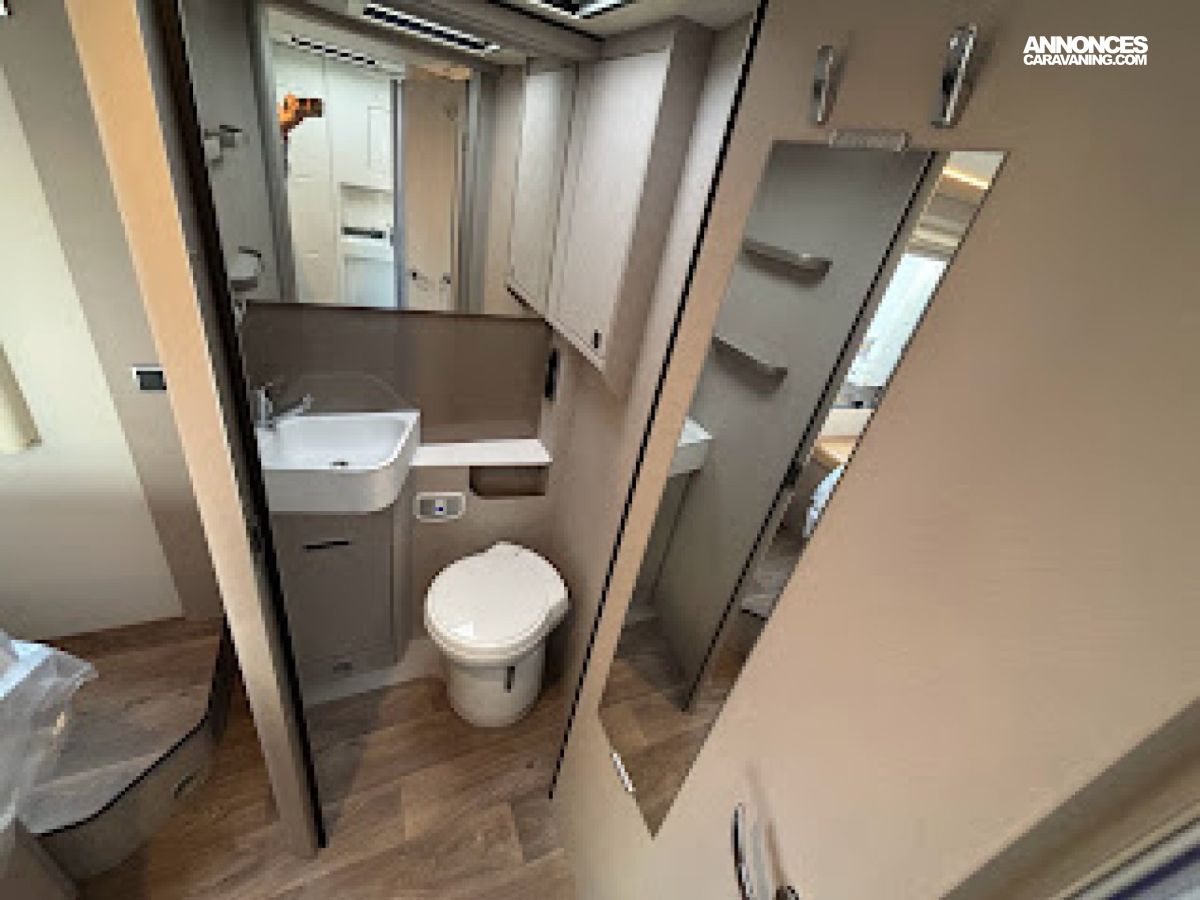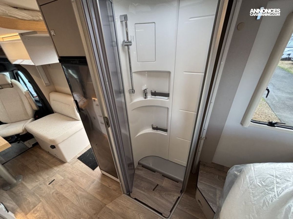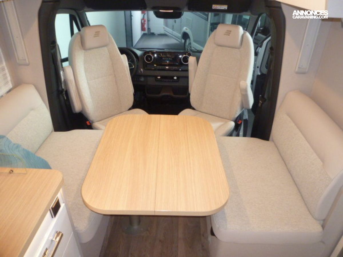 Cuisine en L, Douche indépendante, Lit central, lit pavillon, Salon avant banquettes face à face, Salon avant sièges pivotants, Soute, WC Cassette.