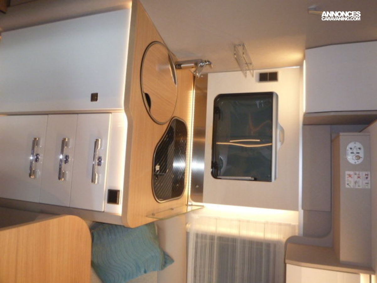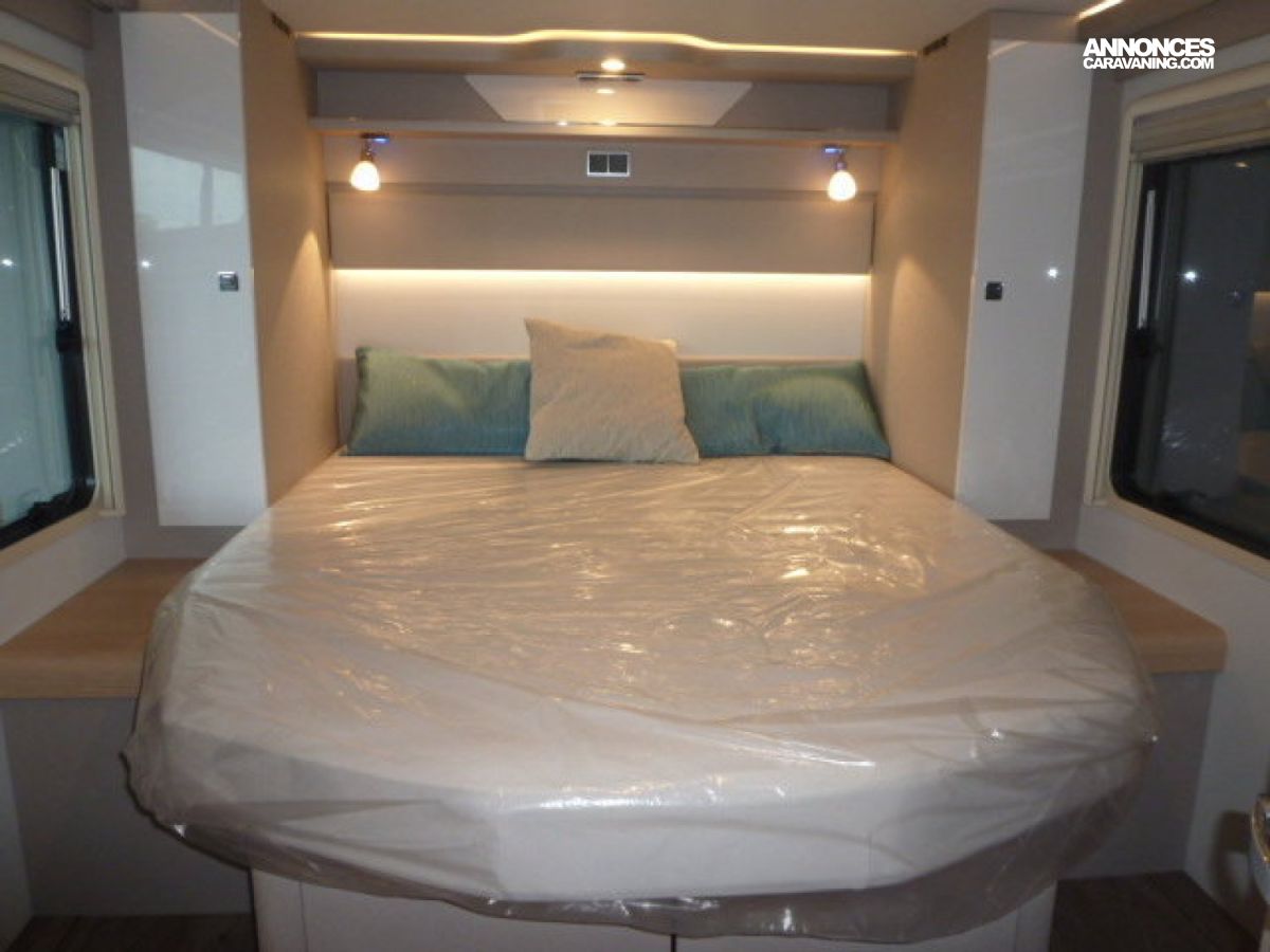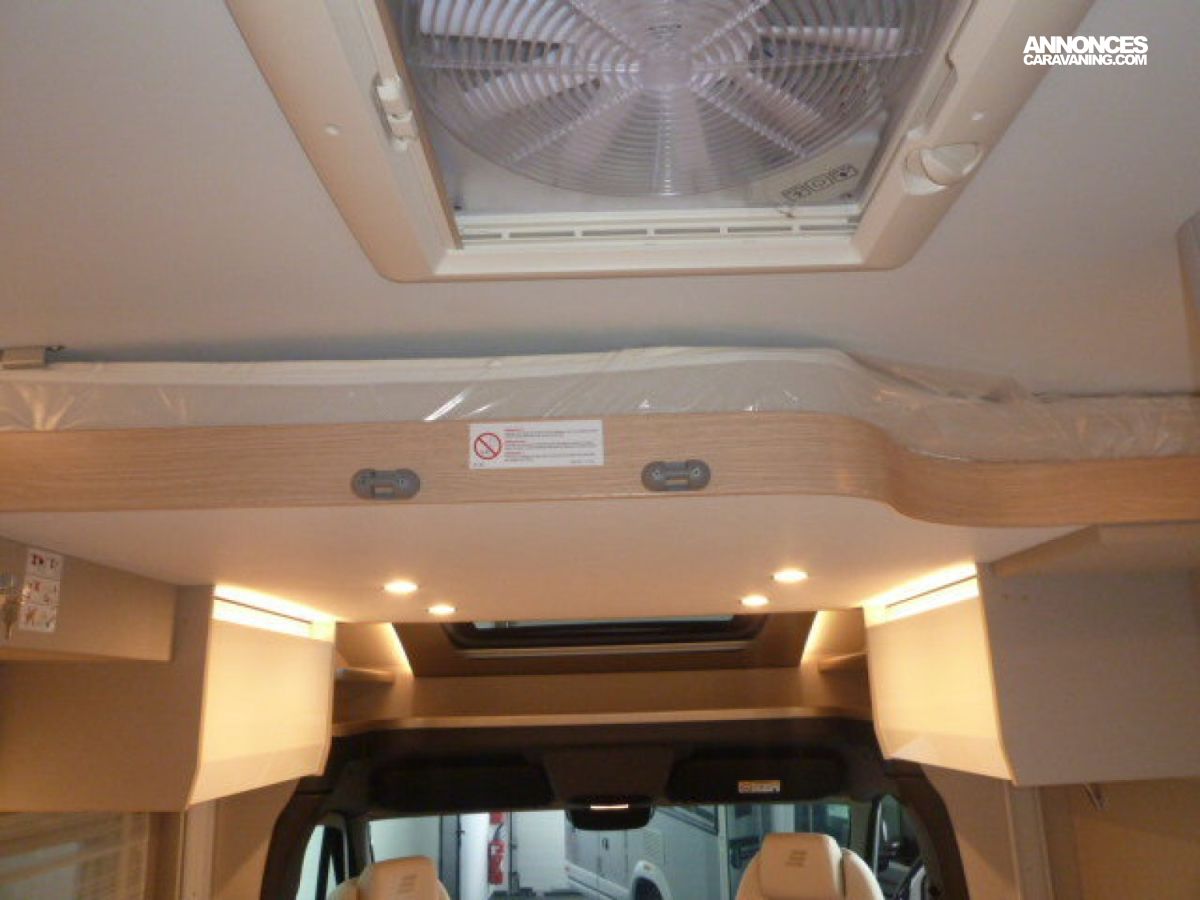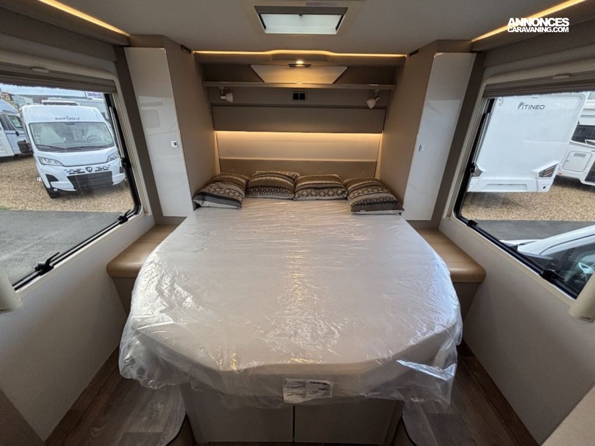 Cuisine en L, Douche indépendante, Lit central, lit pavillon, Salon avant banquettes face à face, Salon avant sièges pivotants, Soute, WC Cassette.