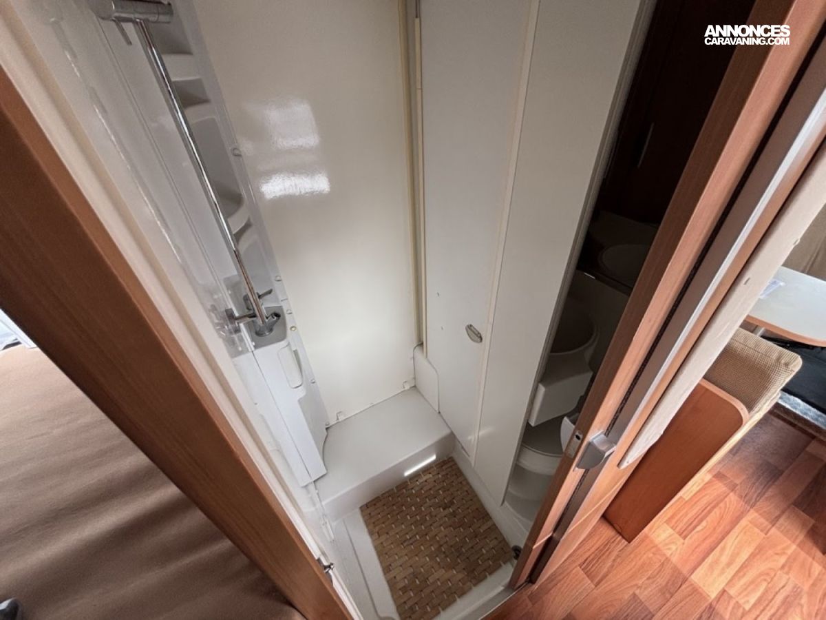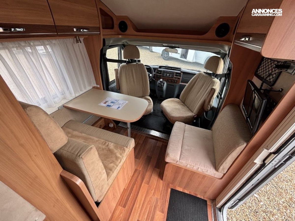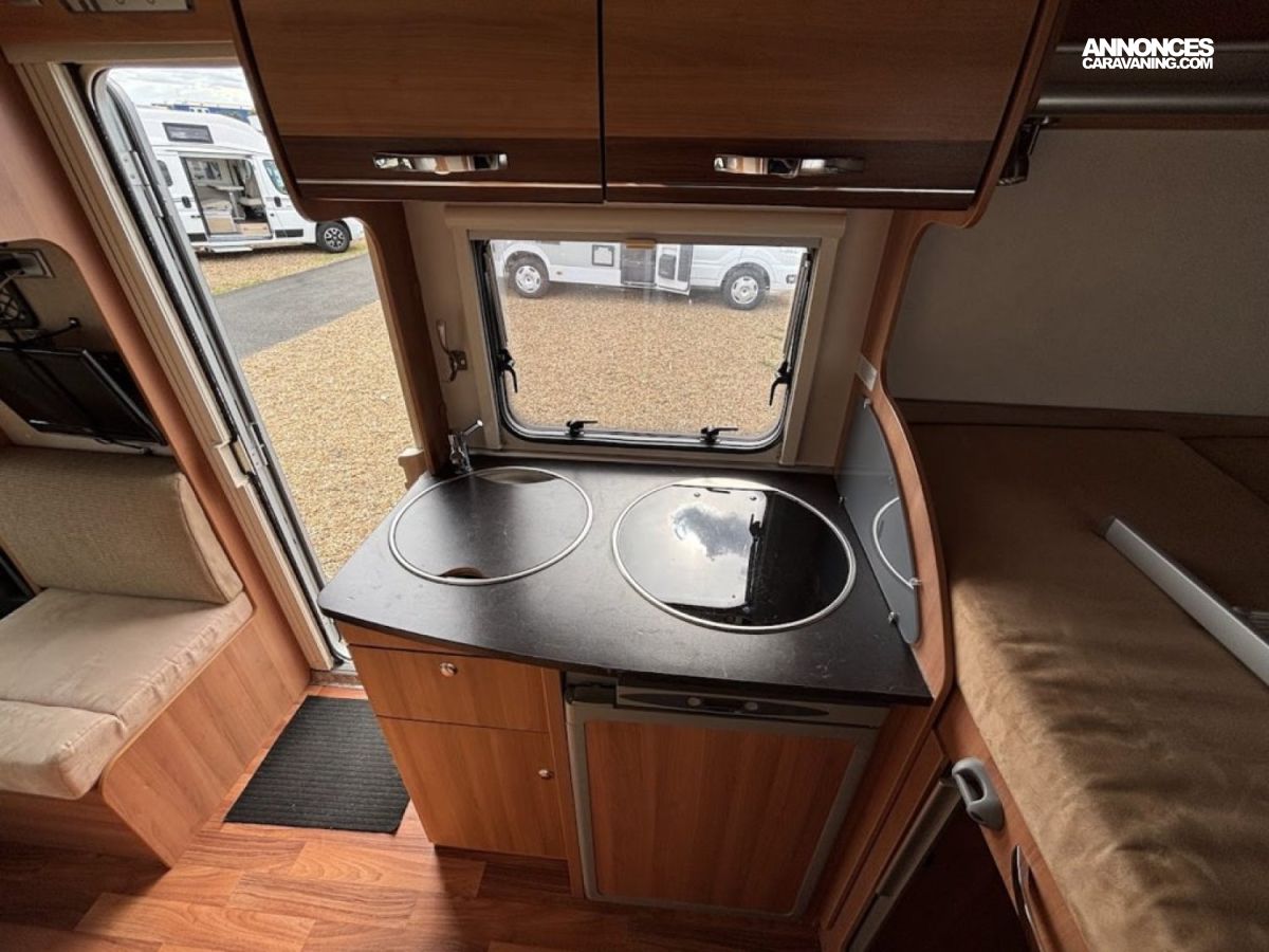 Cuisine en long, Douche à vario, Grande soute, Lit arrière transversal, Lit toit relevable, Salon avant sièges pivotants, WC Cassette.