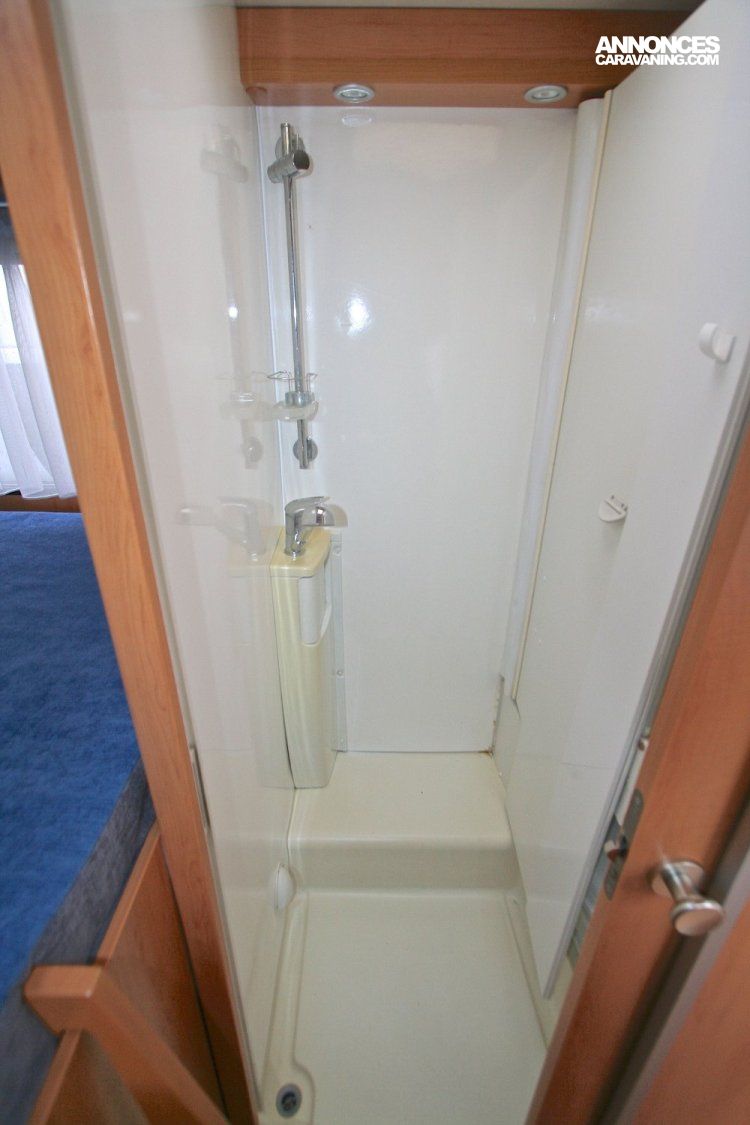 La belle salle de bain fait face à la cuisine et propose une douche, un lavabo et des w.c. cassette. Le lavabo est escamotable et permet de bénéficier d’une cabine de douche séparée.