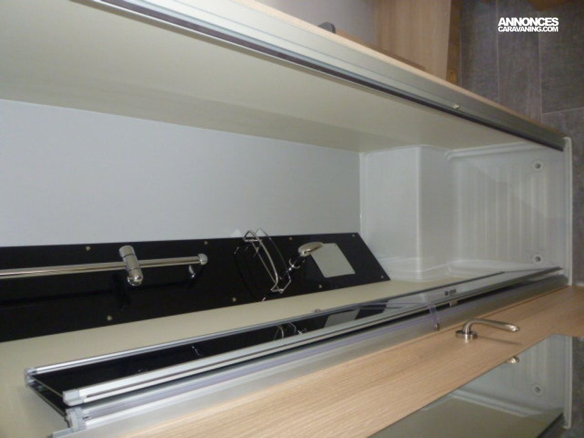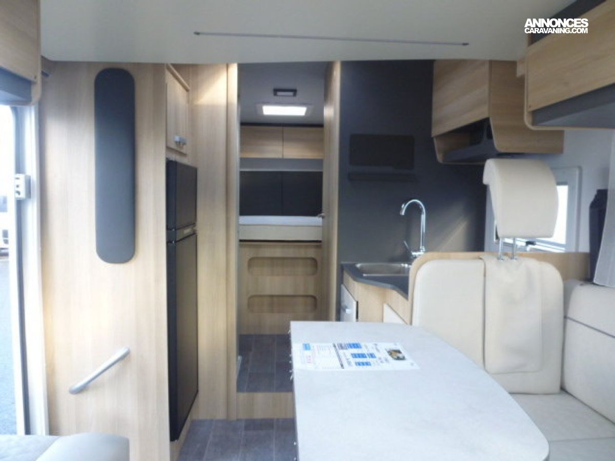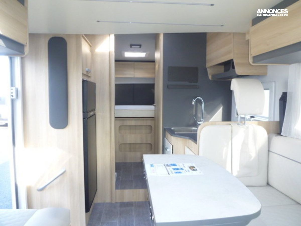 Cuisine en long, Douche indépendante, Lit central, lit pavillon, Salon avant banquettes face à face, Salon avant sièges pivotants, Soute, WC Cassette.