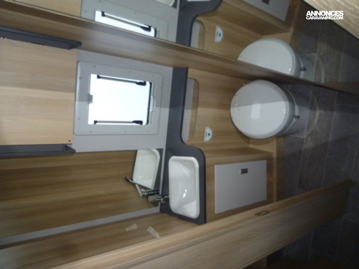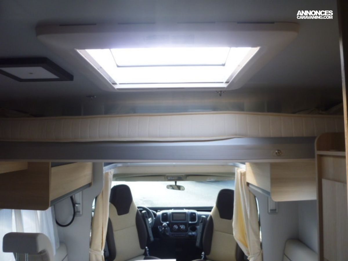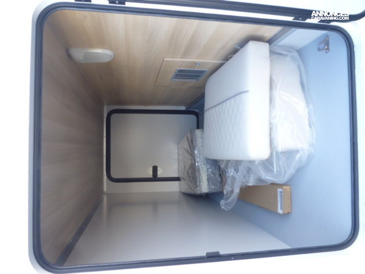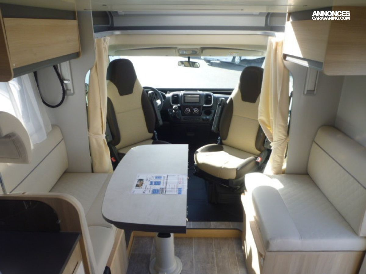 Cuisine en long, Douche indépendante, Lit central, lit pavillon, Salon avant banquettes face à face, Salon avant sièges pivotants, Soute, WC Cassette.