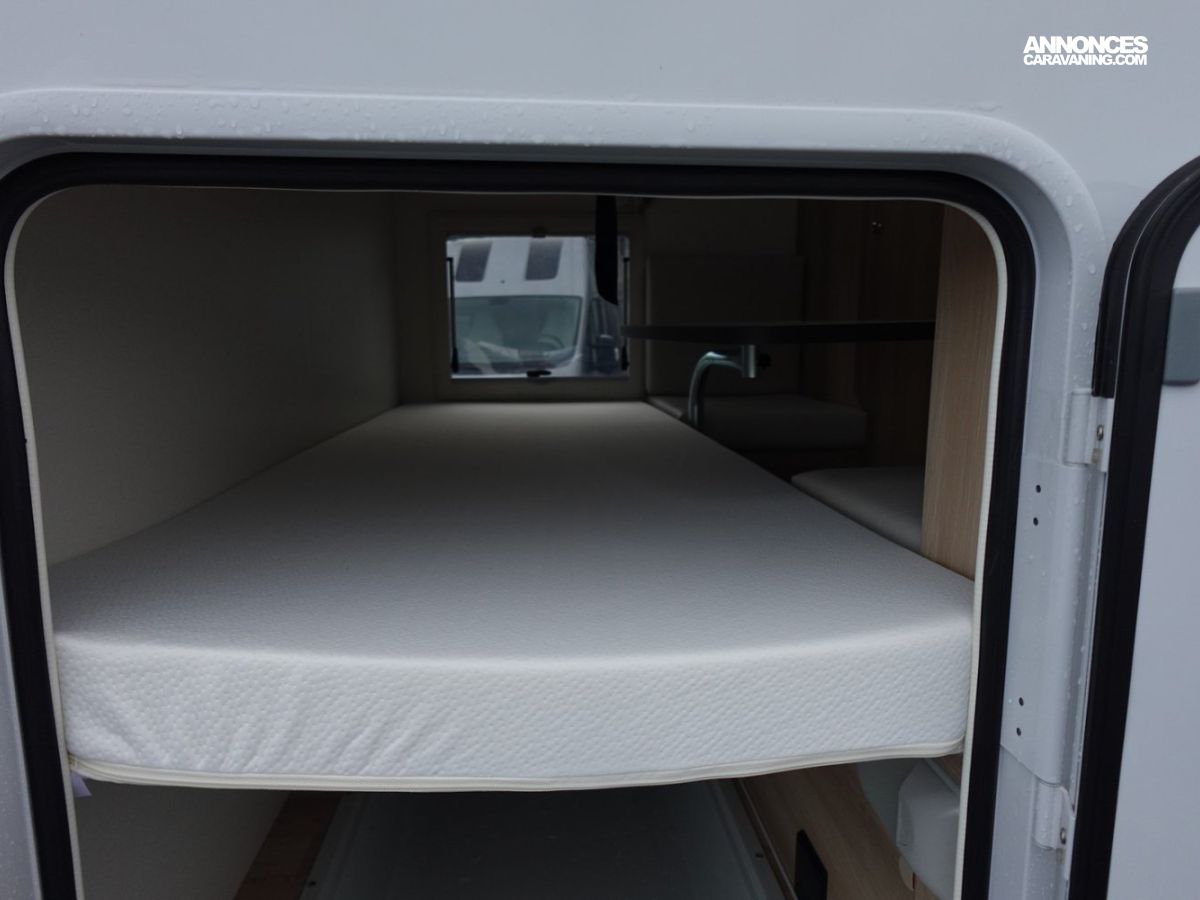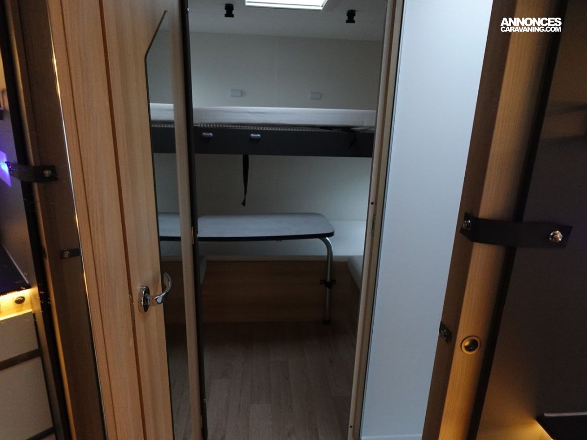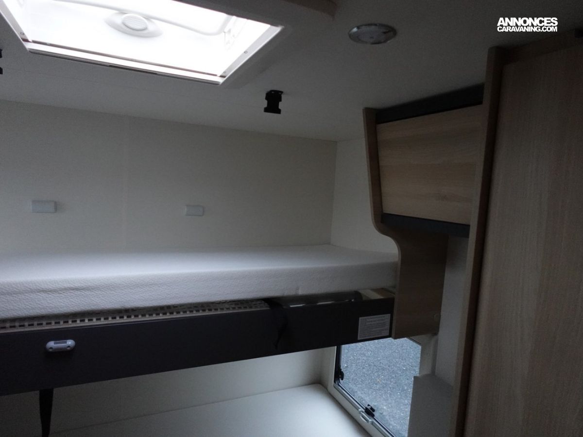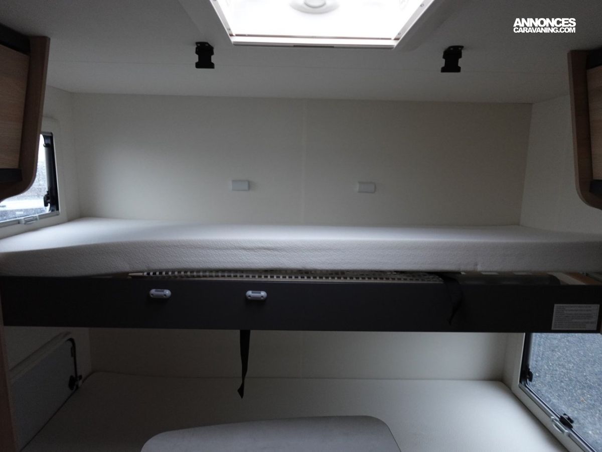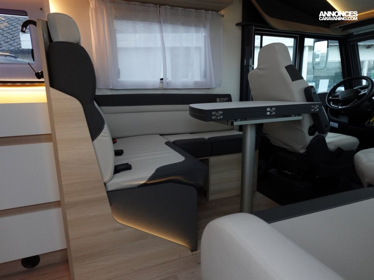 Intégral comprenant un salon avant panoramique, une douche indépendante de l’espace WC / lavabo, des lits superposés, un salon enfant transformable en couchage 1 personne, un lit de pavillon 2 places et une cuisine en L avec de nombreux rangements. Le tout en série limitée Spirit Edition