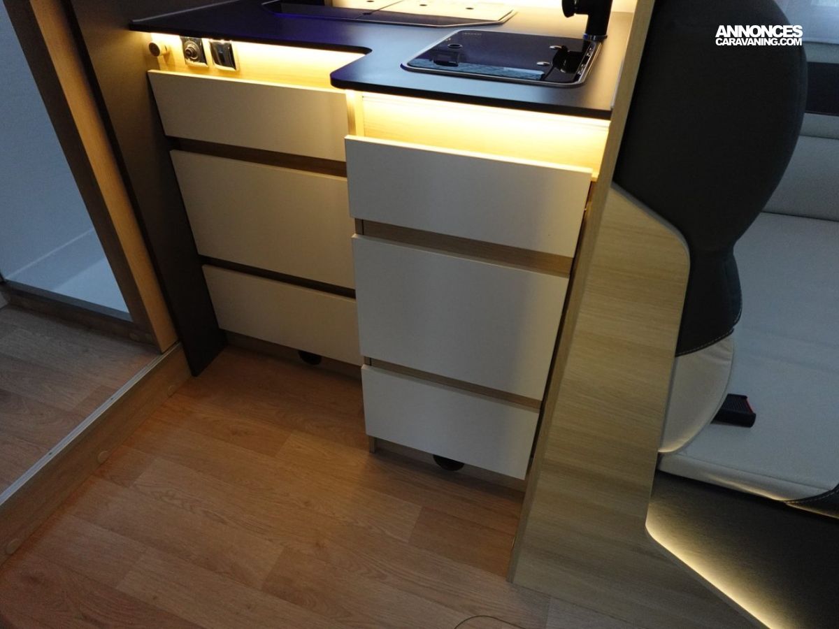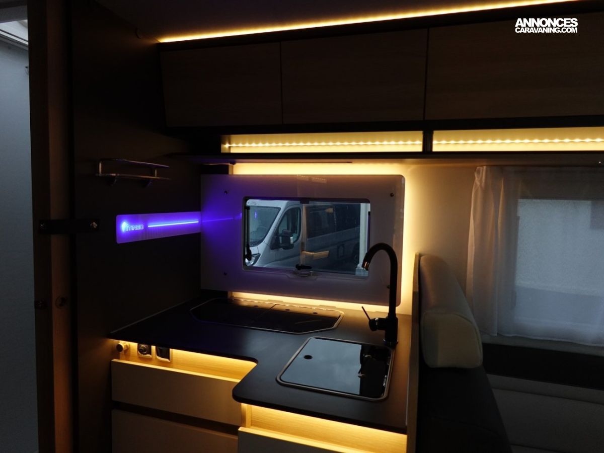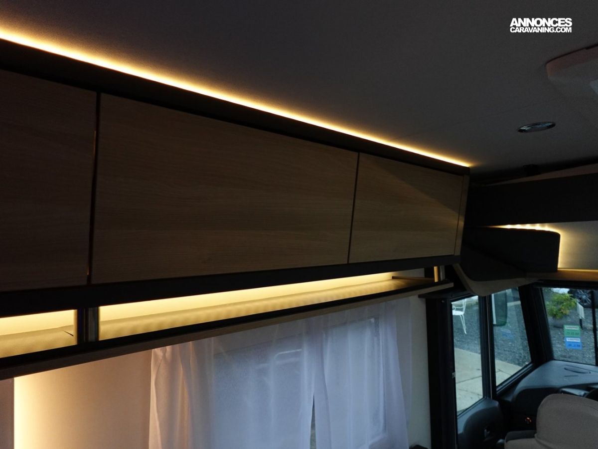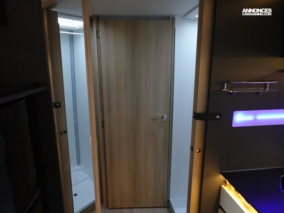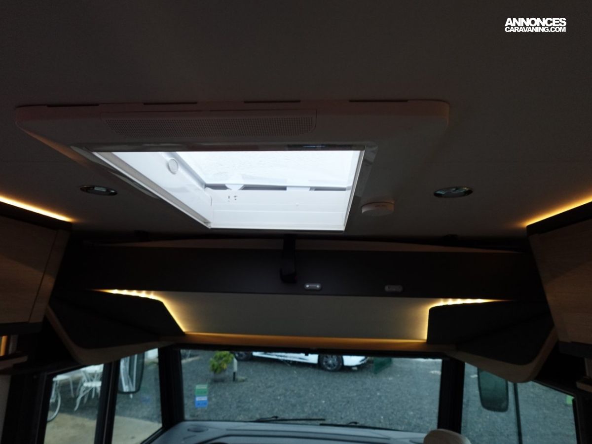 Intégral comprenant un salon avant panoramique, une douche indépendante de l’espace WC / lavabo, des lits superposés, un salon enfant transformable en couchage 1 personne, un lit de pavillon 2 places et une cuisine en L avec de nombreux rangements. Le tout en série limitée Spirit Edition